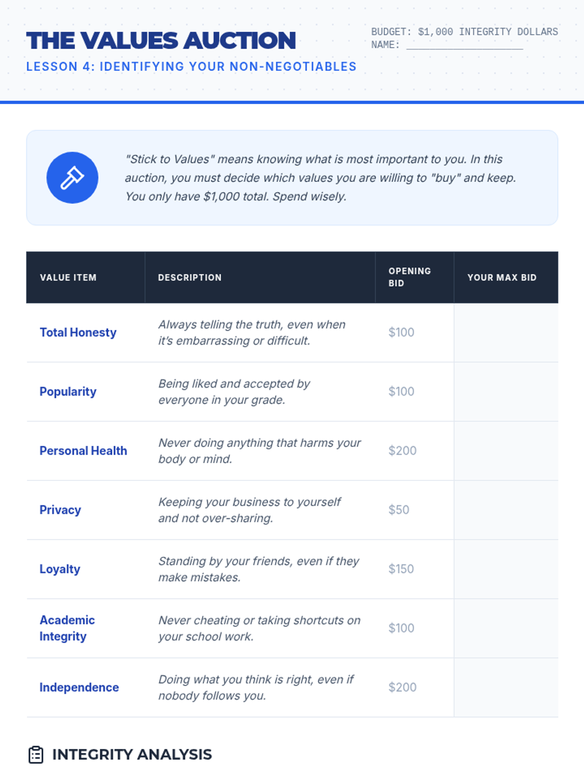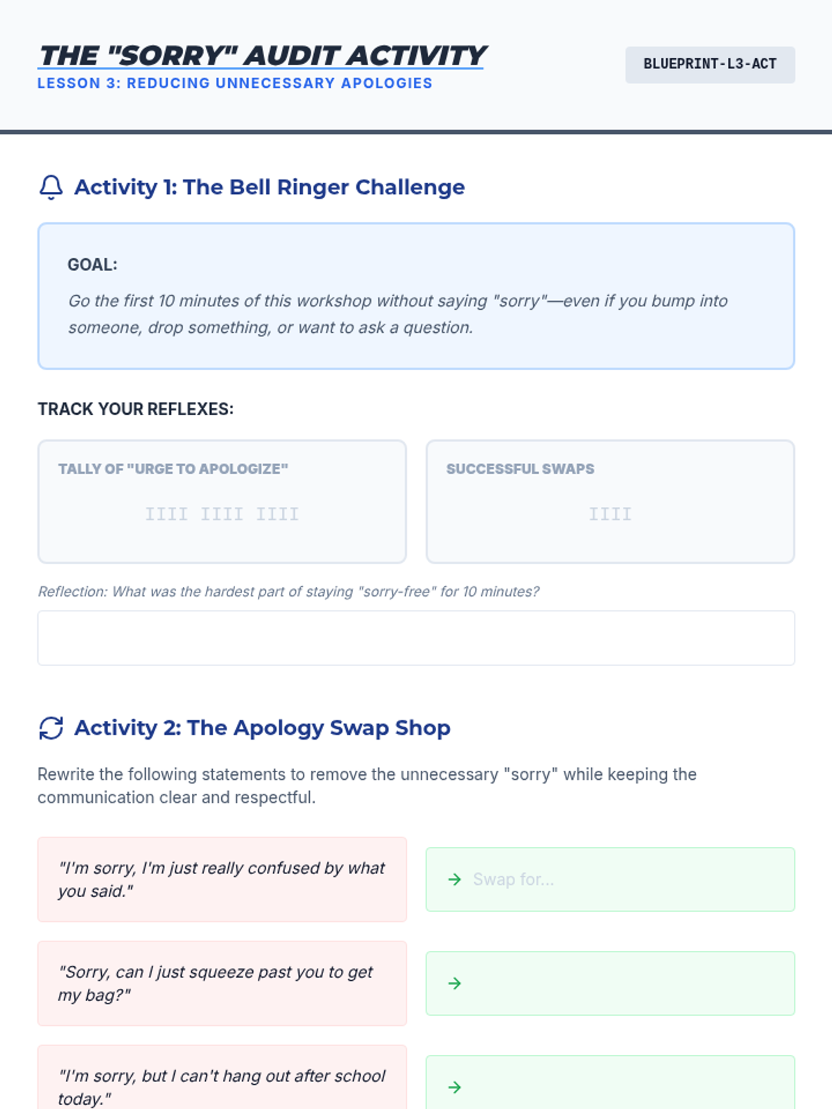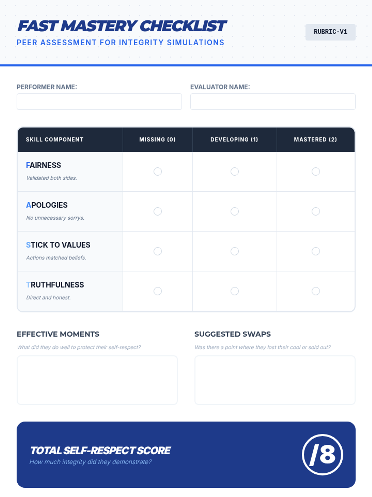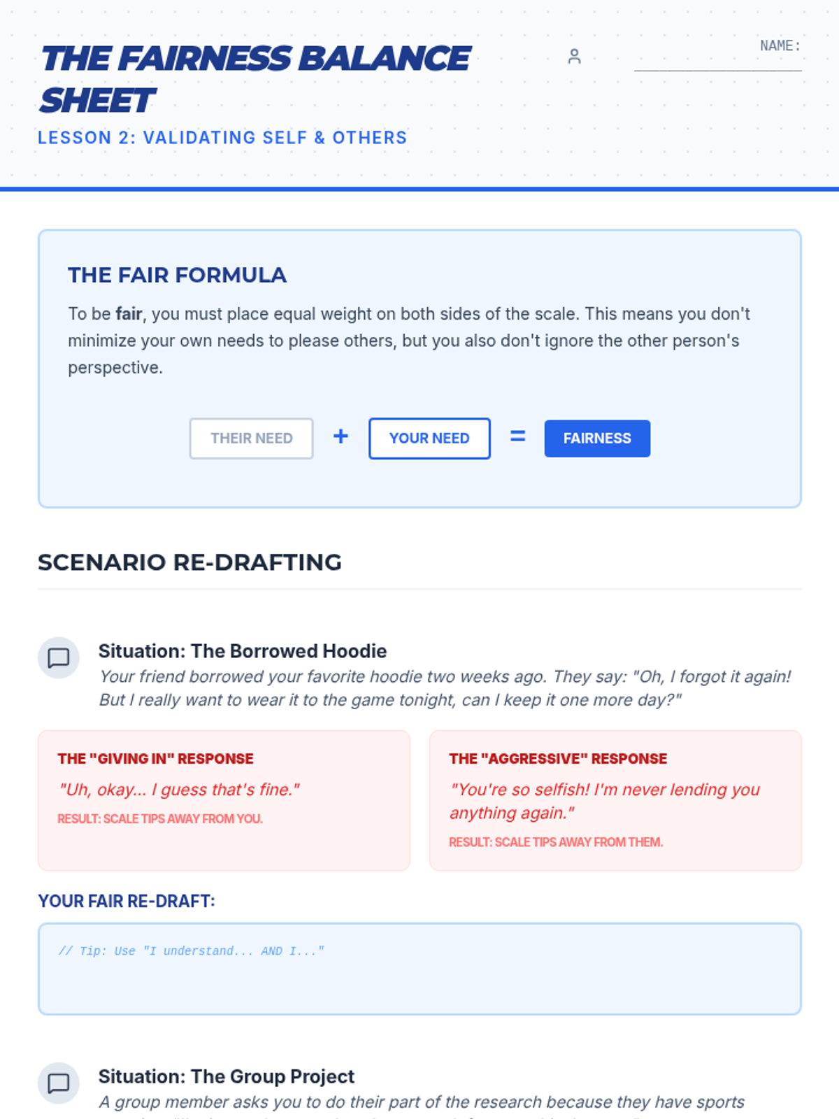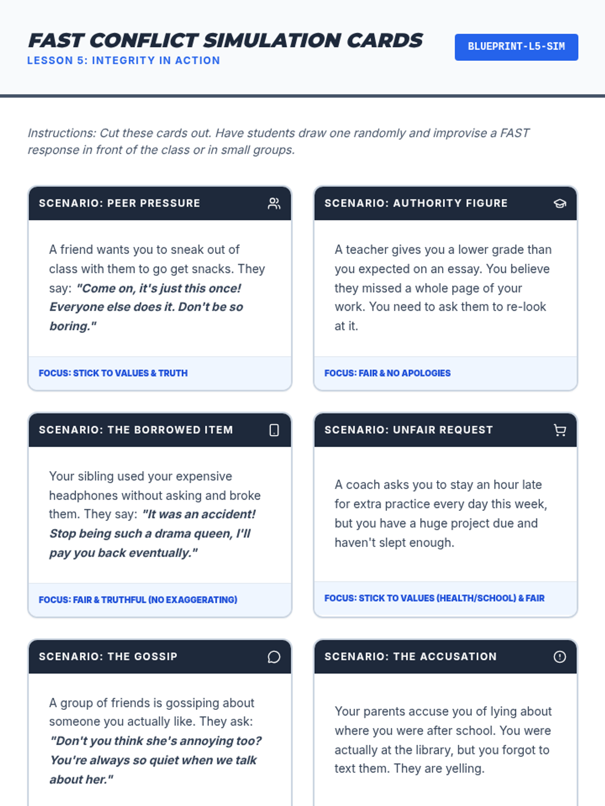 A comprehensive workshop-style sequence for 8th-grade students to master the DBT FAST framework for self-respect. Students move from defining self-respect to practical application through role-play, script-writing, and simulations.