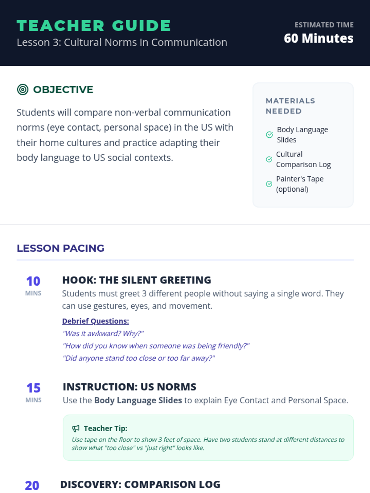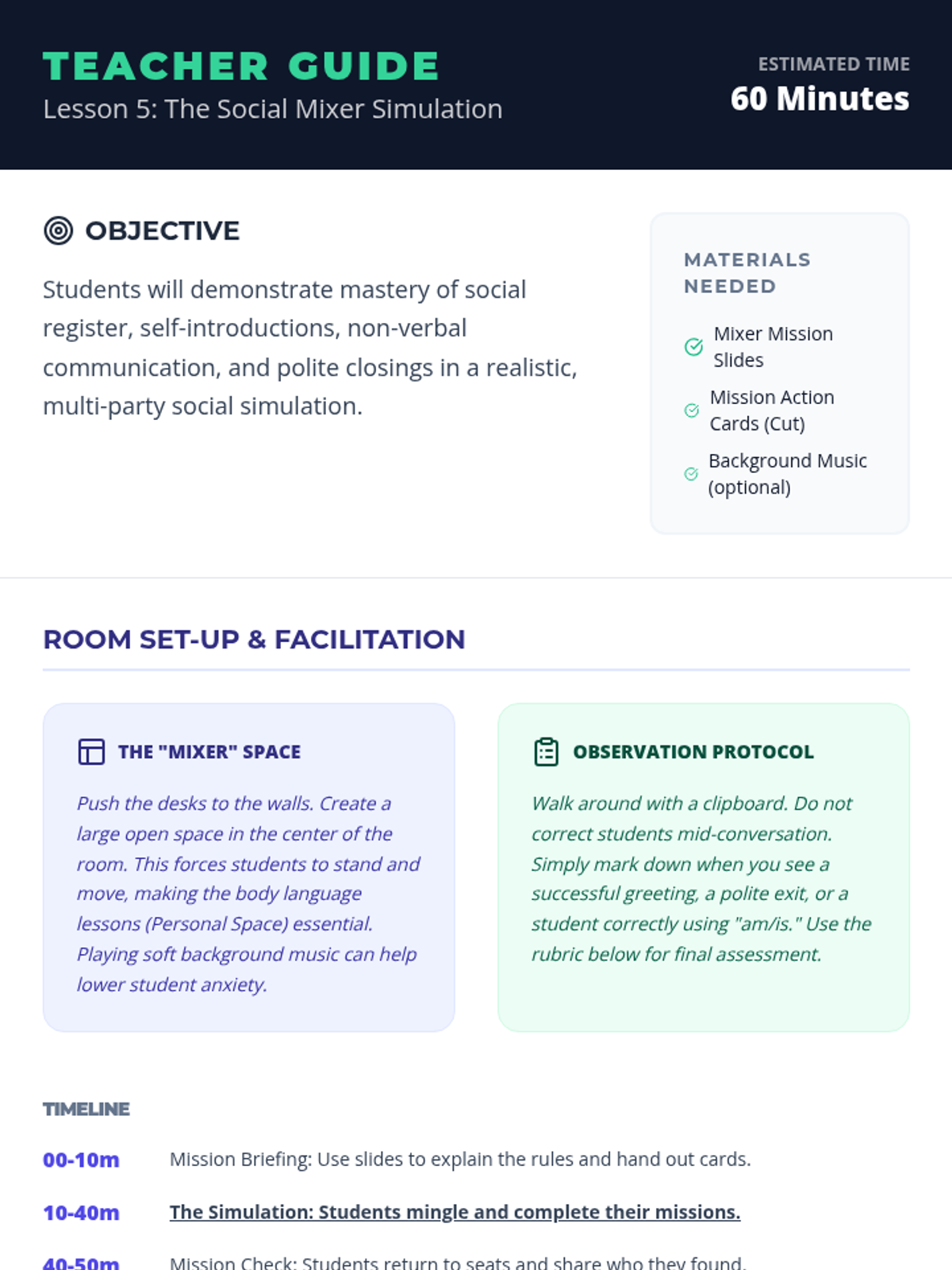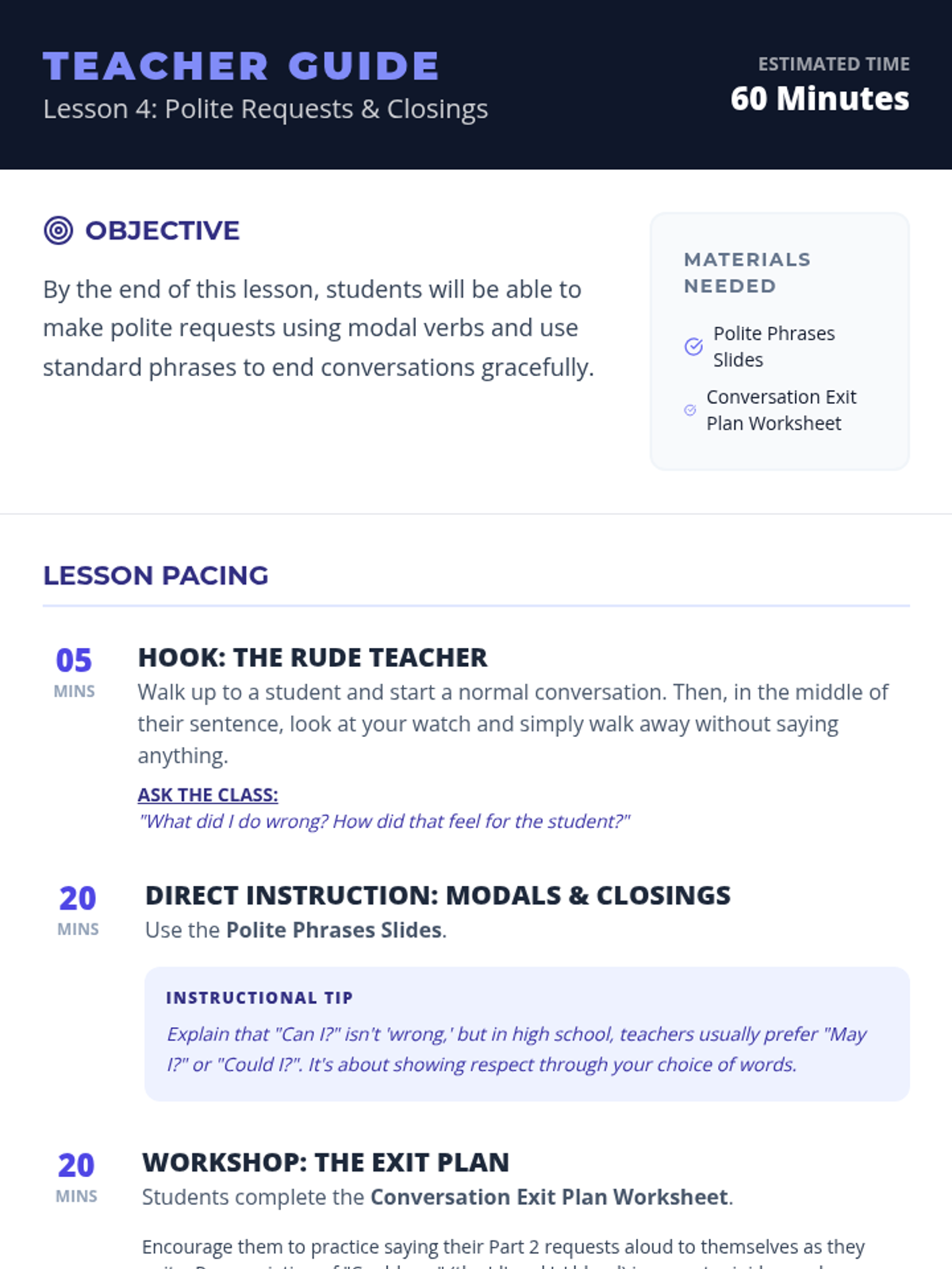 A comprehensive unit for high school English language learners to master the social nuances of greetings, self-introductions, and cultural etiquette in varied contexts.