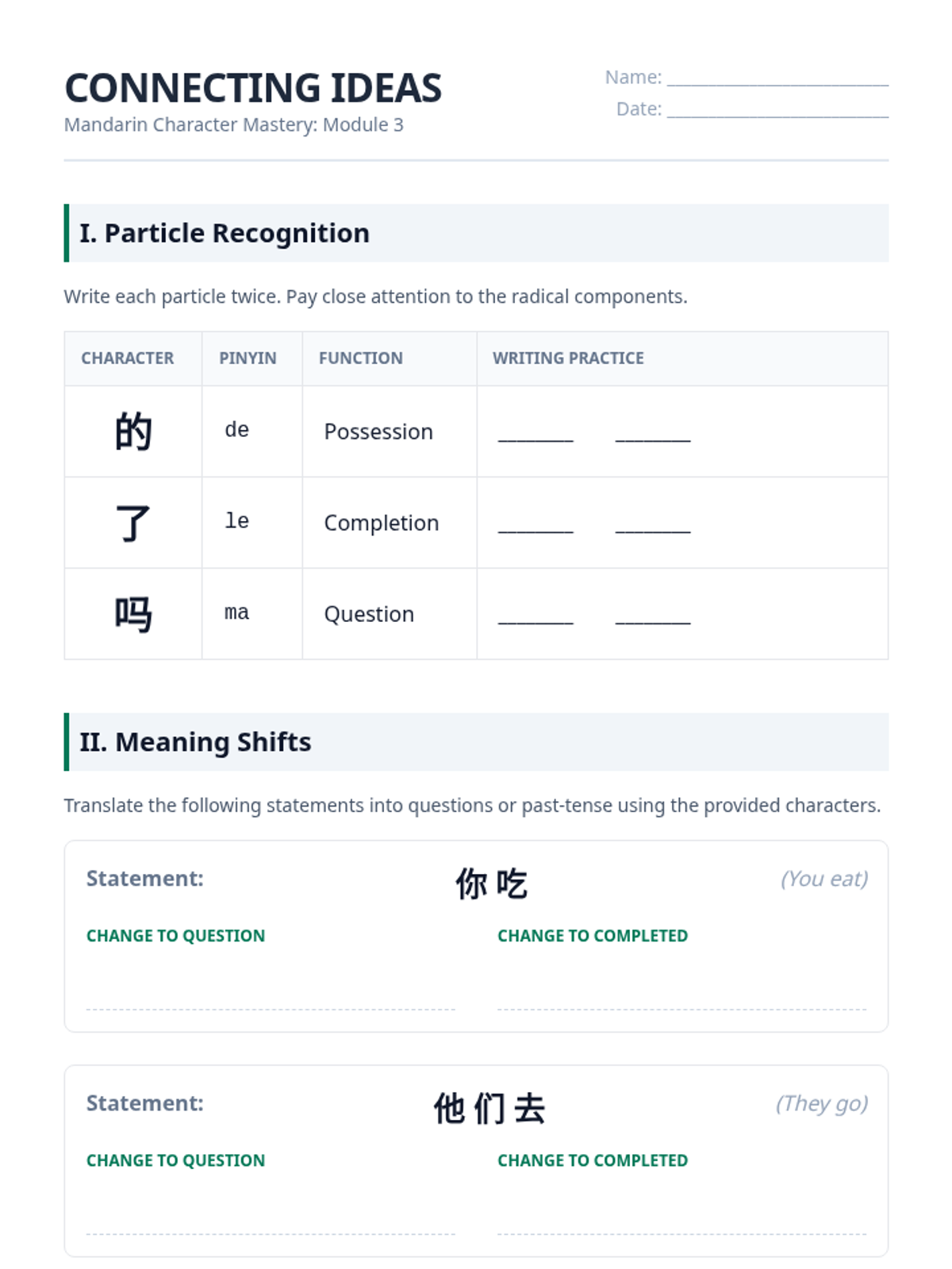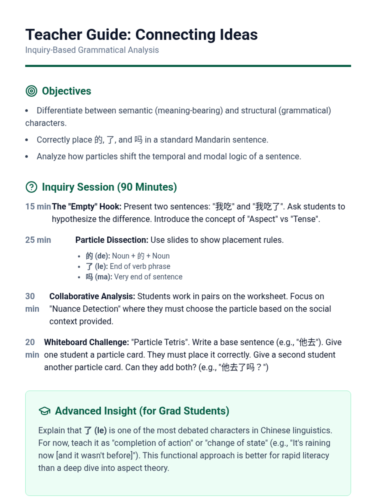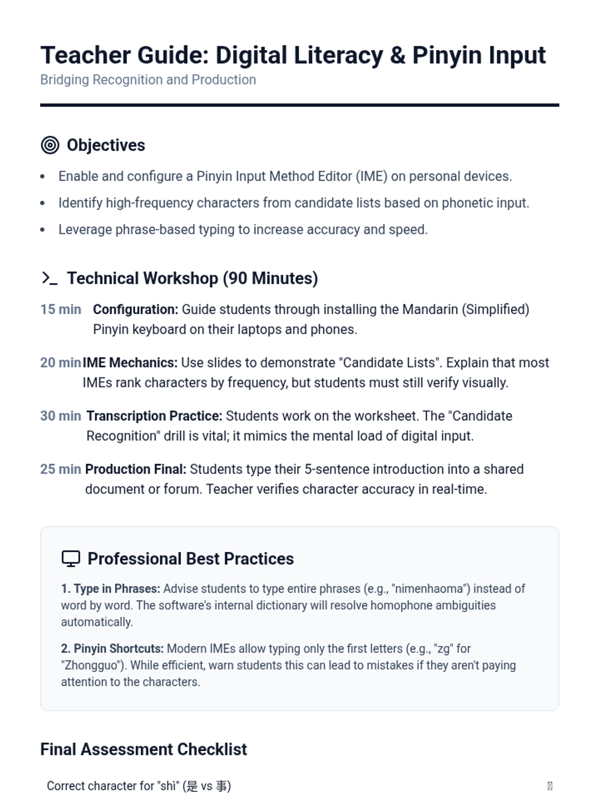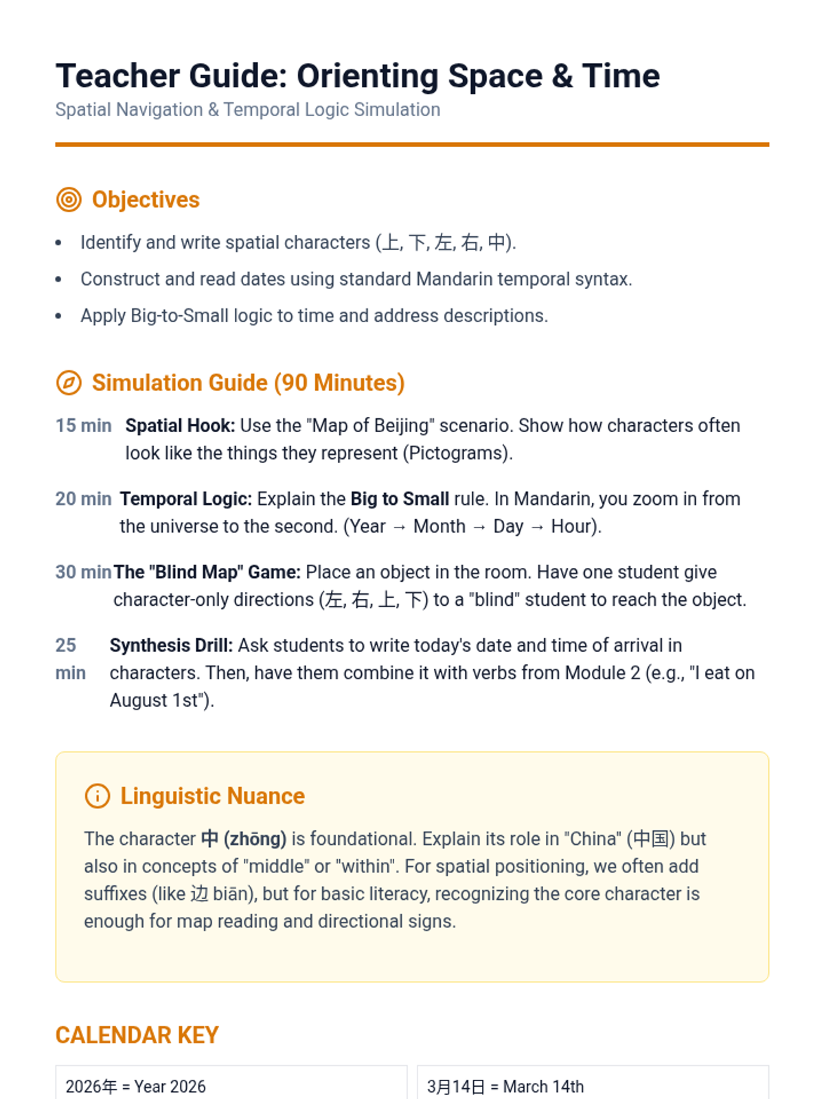 This sequence bridges the gap between classroom character learning and real-world application for graduate-level learners. By analyzing authentic artifacts like signage, menus, and business cards, students develop the 'environmental literacy' needed to navigate Mandarin-speaking urban and professional spaces.