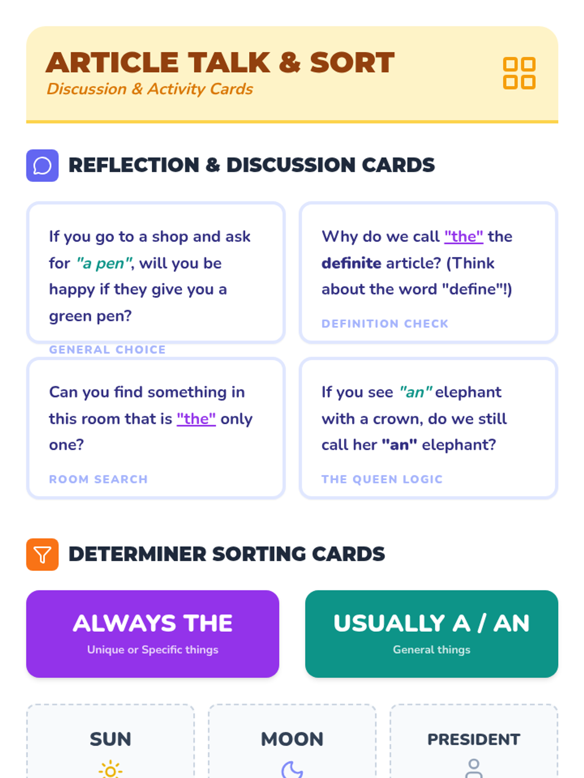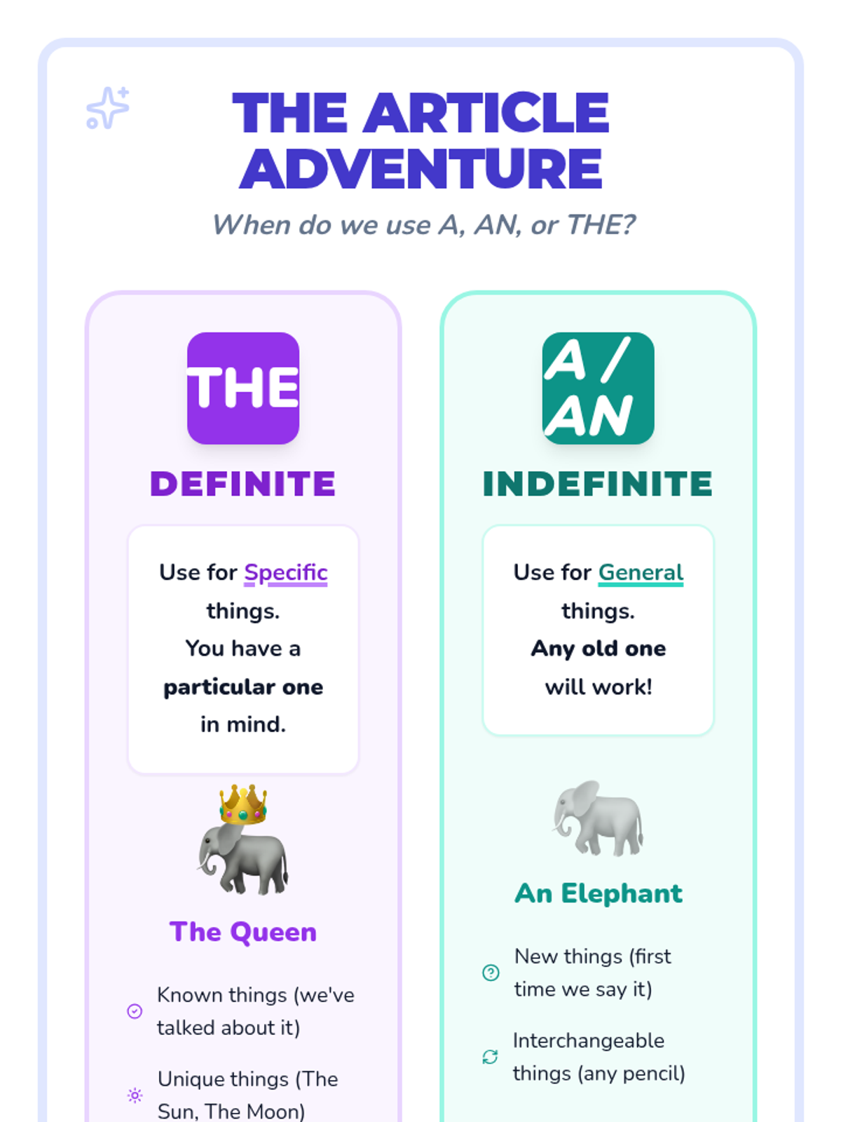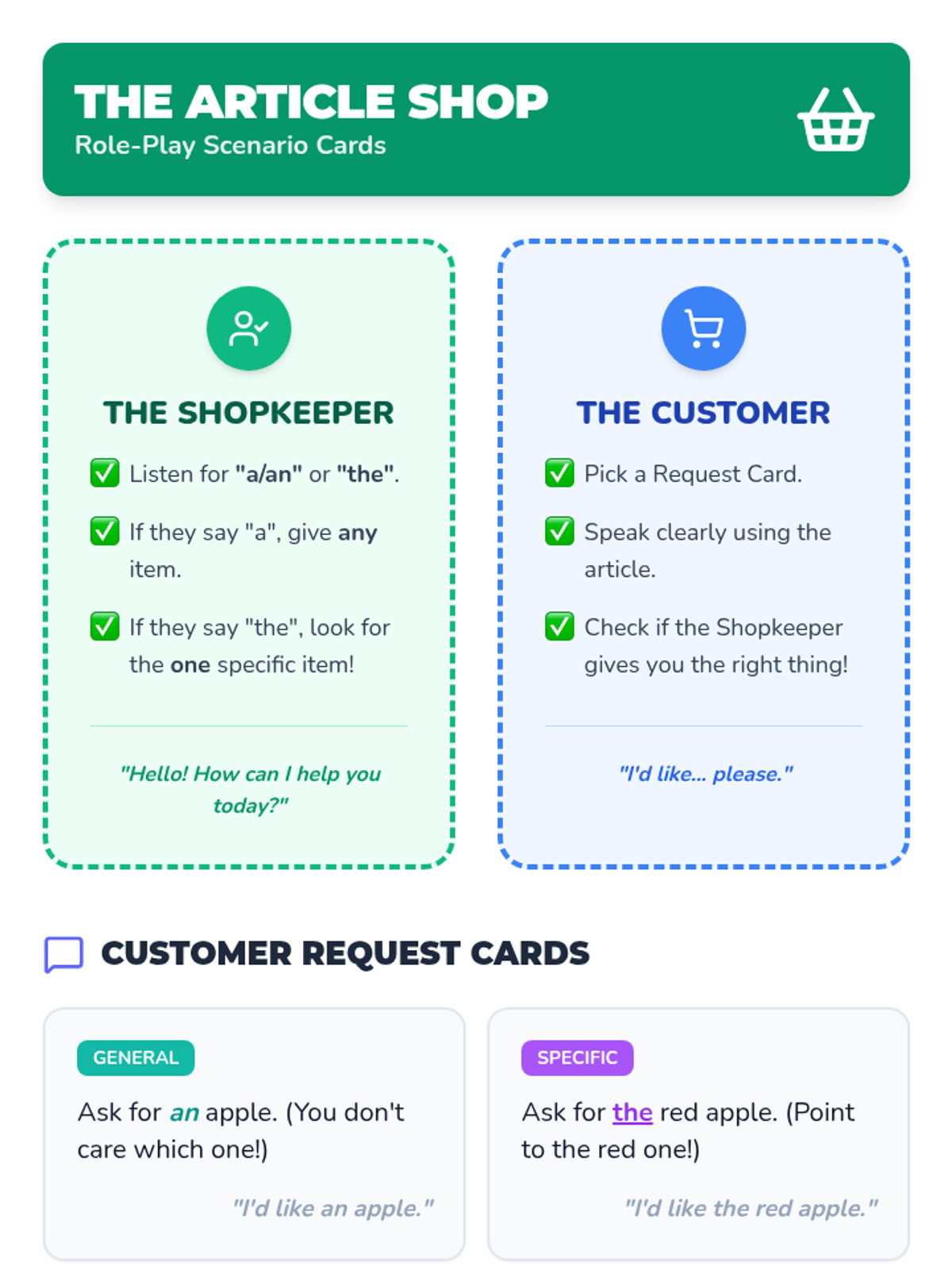 A foundational grammar sequence for English Language Learners focusing on the use of definite and indefinite articles through visual storytelling and interactive games.