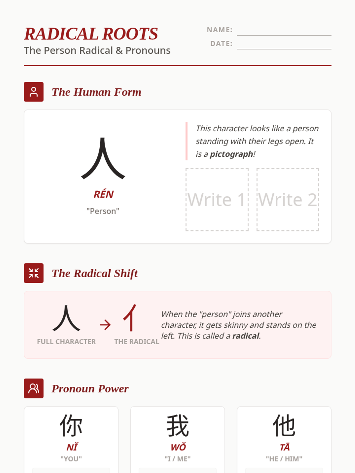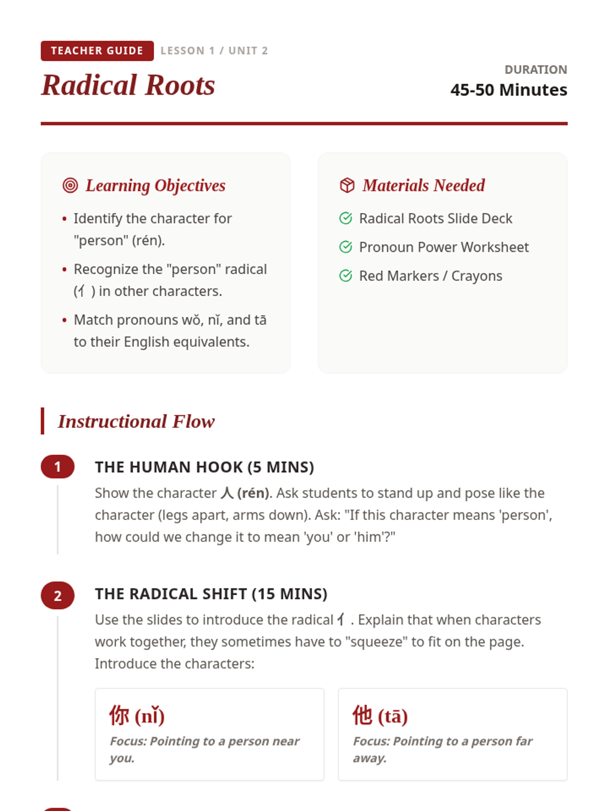 A 5-lesson sequence for 3rd graders exploring Mandarin Chinese characters through the lens of family and identity. Students learn to recognize the 'Person' and 'Female' radicals, master sibling hierarchy terminology, and understand the cultural stories behind compound characters.