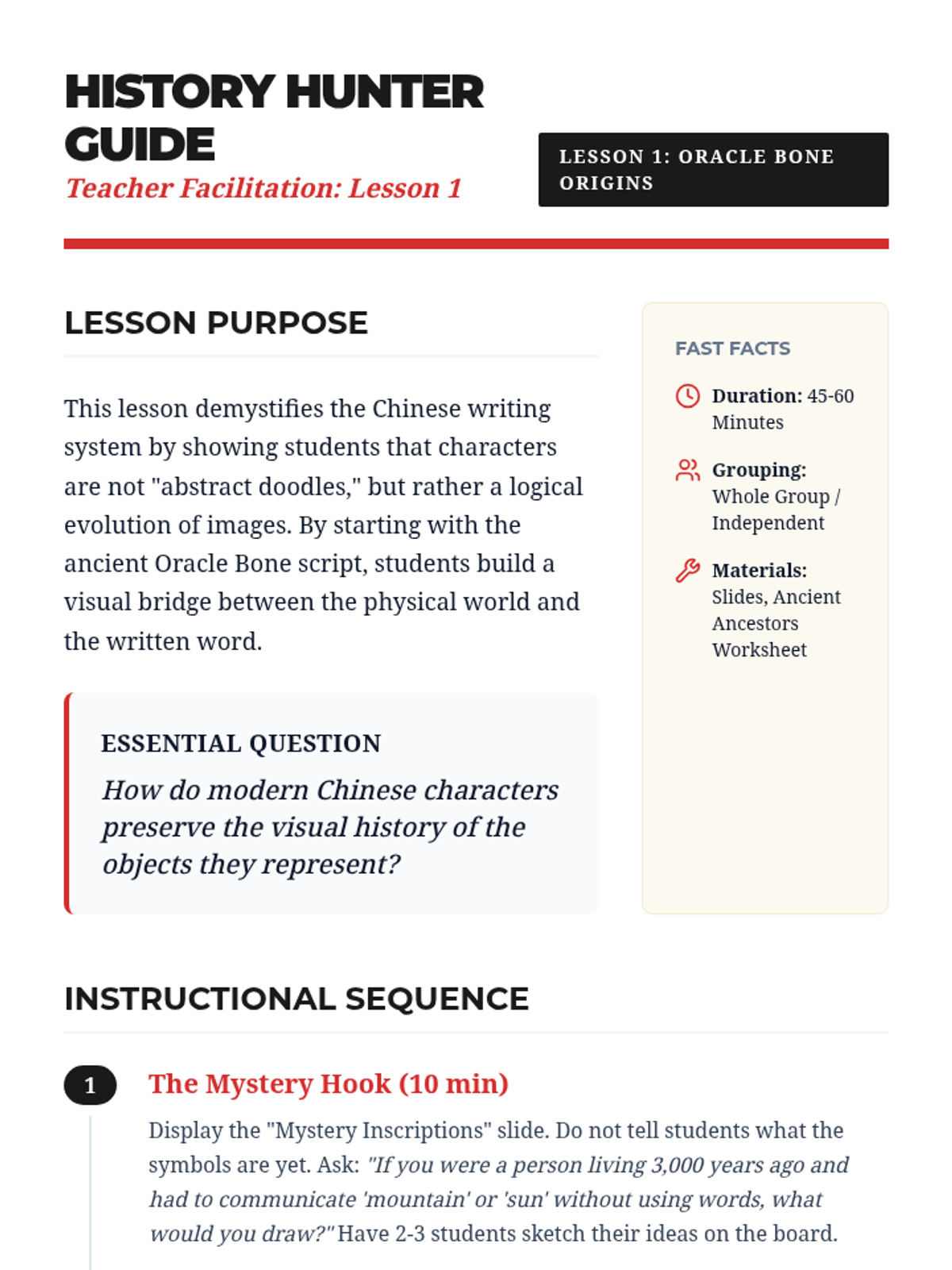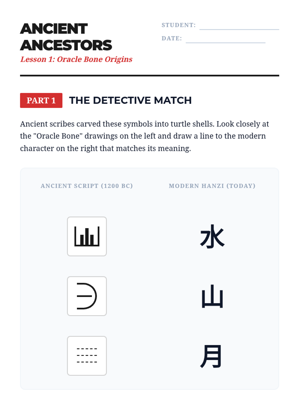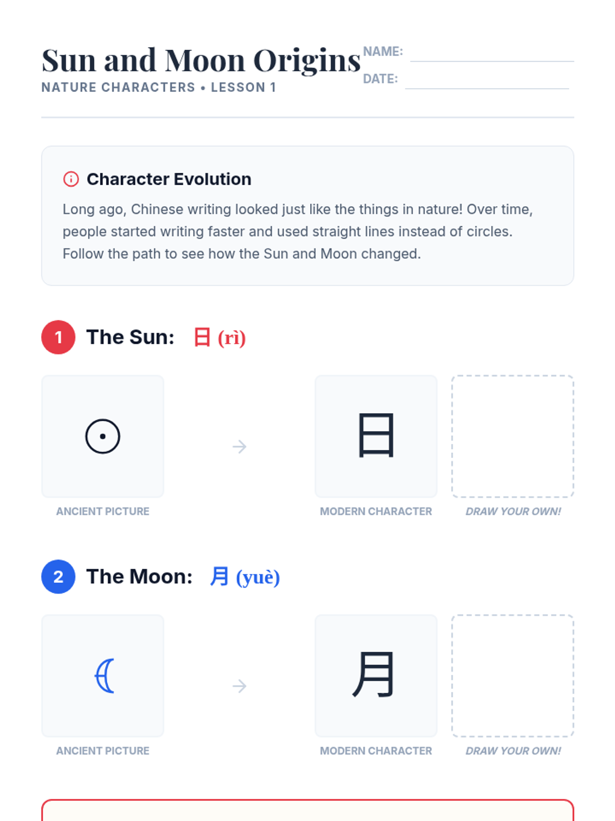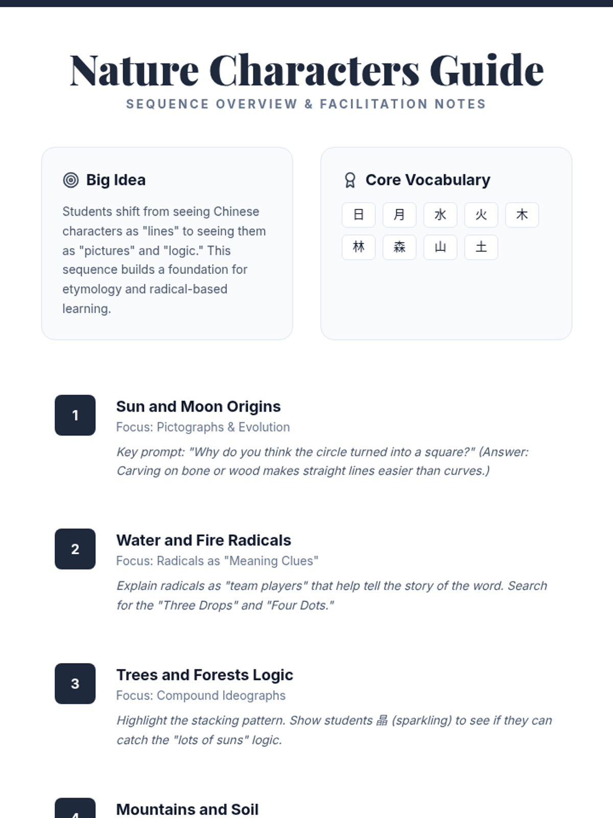 Students explore the historical evolution of Chinese characters from ancient pictures to modern forms. This inquiry-based sequence focuses on high-frequency nouns related to nature (sun, moon, water, mountain, fire) through the lens of visual archaeology.