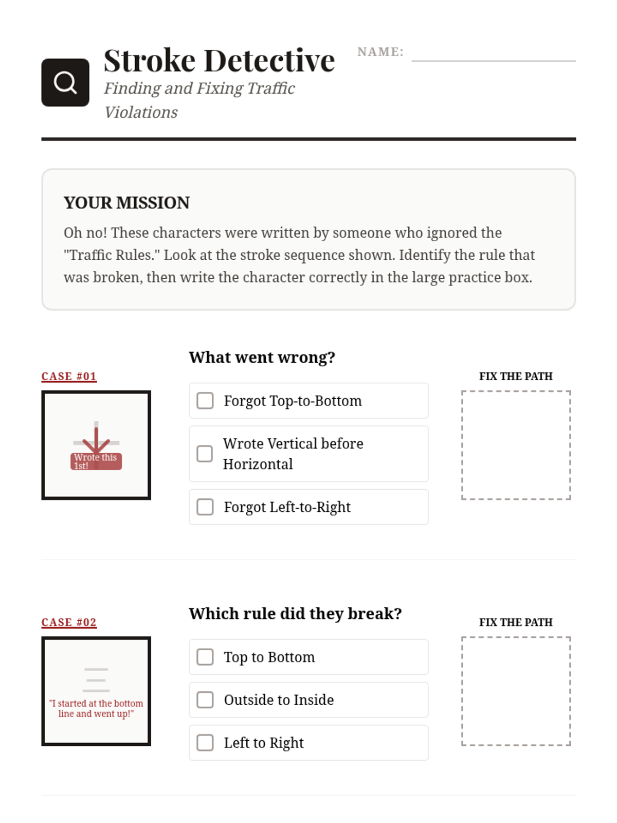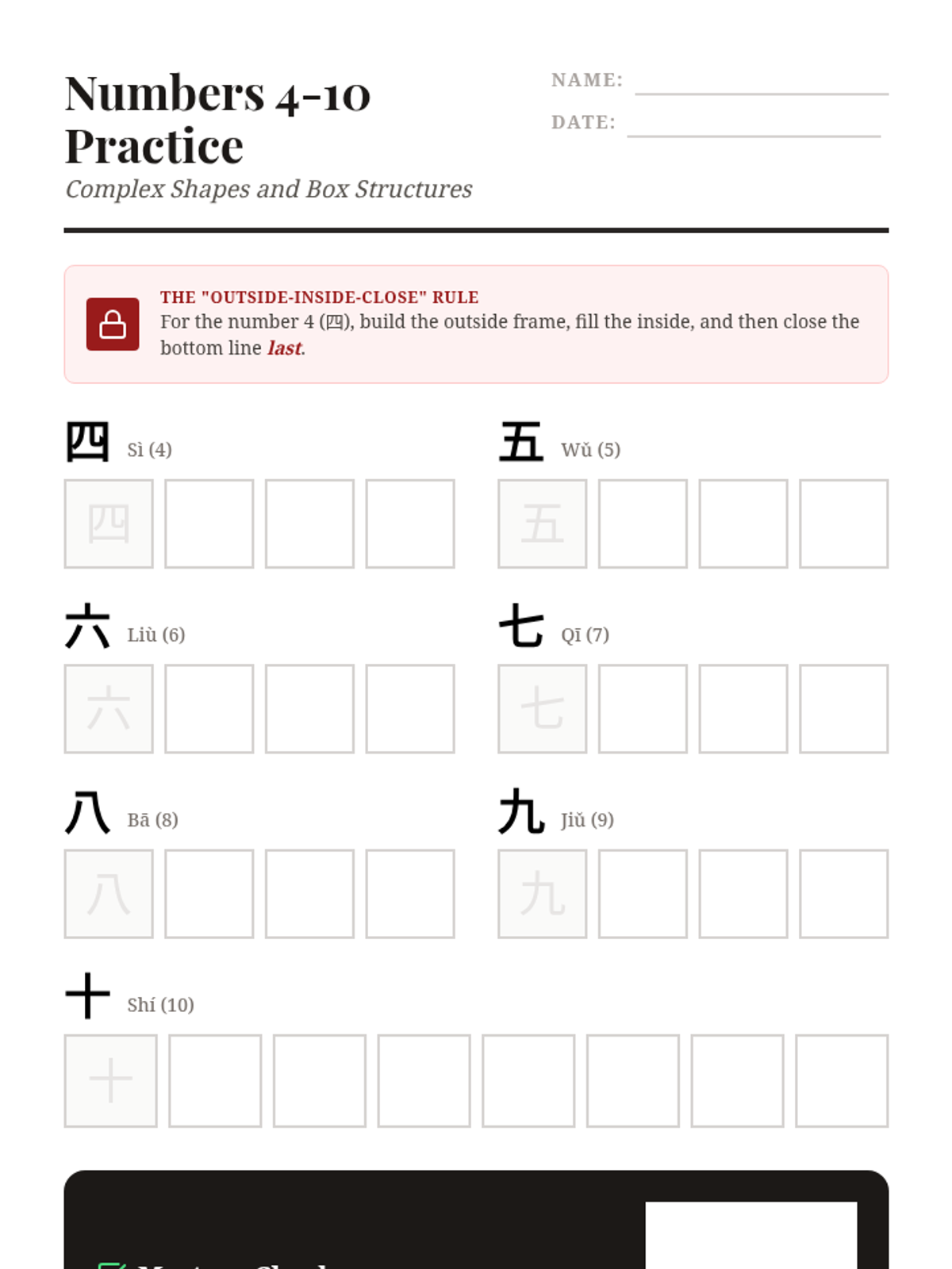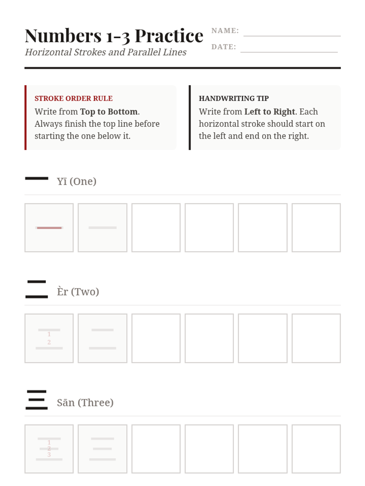 A comprehensive introduction to the foundational mechanics of Chinese calligraphy, focusing on the six basic strokes, the seven rules of stroke order, and numerical characters 1-10. Students develop fine motor skills and cultural appreciation through grid-based practice and traditional calligraphy techniques.