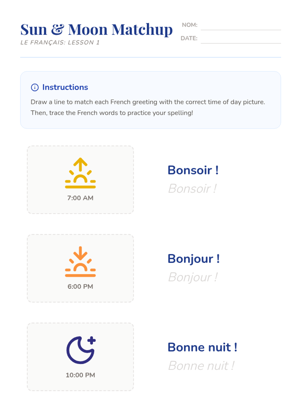 Students begin their French language journey by mastering the fundamental mechanics of greetings and introductions. Through interactive role-playing and choral repetition, learners practice distinct greetings for different times of day and social contexts. The sequence progresses from single-word utterances to complete sentences for stating one's name and asking others for theirs. By the end, students will confidently navigate a basic introduction dialogue with peers using appropriate pronunciation.