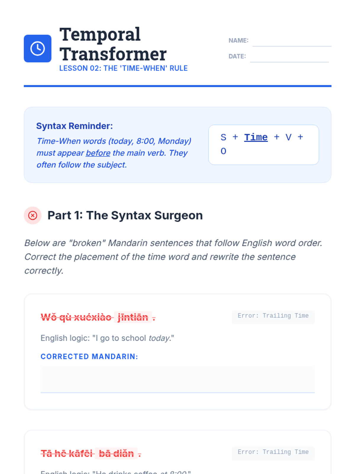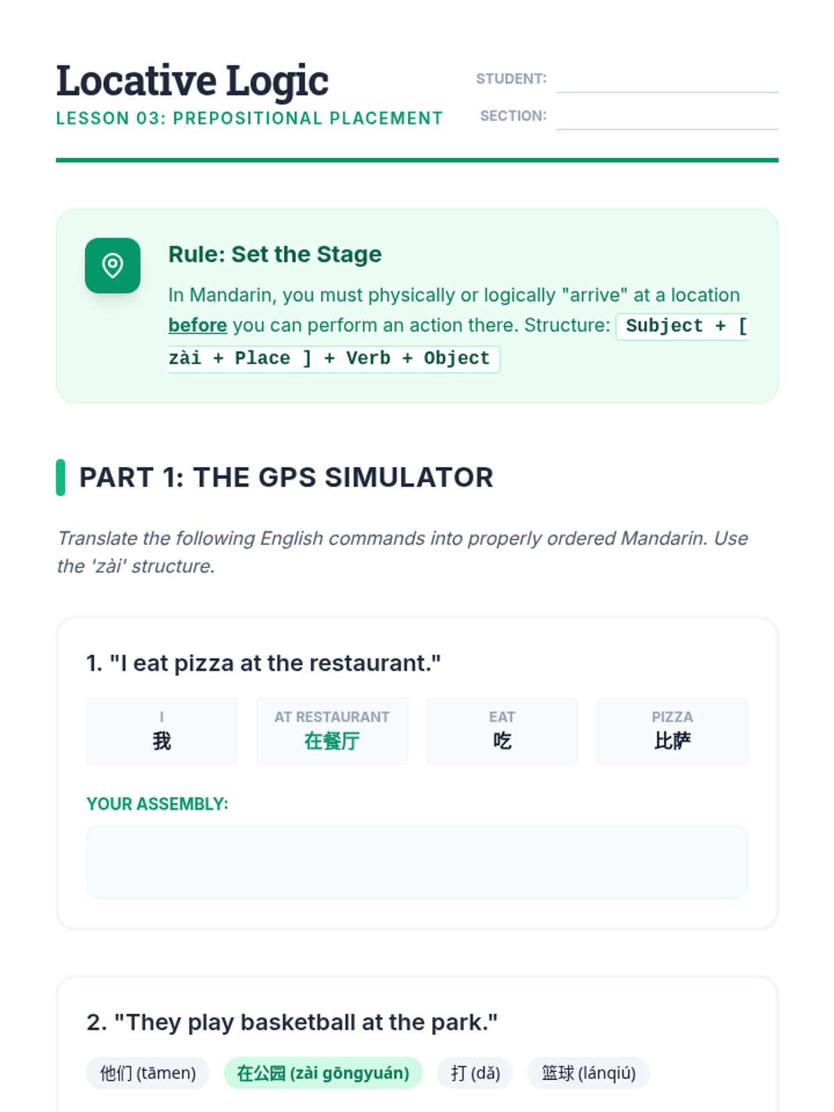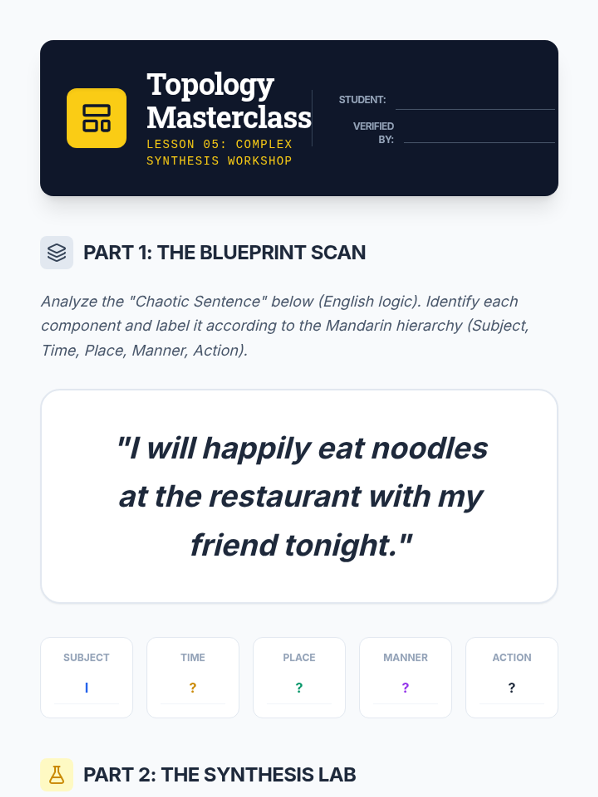 A comprehensive sequence for undergraduate students focusing on the rigid word order and sentence topology of Mandarin Chinese. Students progress from simple SVO structures to complex sentences involving time, location, and topic-comment shifts.