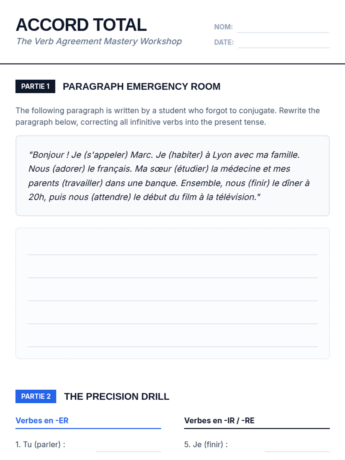 A comprehensive writing sequence for undergraduate beginners, focusing on moving from basic subject-verb agreement to complex paragraph construction in French. Students master syntax, negation, adjective placement, and logical connectors to produce a professional personal profile.