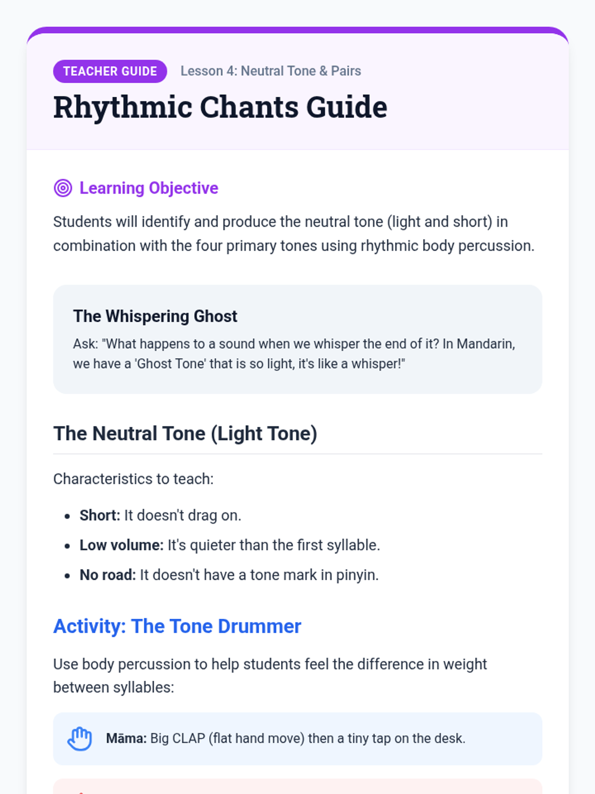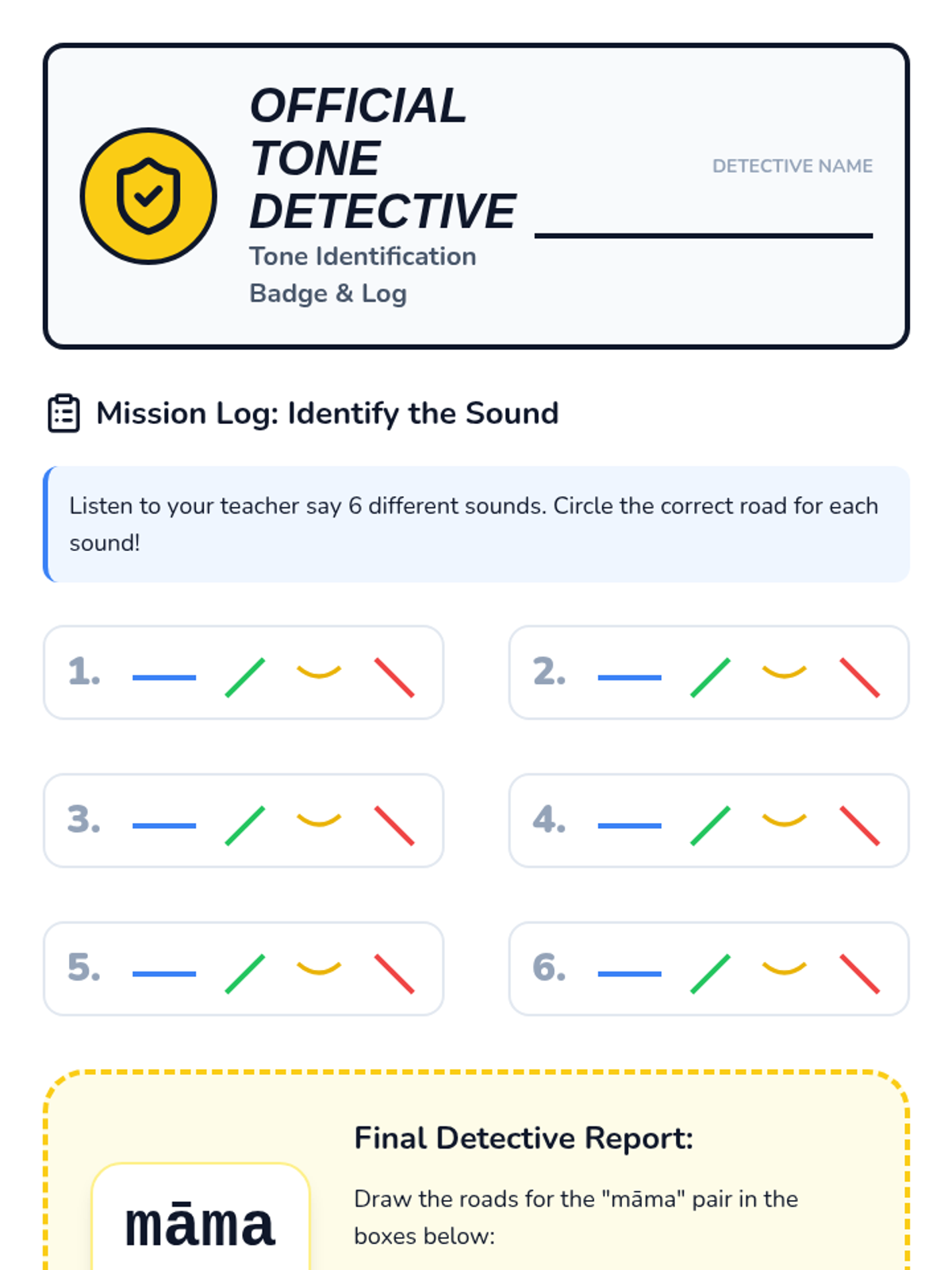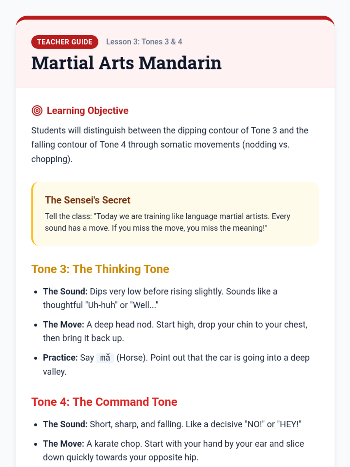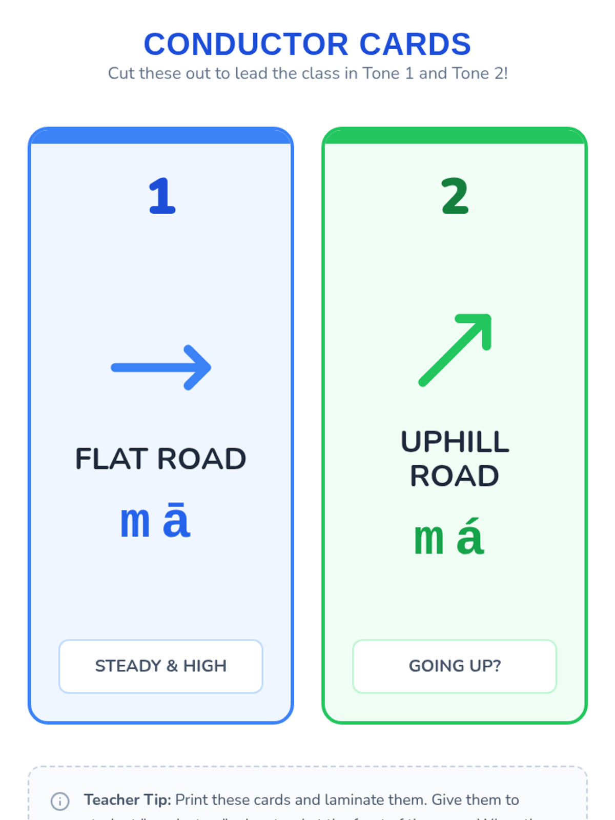 A somatic, movement-based introduction to the four Mandarin tones and the neutral tone for first-grade students. Using visual analogies like cars on roads and physical gestures like karate chops, students learn to identify and produce the tonal contours essential for Mandarin Chinese.