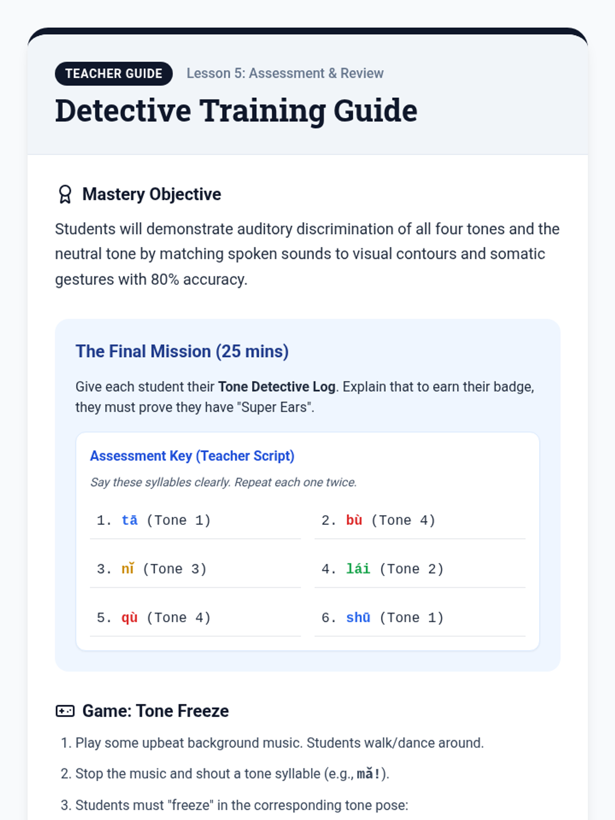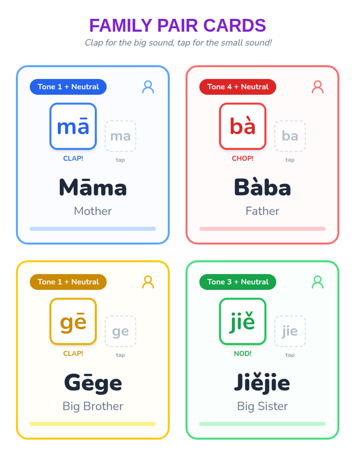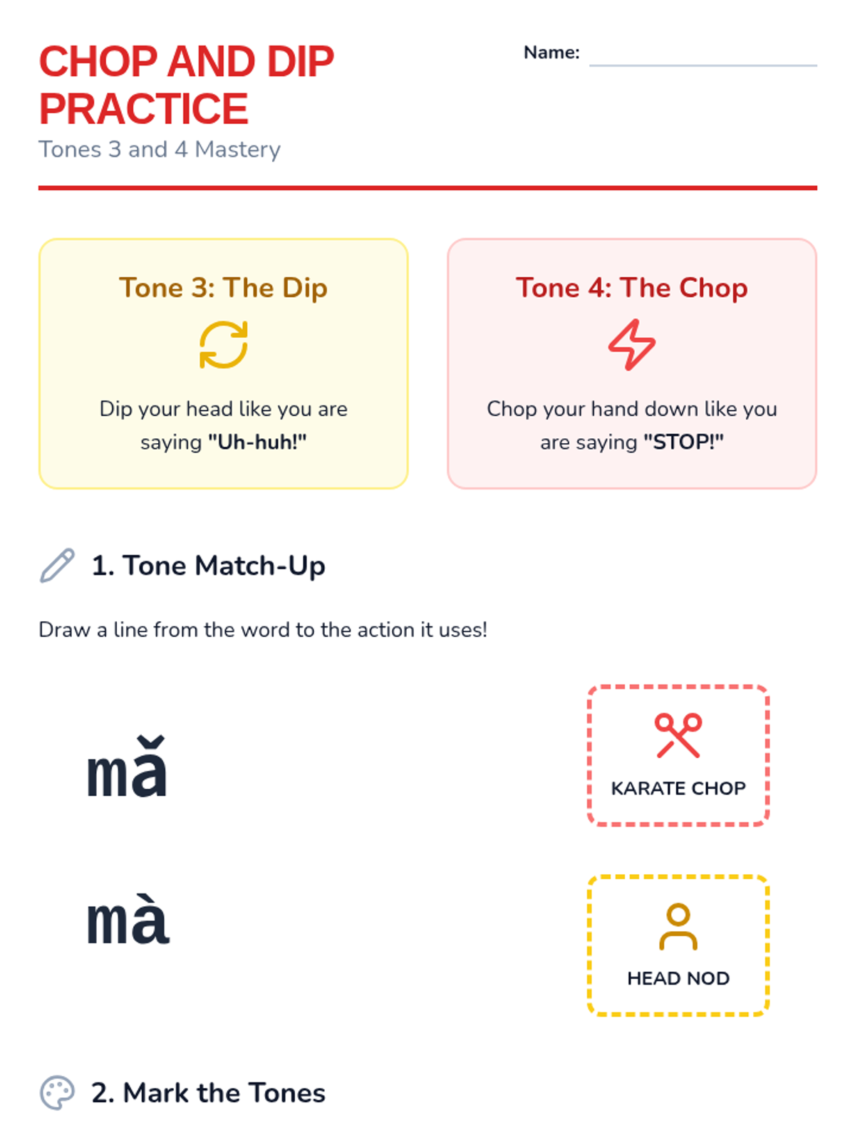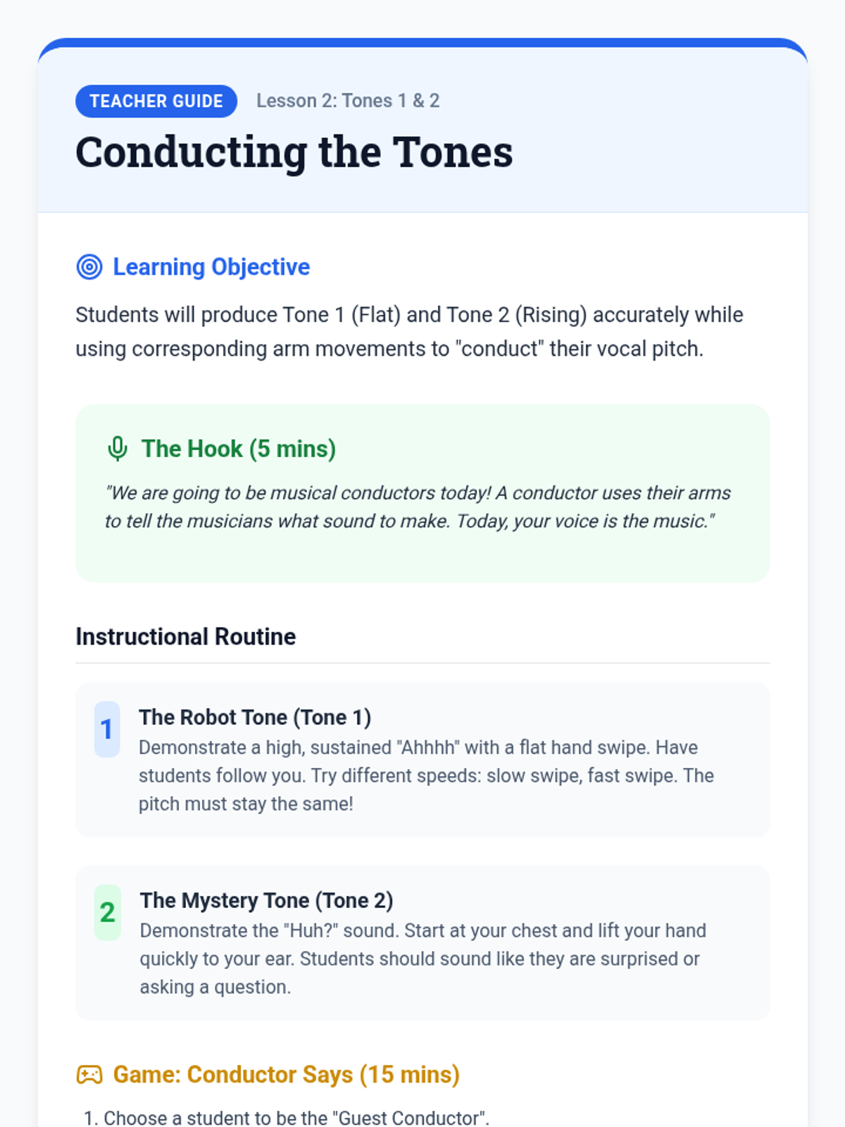 A somatic, movement-based introduction to the four Mandarin tones and the neutral tone for first-grade students. Using visual analogies like cars on roads and physical gestures like karate chops, students learn to identify and produce the tonal contours essential for Mandarin Chinese.