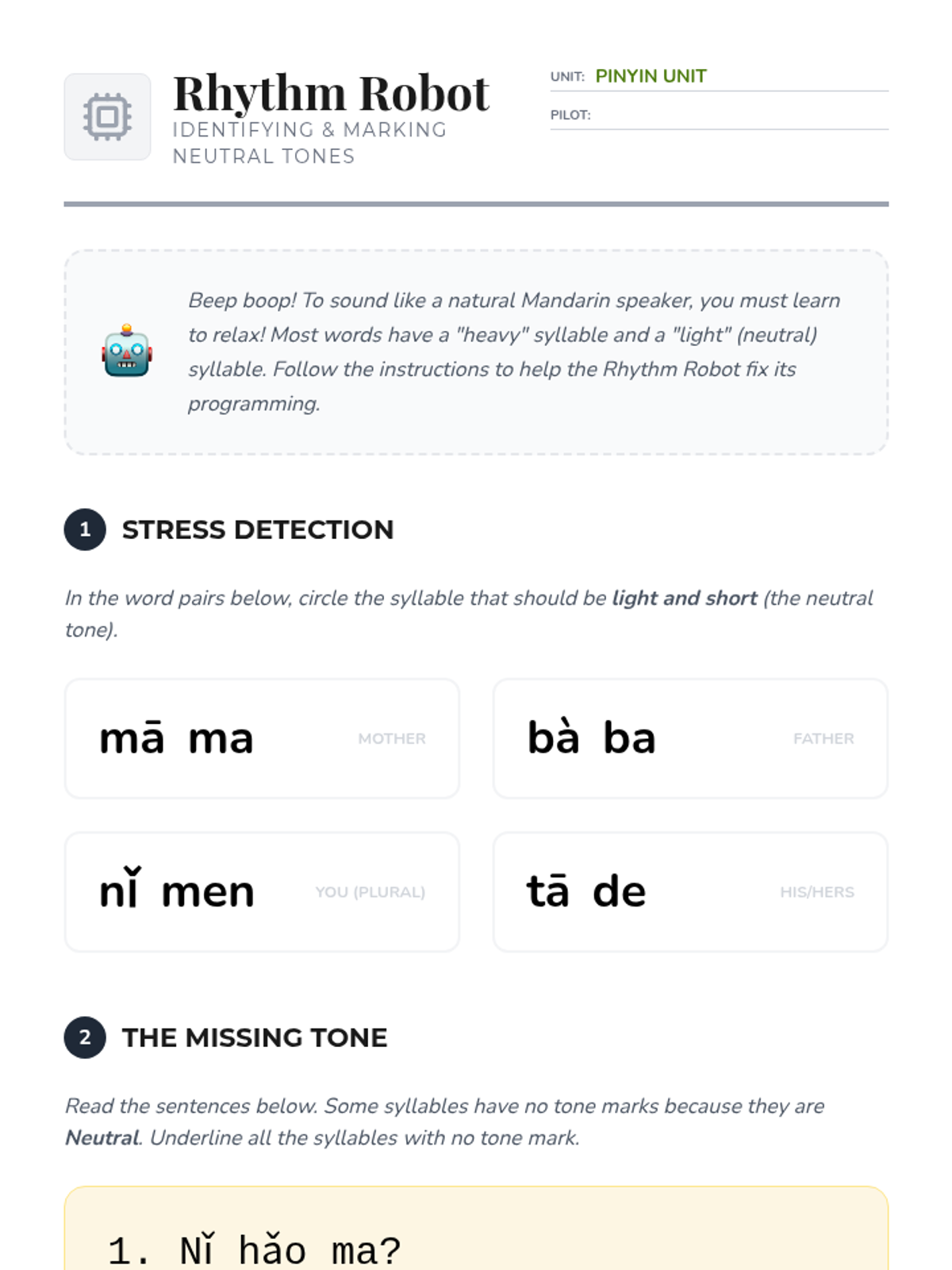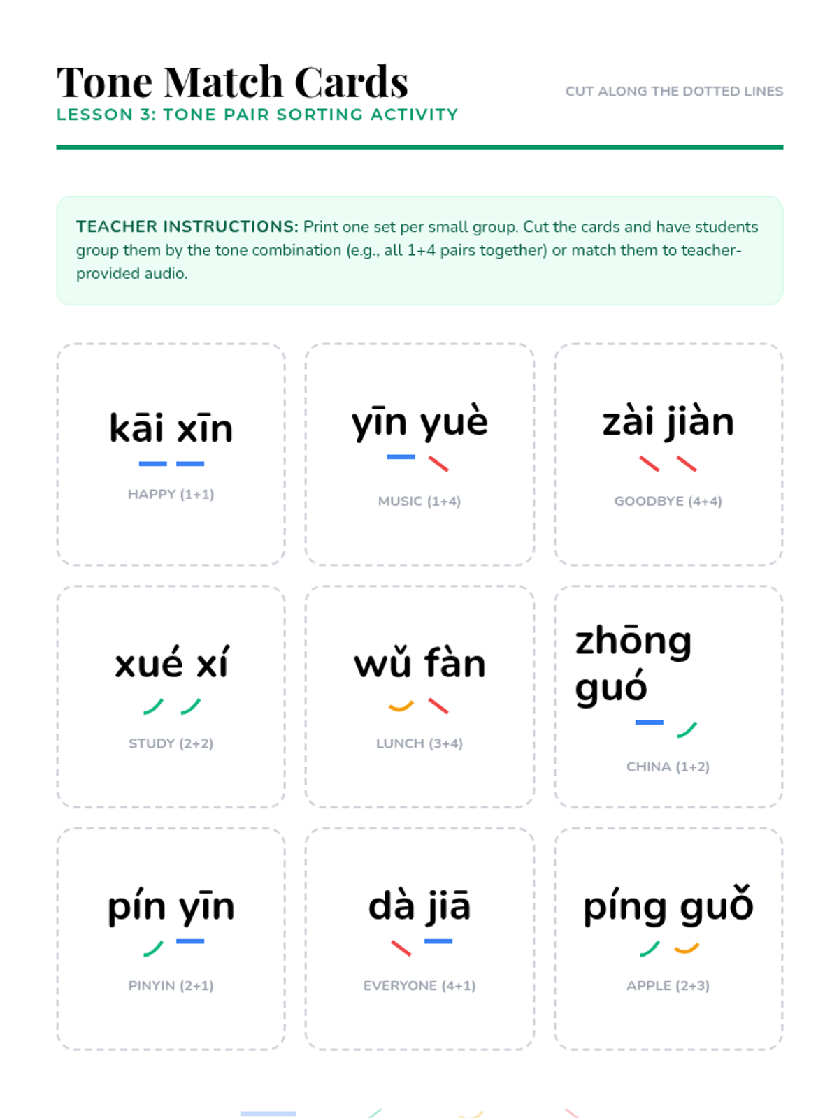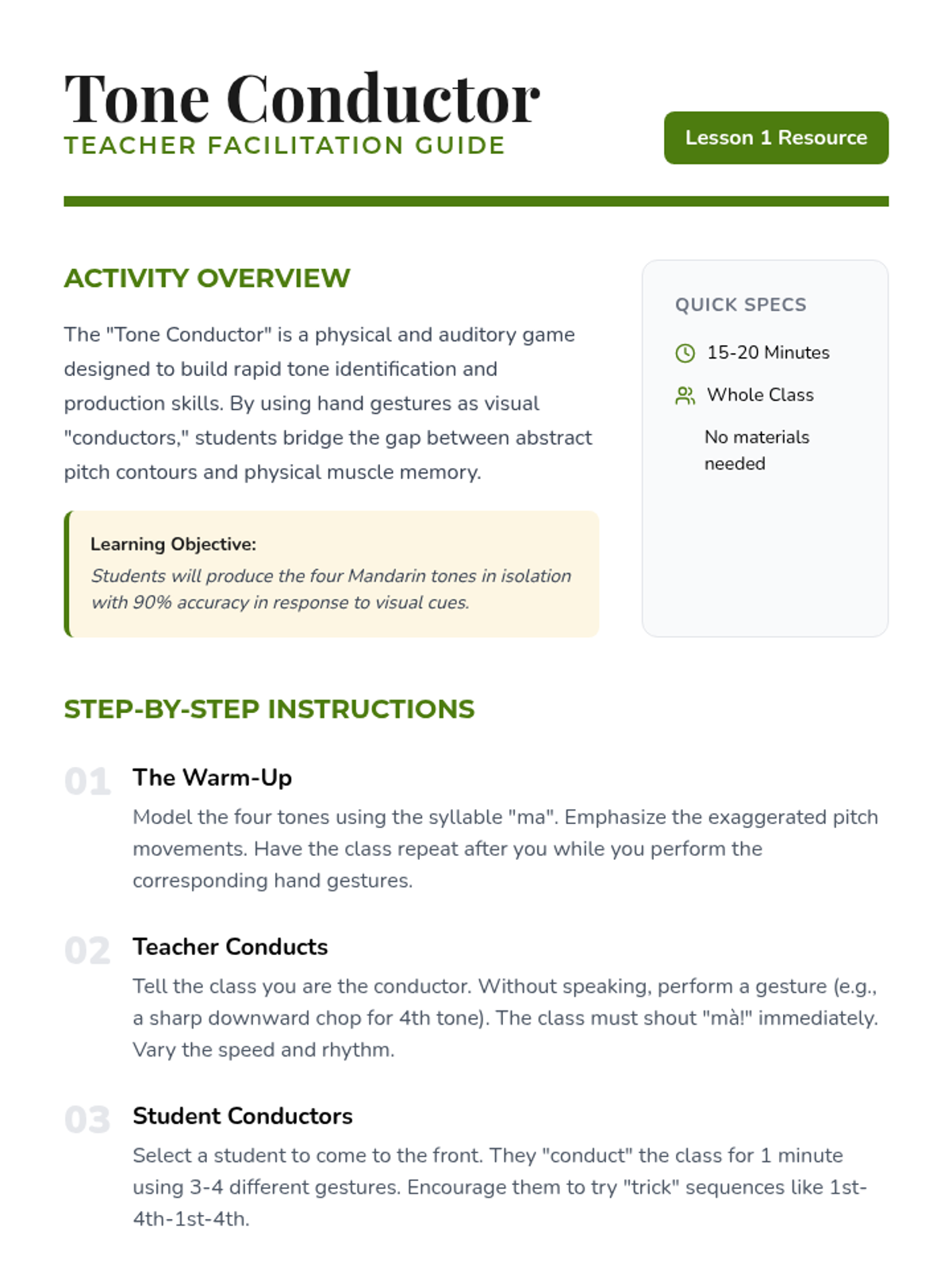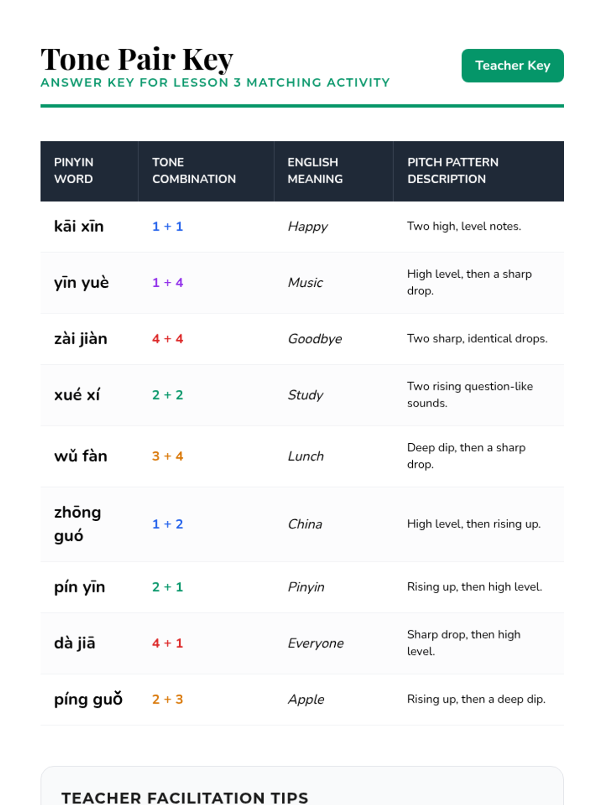 A comprehensive introduction to Mandarin Chinese tones for 6th graders, focusing on pitch contours, the neutral tone, tone pairs, and the third-tone sandhi rule through interactive games and auditory drills.