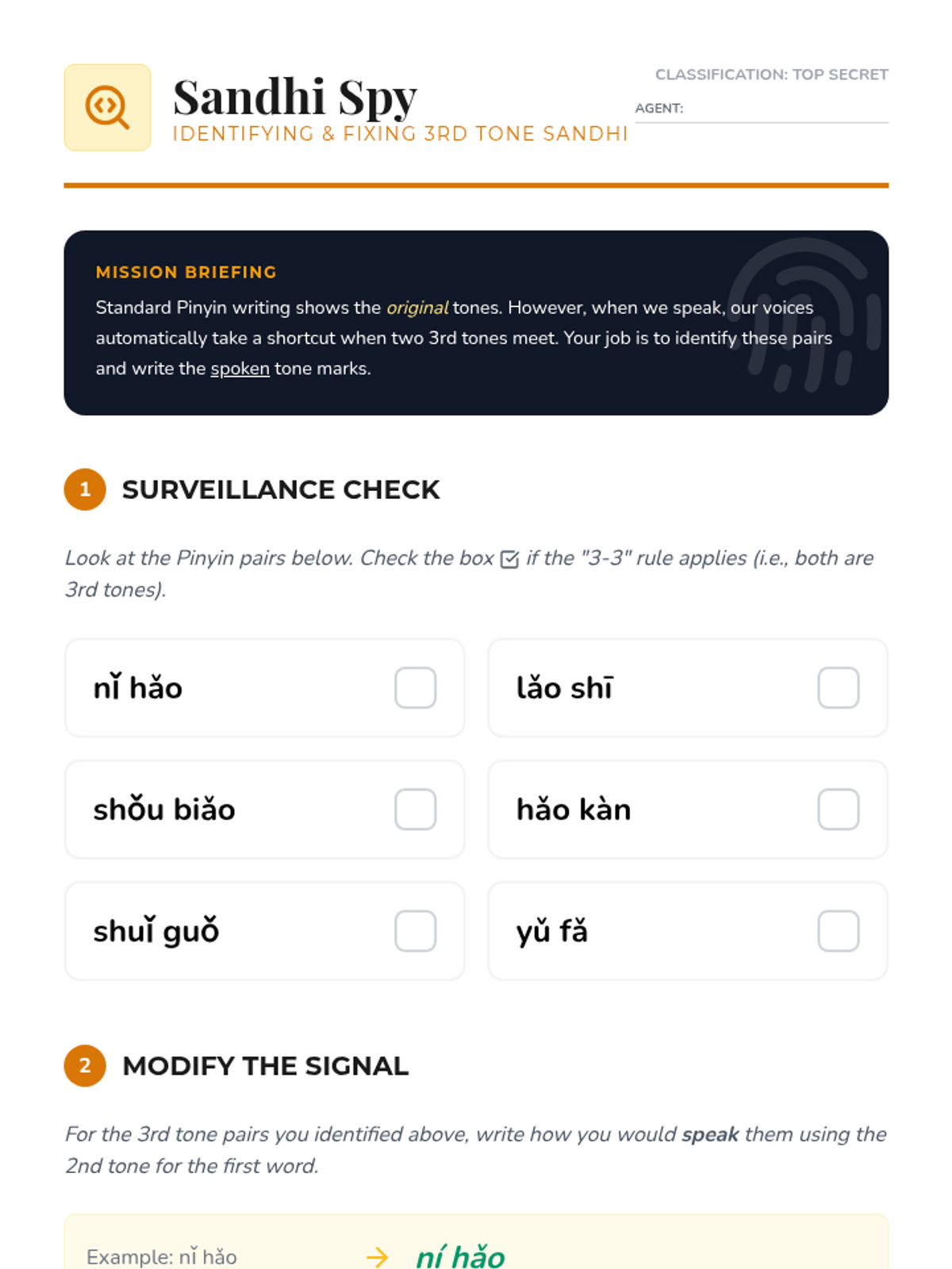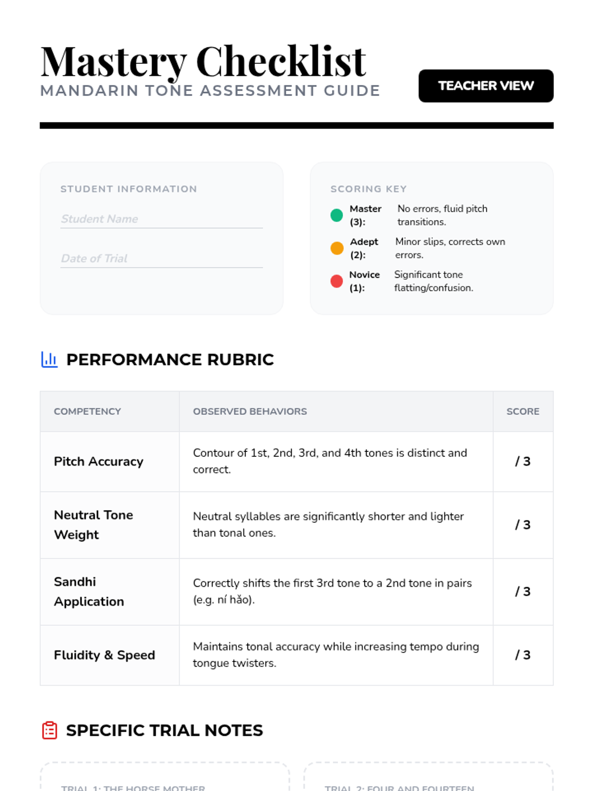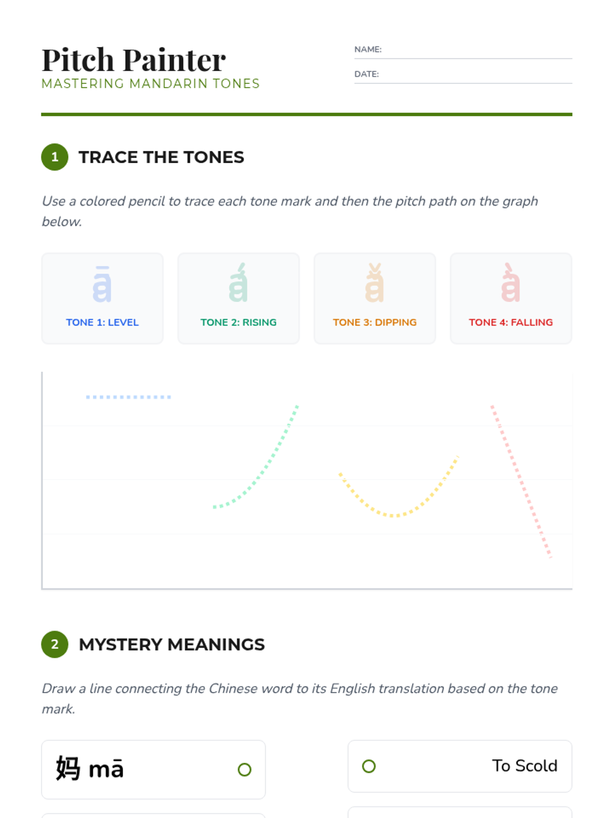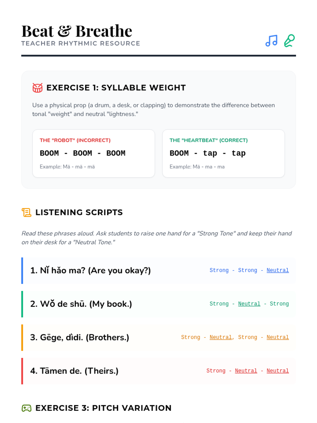 A comprehensive introduction to Mandarin Chinese tones for 6th graders, focusing on pitch contours, the neutral tone, tone pairs, and the third-tone sandhi rule through interactive games and auditory drills.