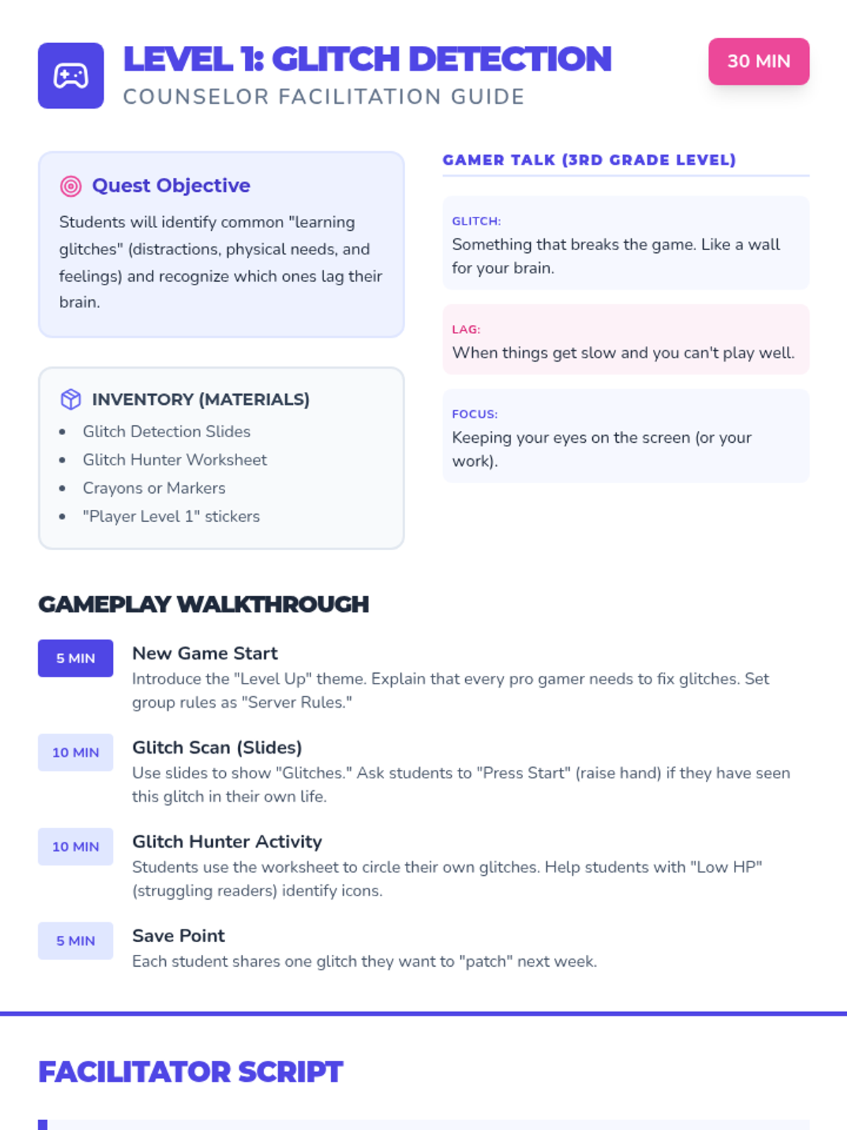A 4-week counselor-led small group for 7th graders reading at a 3rd-grade level, focusing on overcoming learning barriers and mastering simple test preparation strategies. The sequence uses a 'Level Up' video game theme to build confidence and practical skills.