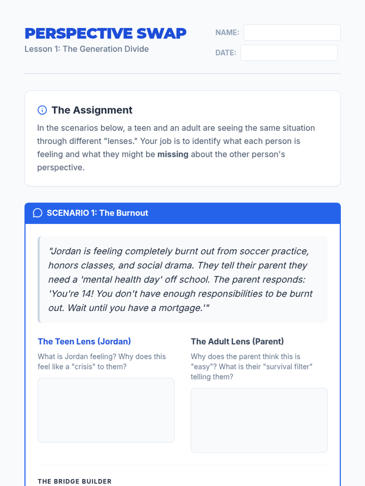A Grade 9 mental health unit focused on social awareness and relationship building. Students explore generational differences in mental health perspectives, practice perspective-taking through various scenarios, and develop skills for respectful, empathetic communication.