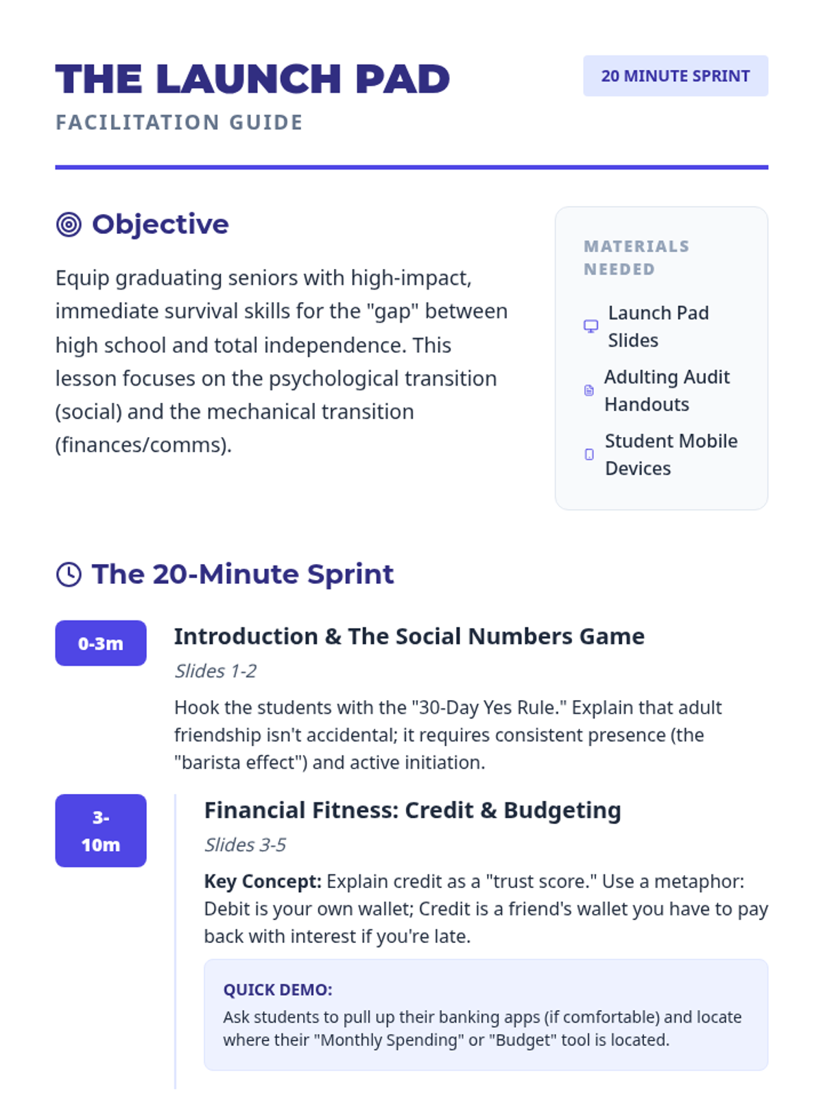 A comprehensive series designed to prepare high school seniors for the transition to independent life, focusing on financial literacy, social navigation, and professional readiness.