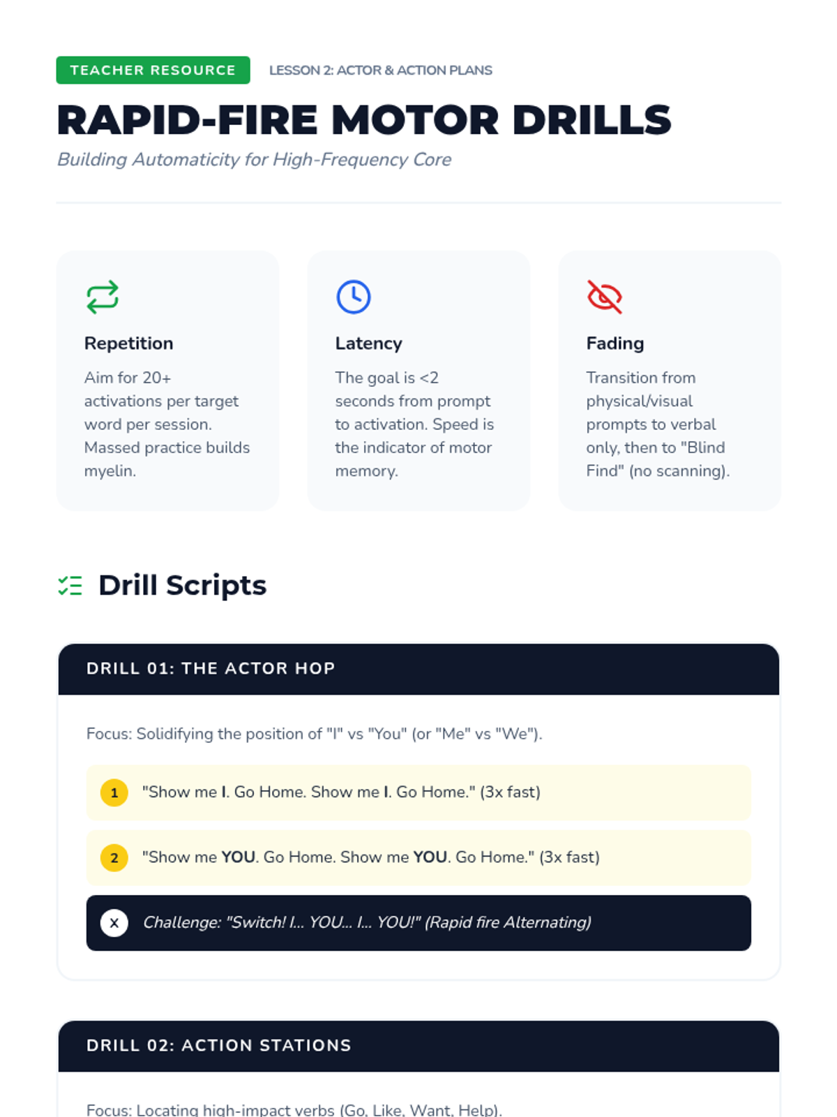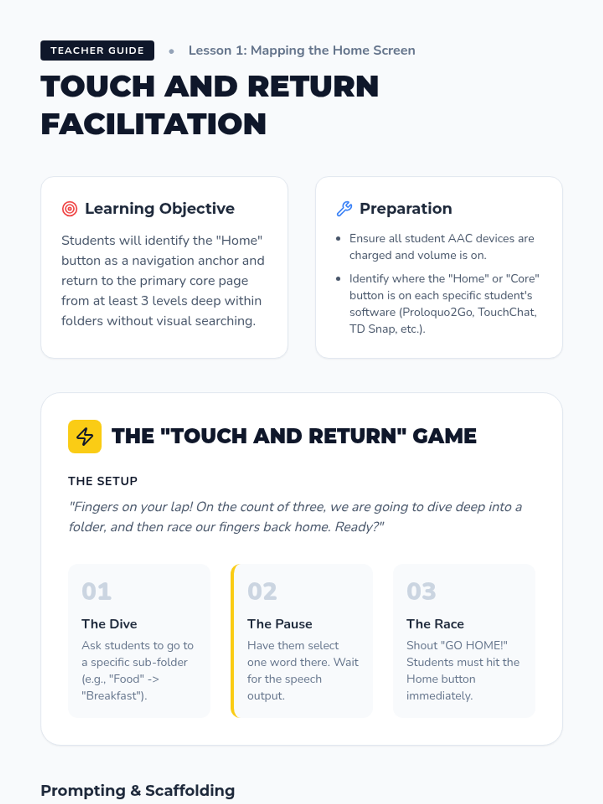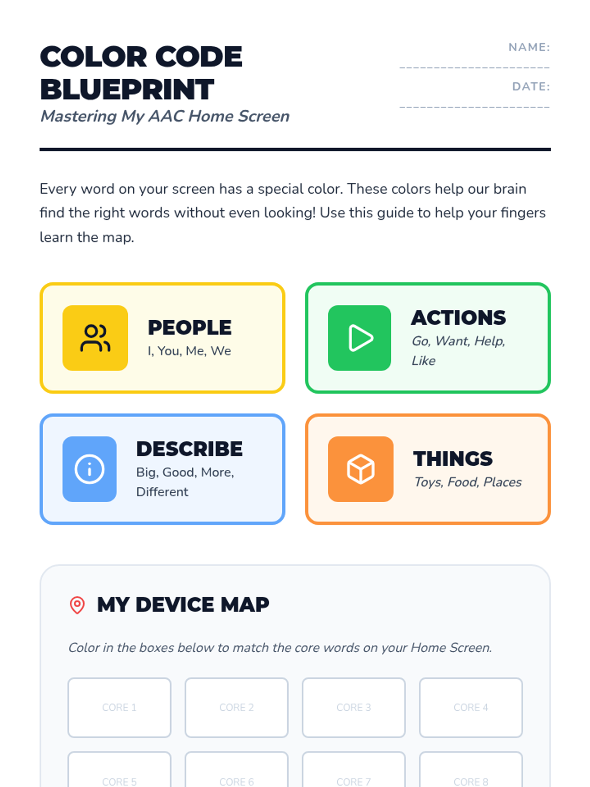 A specialized sequence for 4th Grade students to build muscle memory and navigation automaticity on high-tech AAC devices. Students learn to navigate by position and color-coding rather than visual scanning to increase communication speed.