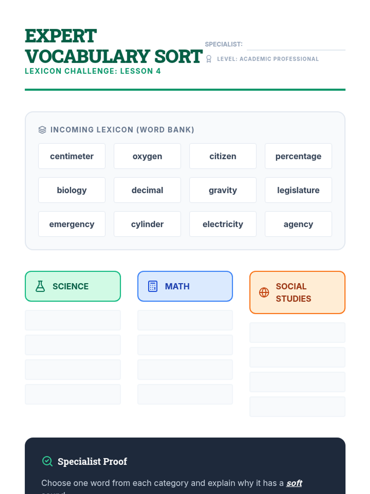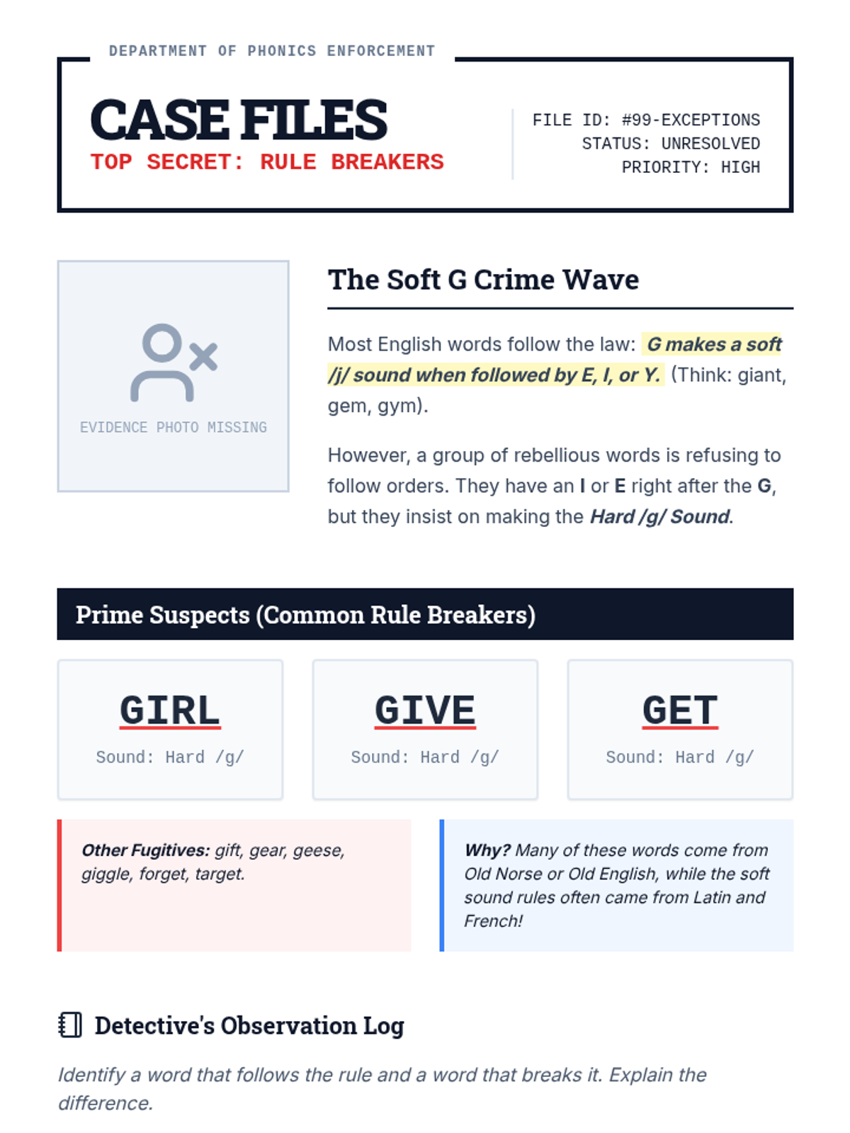 A comprehensive 3rd-grade sequence focused on soft 'c' and 'g' in multisyllabic words, morphological changes, and rule exceptions. Students progress from basic decoding to analyzing academic vocabulary and editing complex texts.