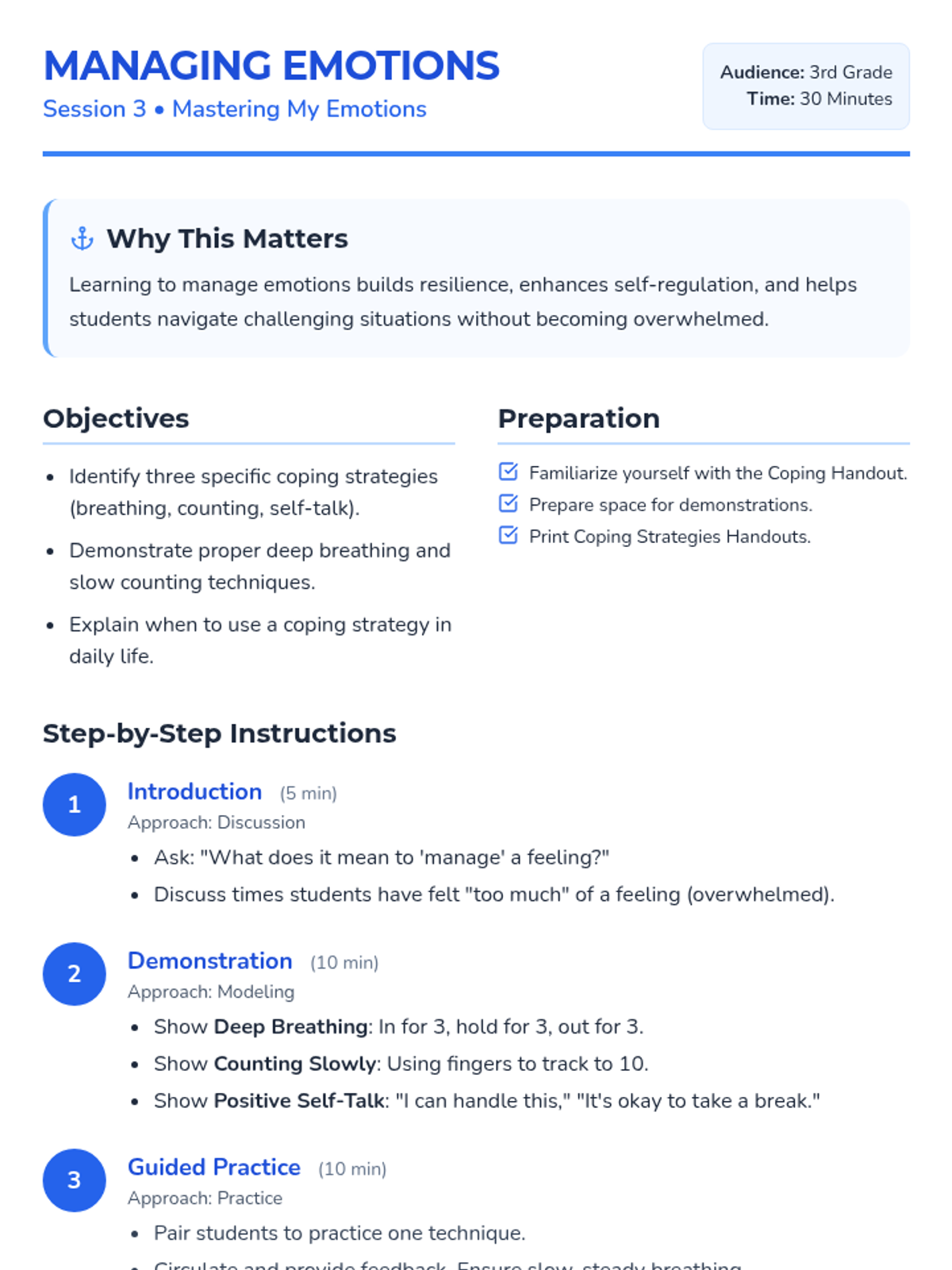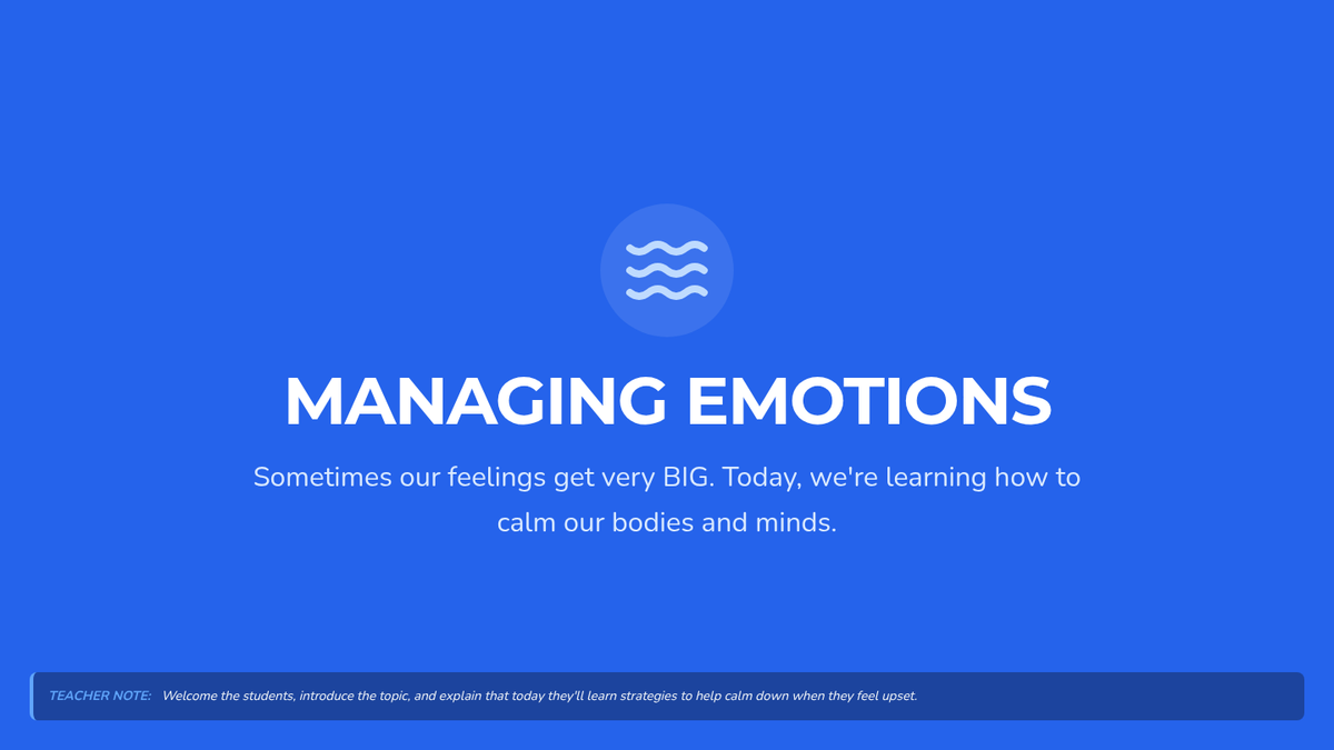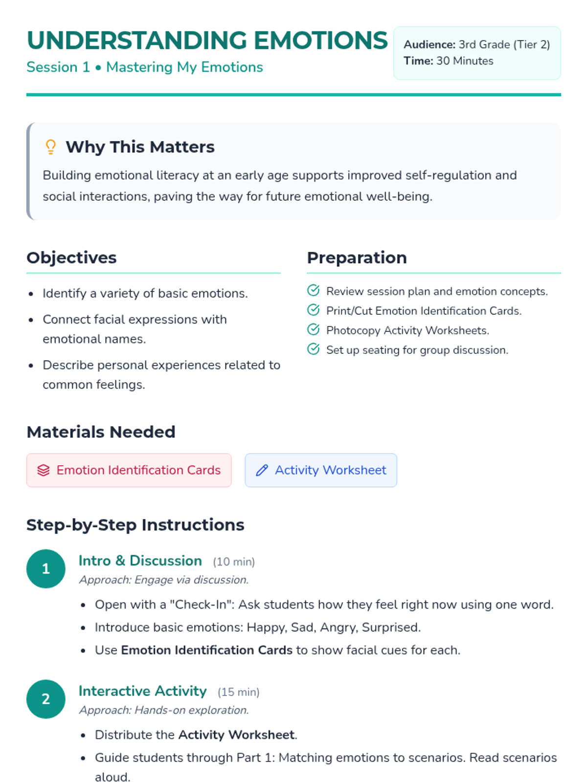 A 5-session Tier 2 group intervention for 3rd graders focused on emotional literacy, healthy expression, coping strategies, empathy, and resilience. Students will move from identifying basic feelings to building a personal toolkit for emotional regulation.