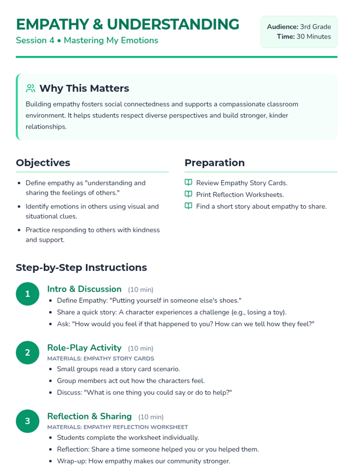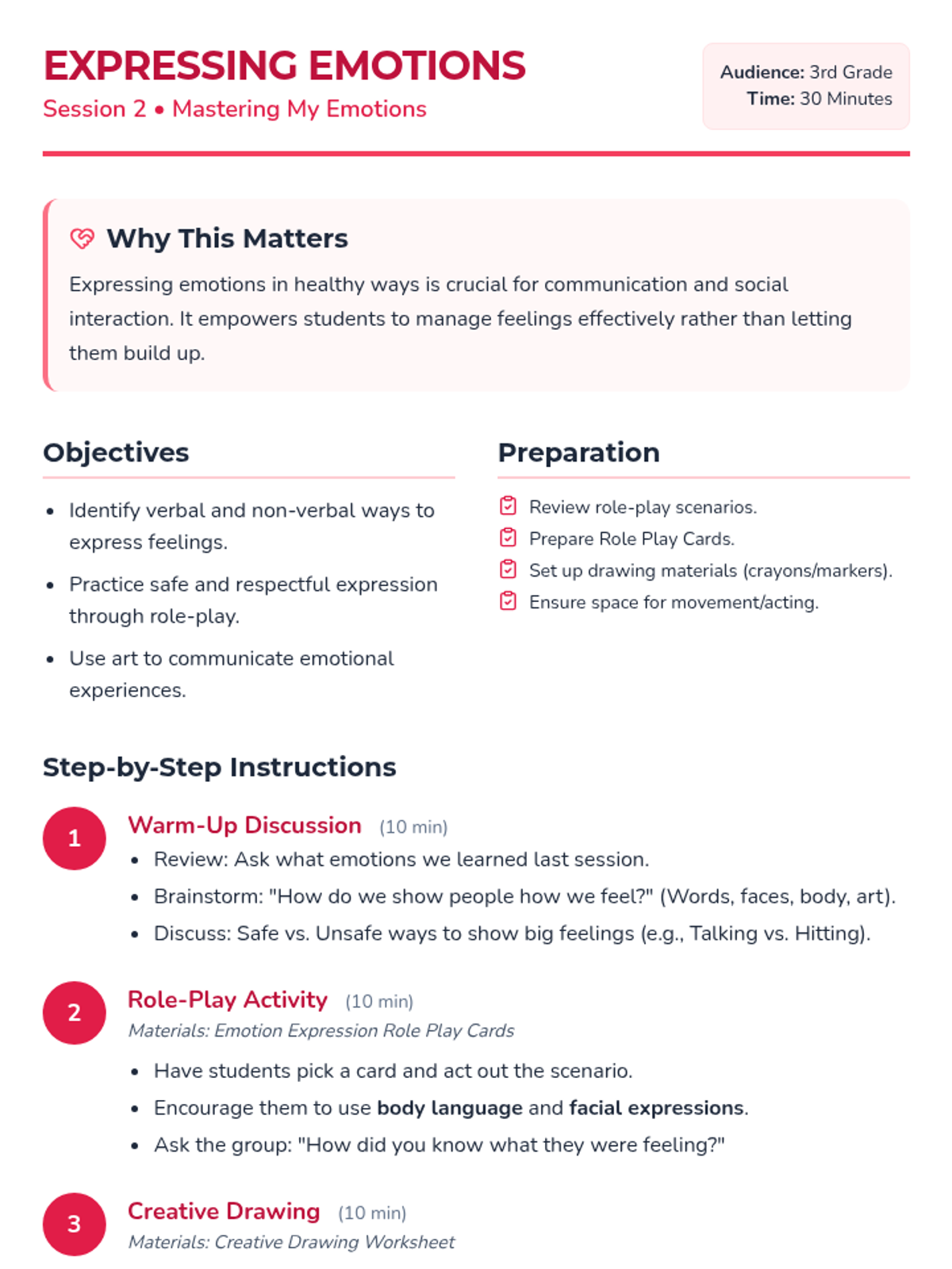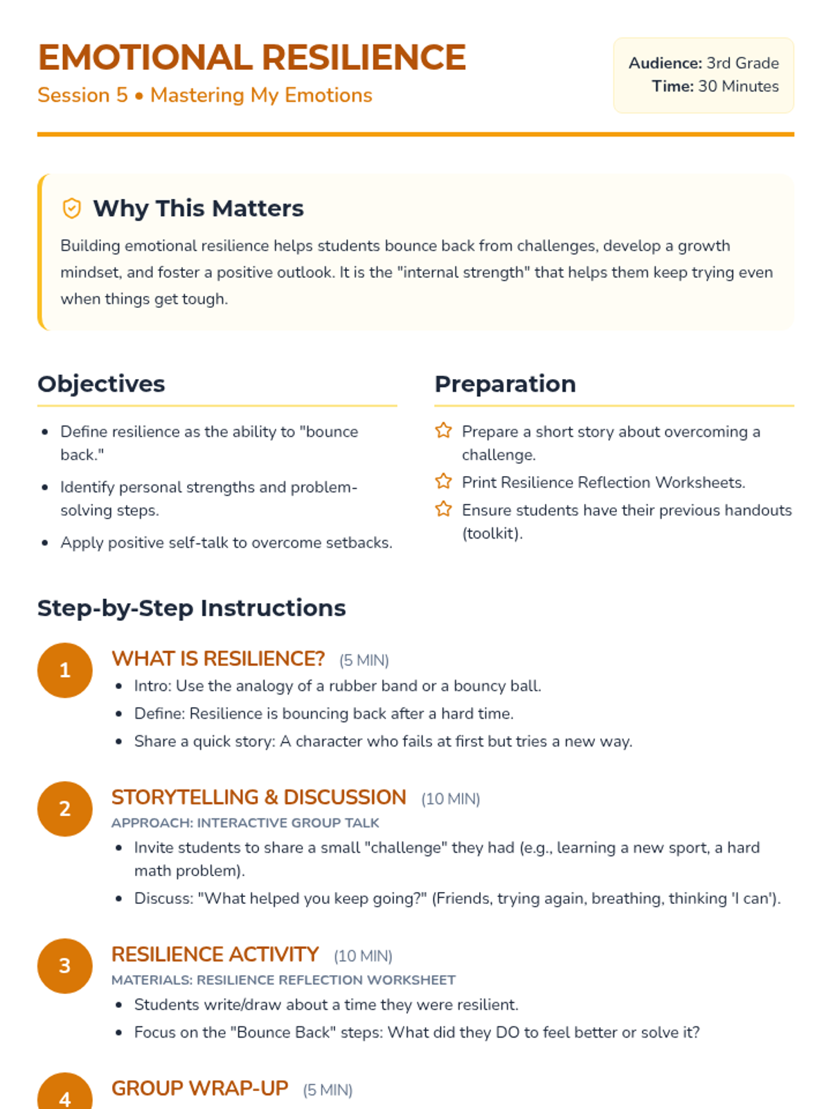 A 5-session Tier 2 group intervention for 3rd graders focused on emotional literacy, healthy expression, coping strategies, empathy, and resilience. Students will move from identifying basic feelings to building a personal toolkit for emotional regulation.
