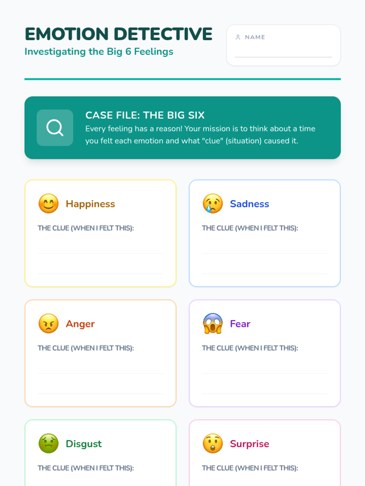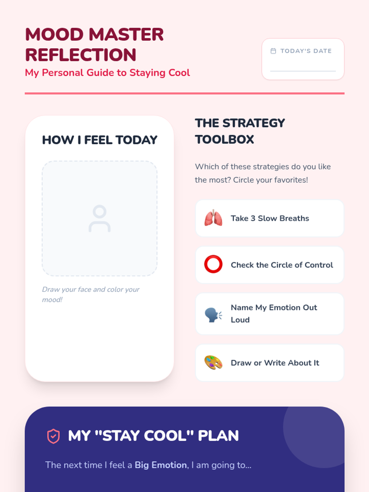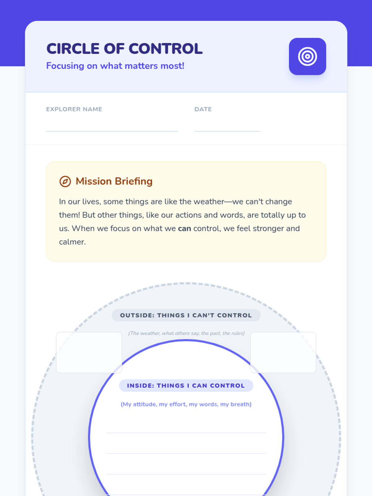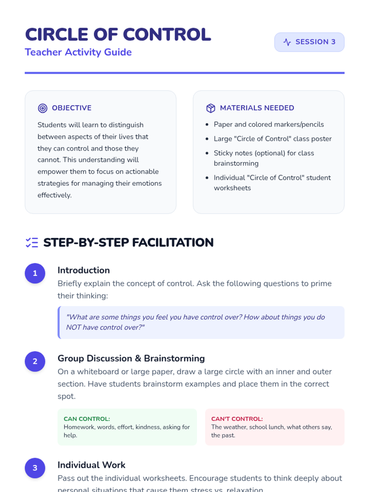 A 4-session social-emotional learning unit for 3rd graders focused on identifying, expressing, and regulating emotions. Students explore the 'Circle of Control' and develop practical coping strategies through interactive videos, discussions, and creative reflections.