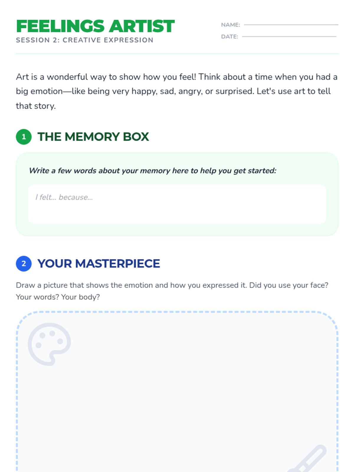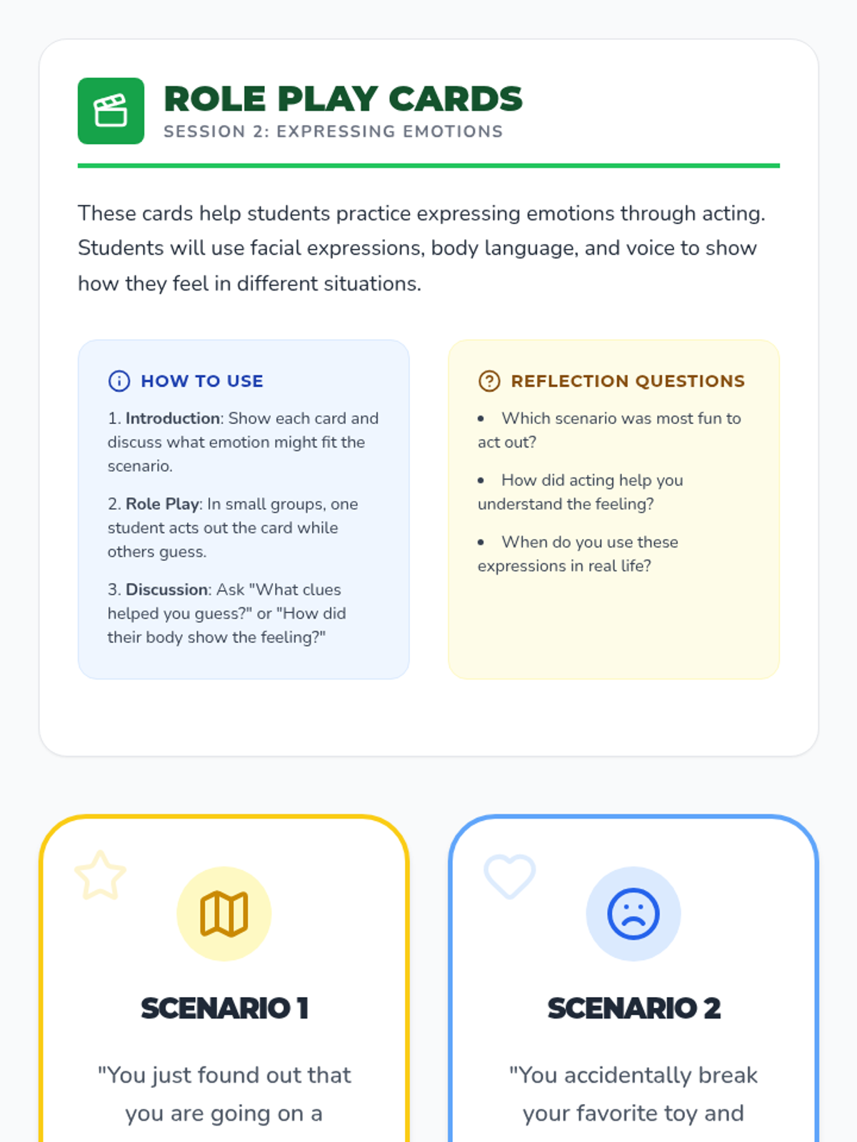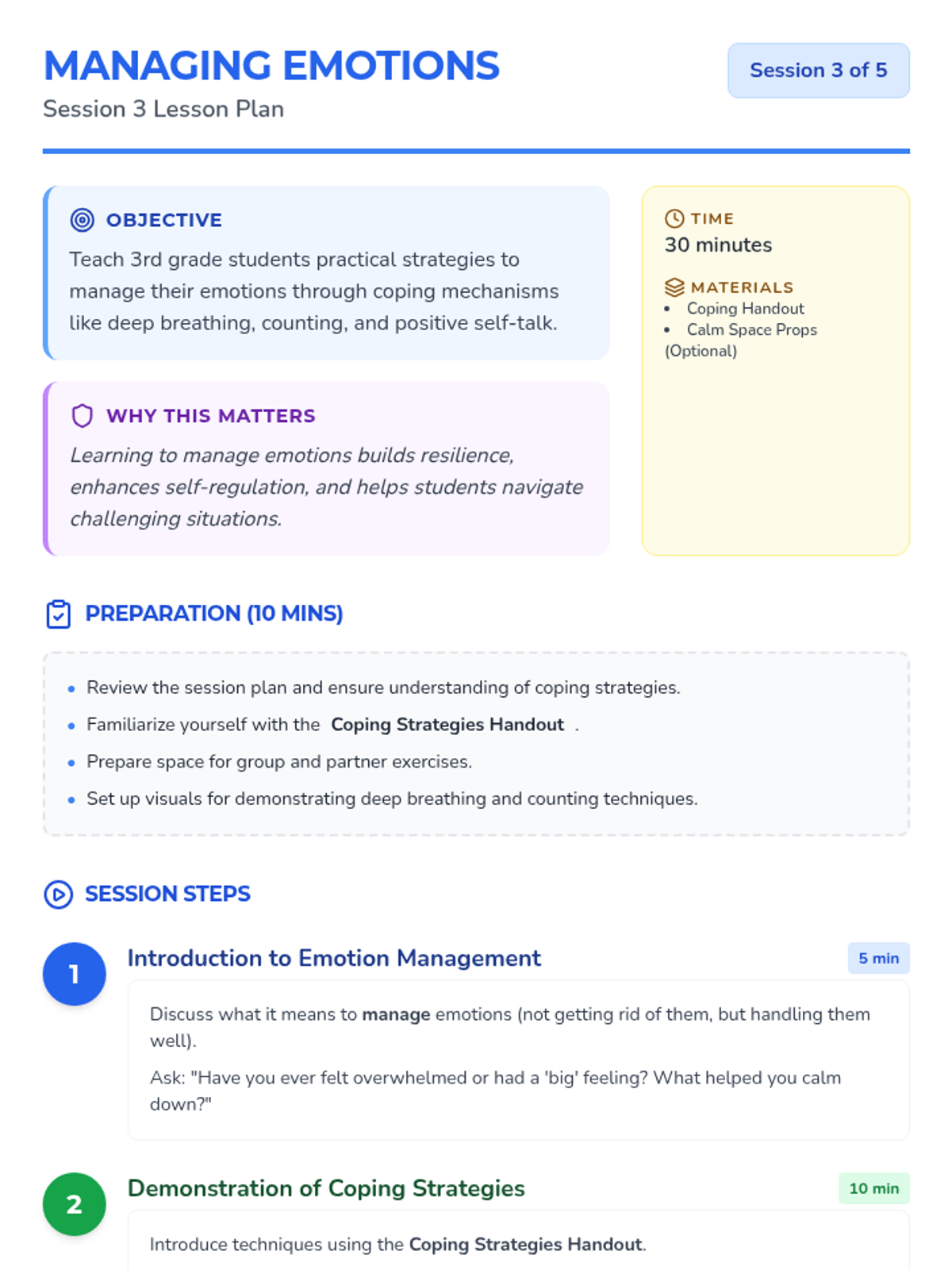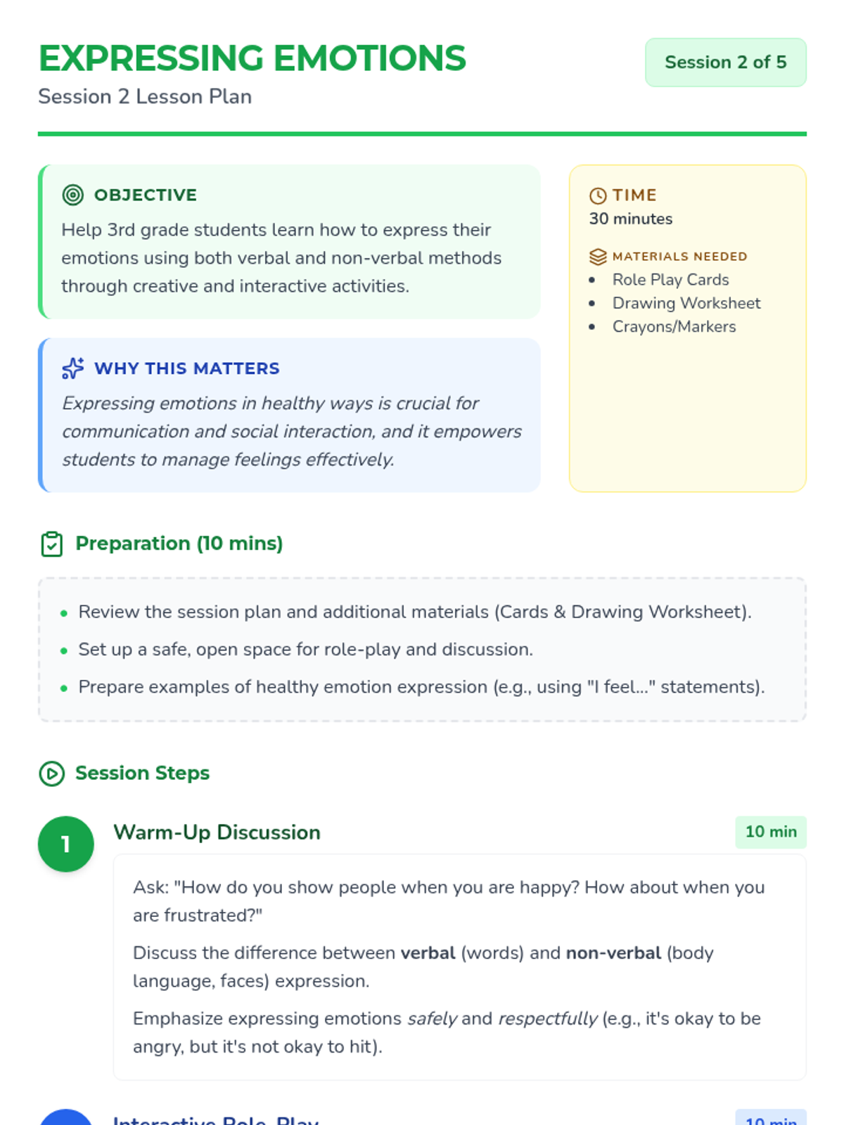 A 5-session Tier 2 group intervention for 3rd graders focused on emotional regulation, empathy, and resilience. Students learn to identify, express, and manage emotions through interactive activities, role-play, and creative reflection.