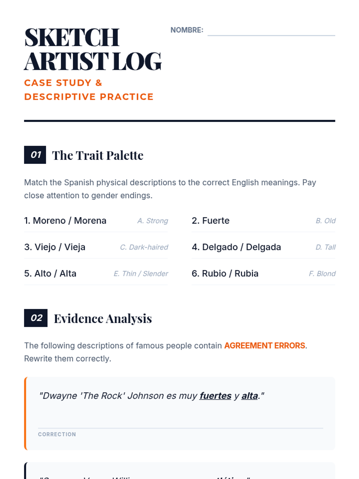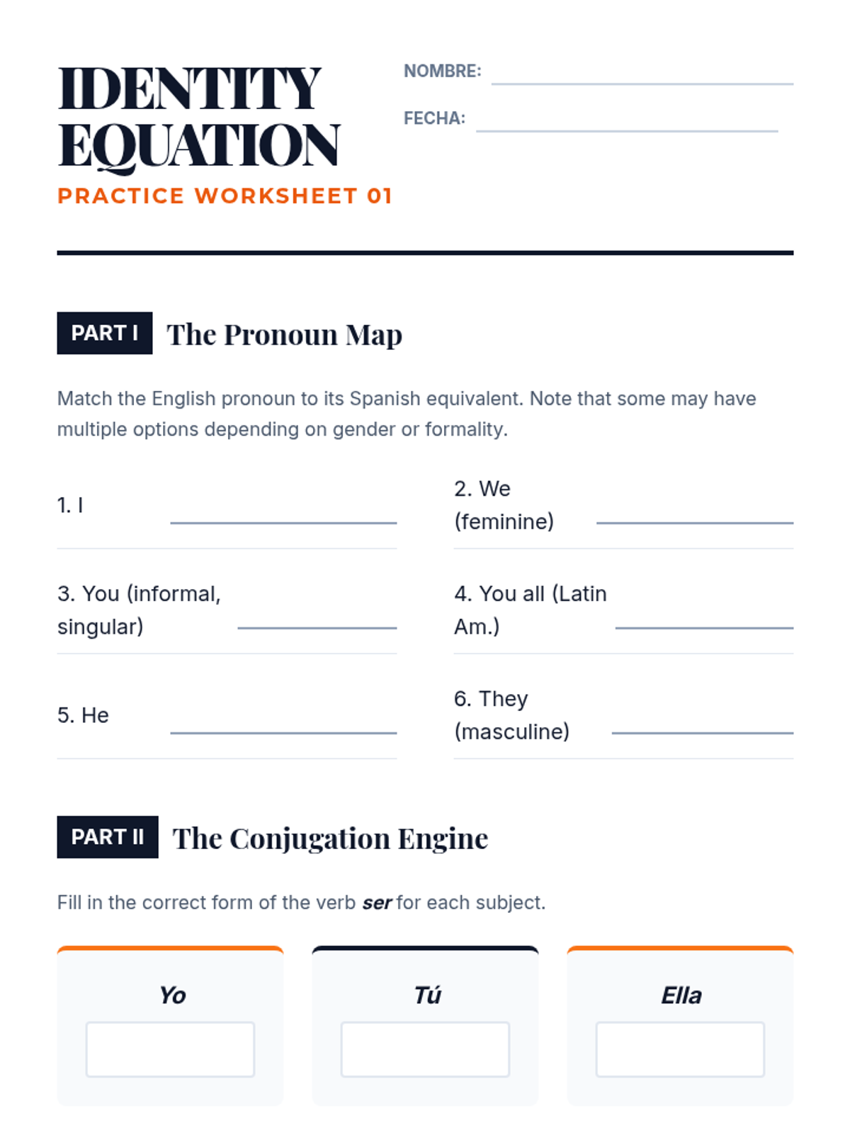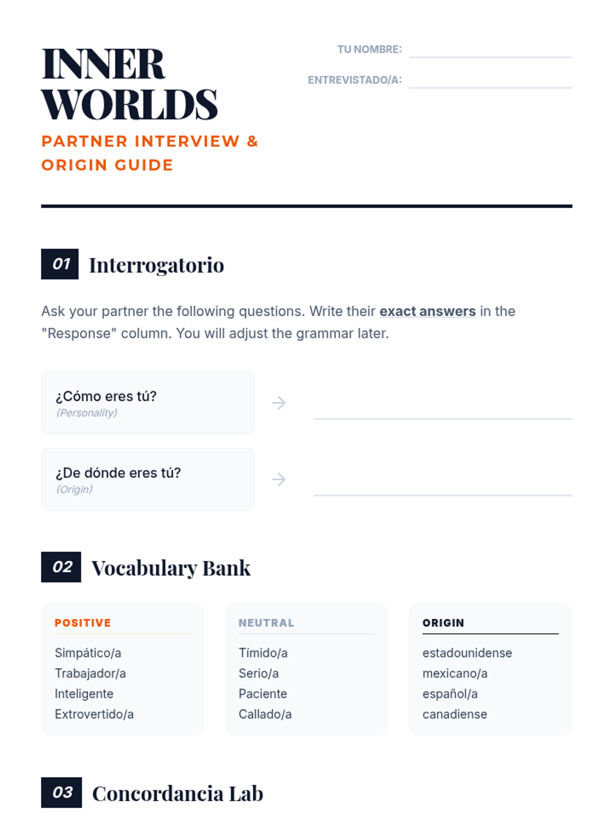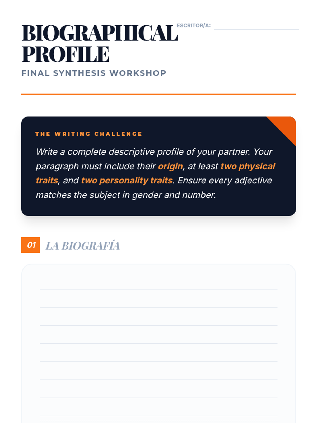 A comprehensive introduction to Spanish grammar focused on the verb 'ser', subject pronouns, and noun-adjective agreement. Undergraduate students will progress from basic sentence structures to writing detailed physical and personality profiles.