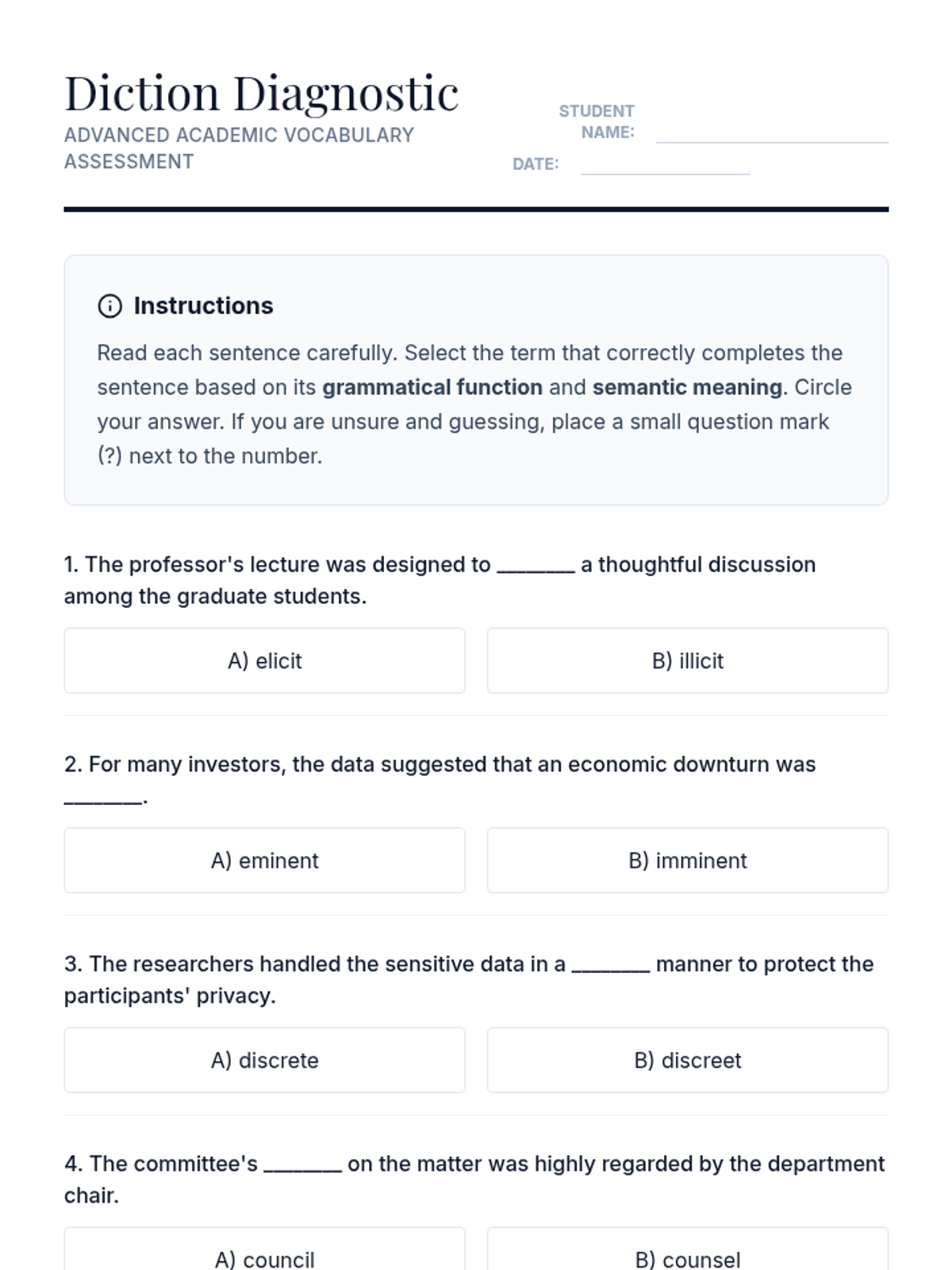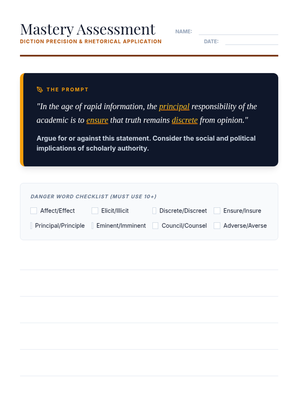 A rigorous sequence for 12th-grade students focusing on advanced homophones in academic writing. Students move from diagnostic self-assessment to applying nuanced vocabulary choices that enhance rhetorical precision and authority in their arguments.