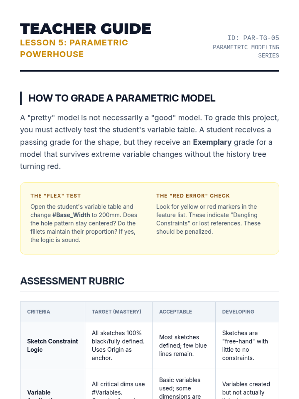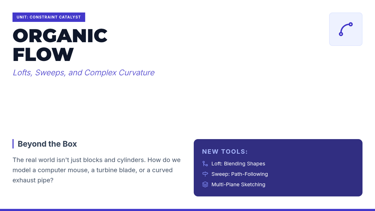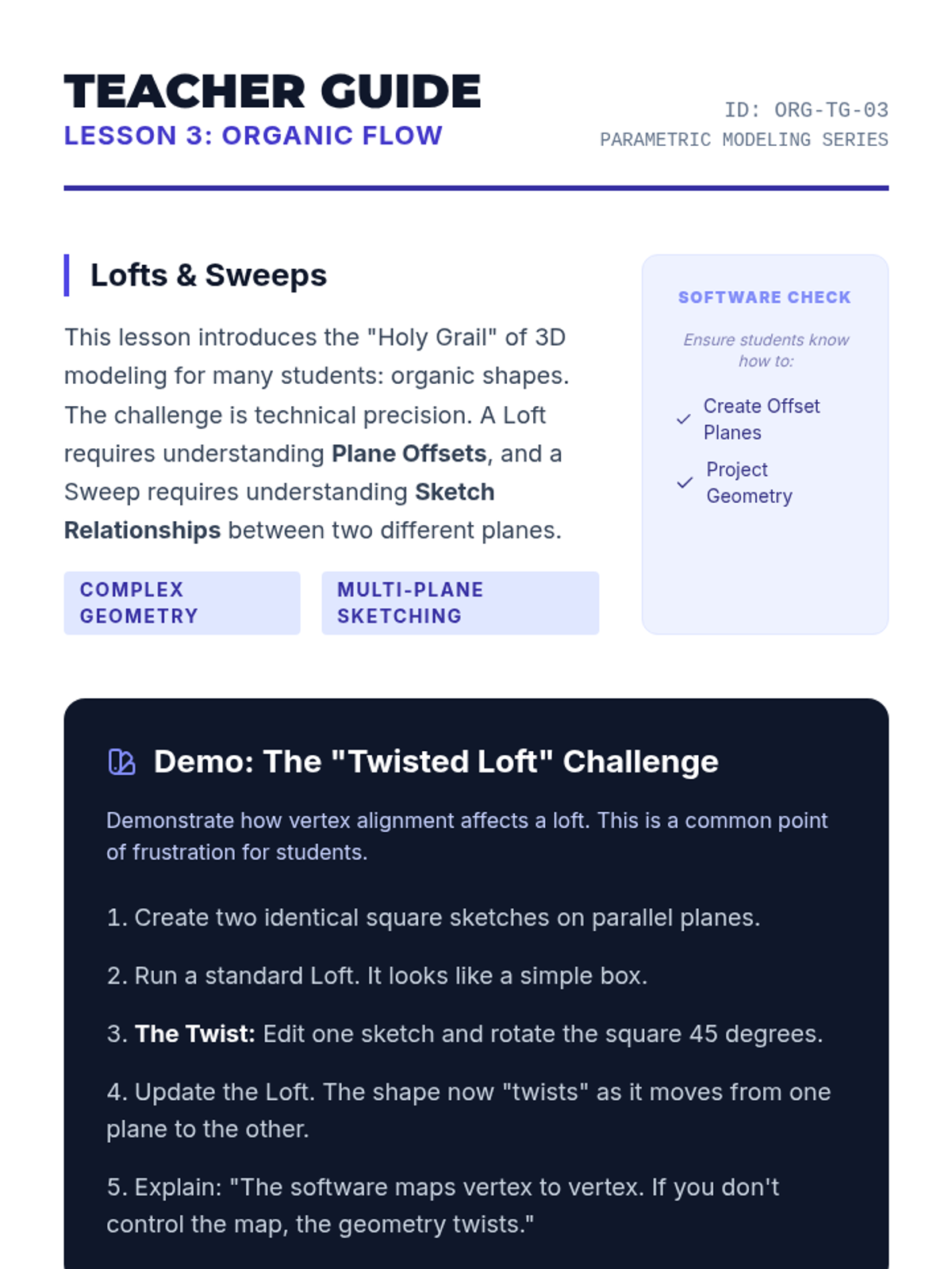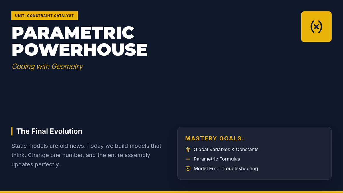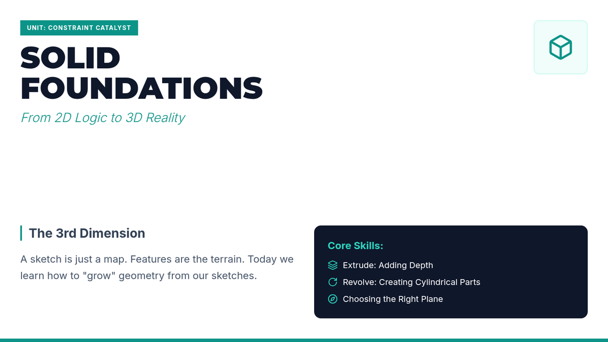 A comprehensive introduction to parametric CAD modeling for 11th-grade students. This sequence covers 2D sketching with geometric constraints, 3D feature creation (extrude, revolve, loft, sweep), and advanced part refinement, culminating in a parametric design challenge.
