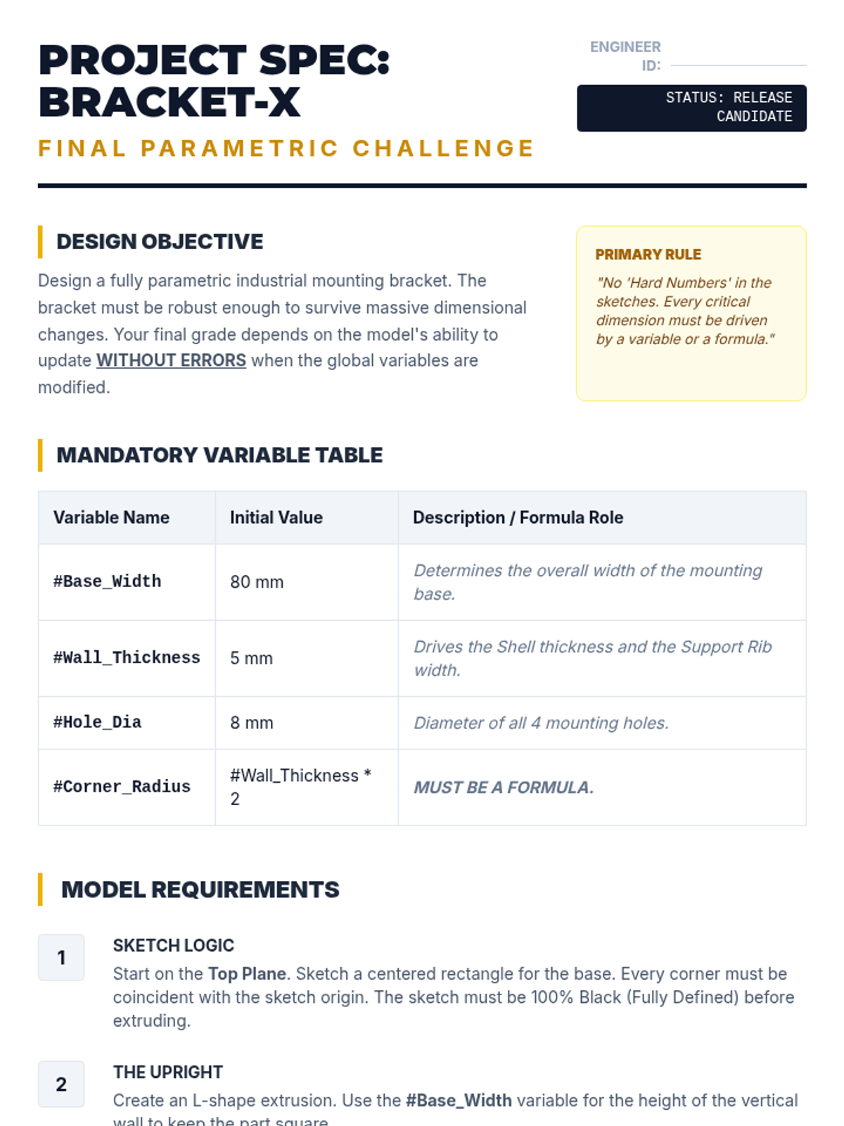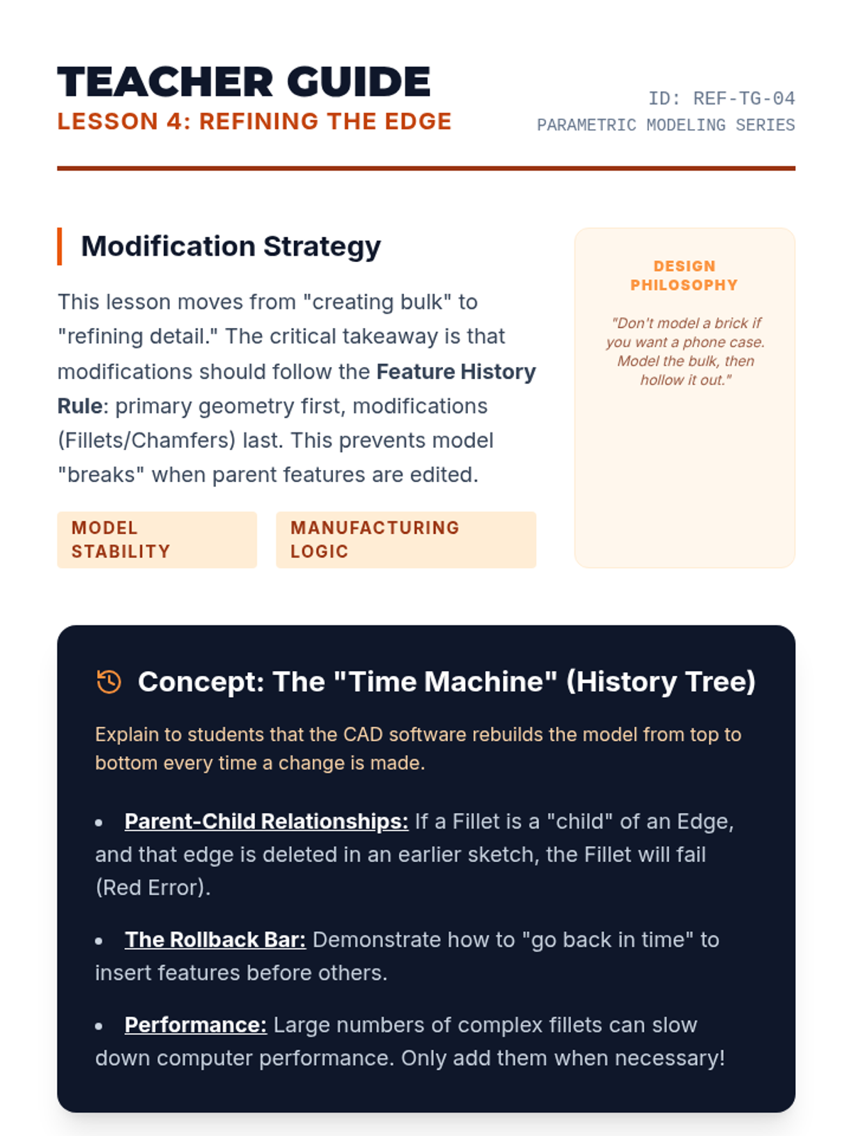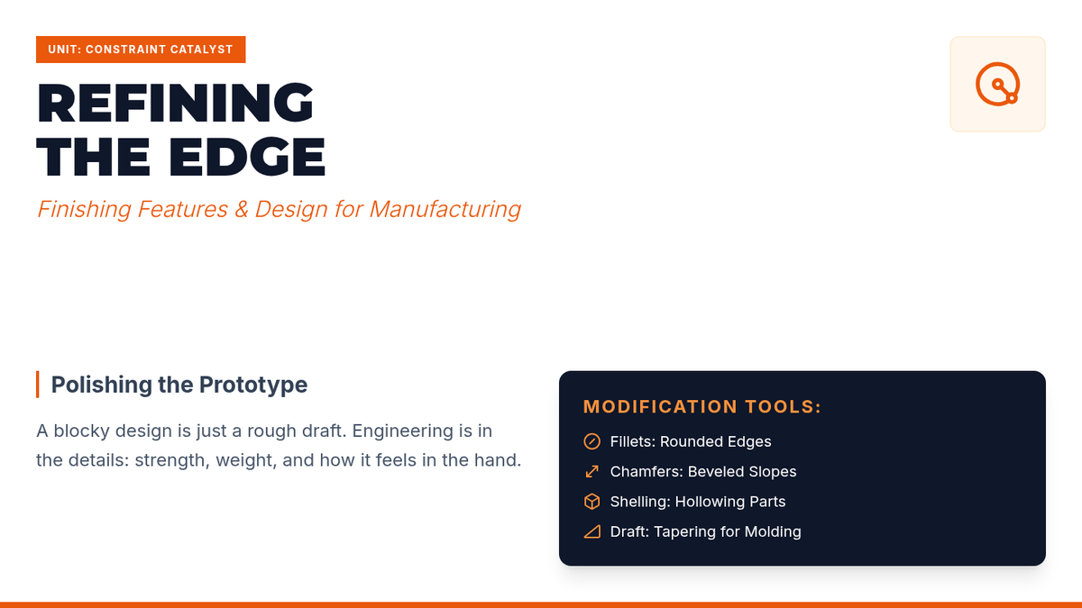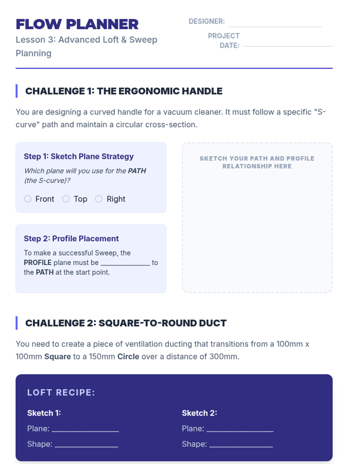 A comprehensive introduction to parametric CAD modeling for 11th-grade students. This sequence covers 2D sketching with geometric constraints, 3D feature creation (extrude, revolve, loft, sweep), and advanced part refinement, culminating in a parametric design challenge.