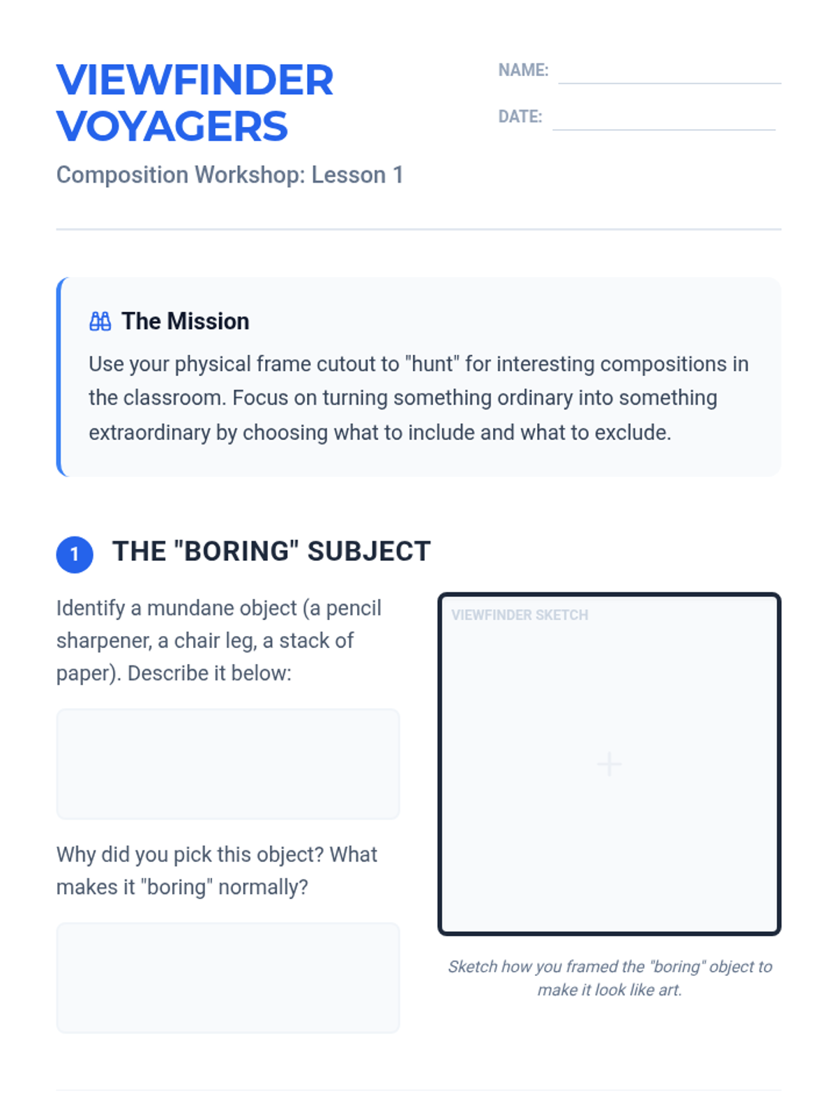 A 5-lesson unit for 6th-grade students focusing on the fundamental rules of photographic composition, including framing, the rule of thirds, leading lines, and perspective. Students progress from isolating visual elements to creating complex, balanced images.