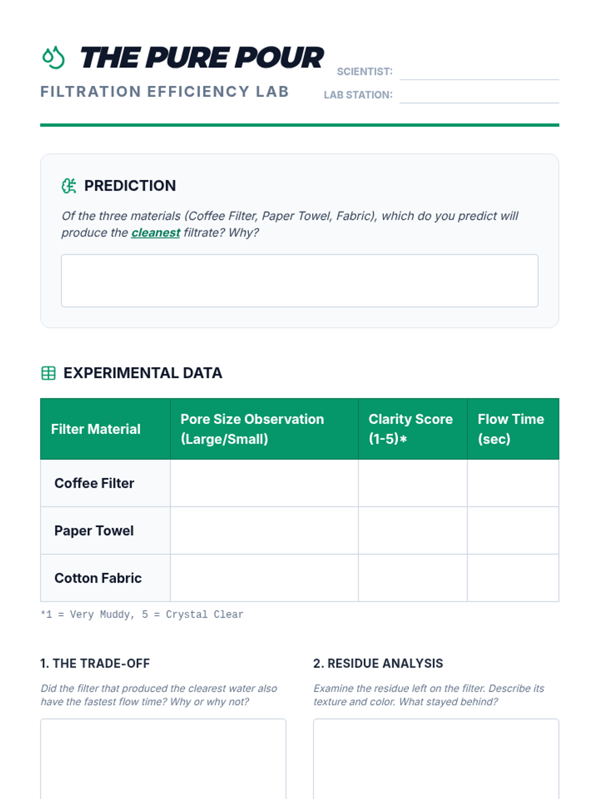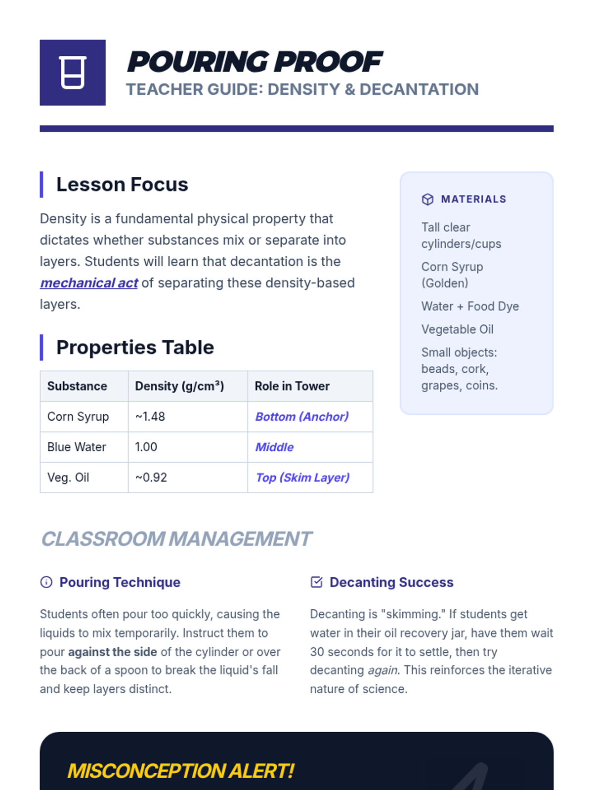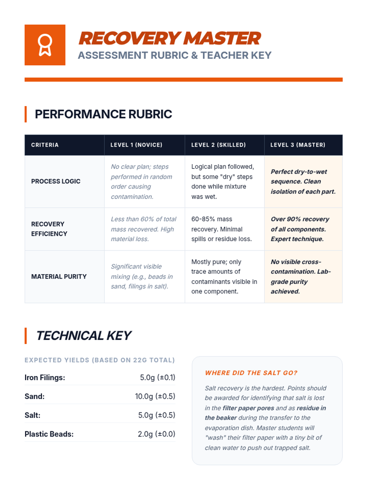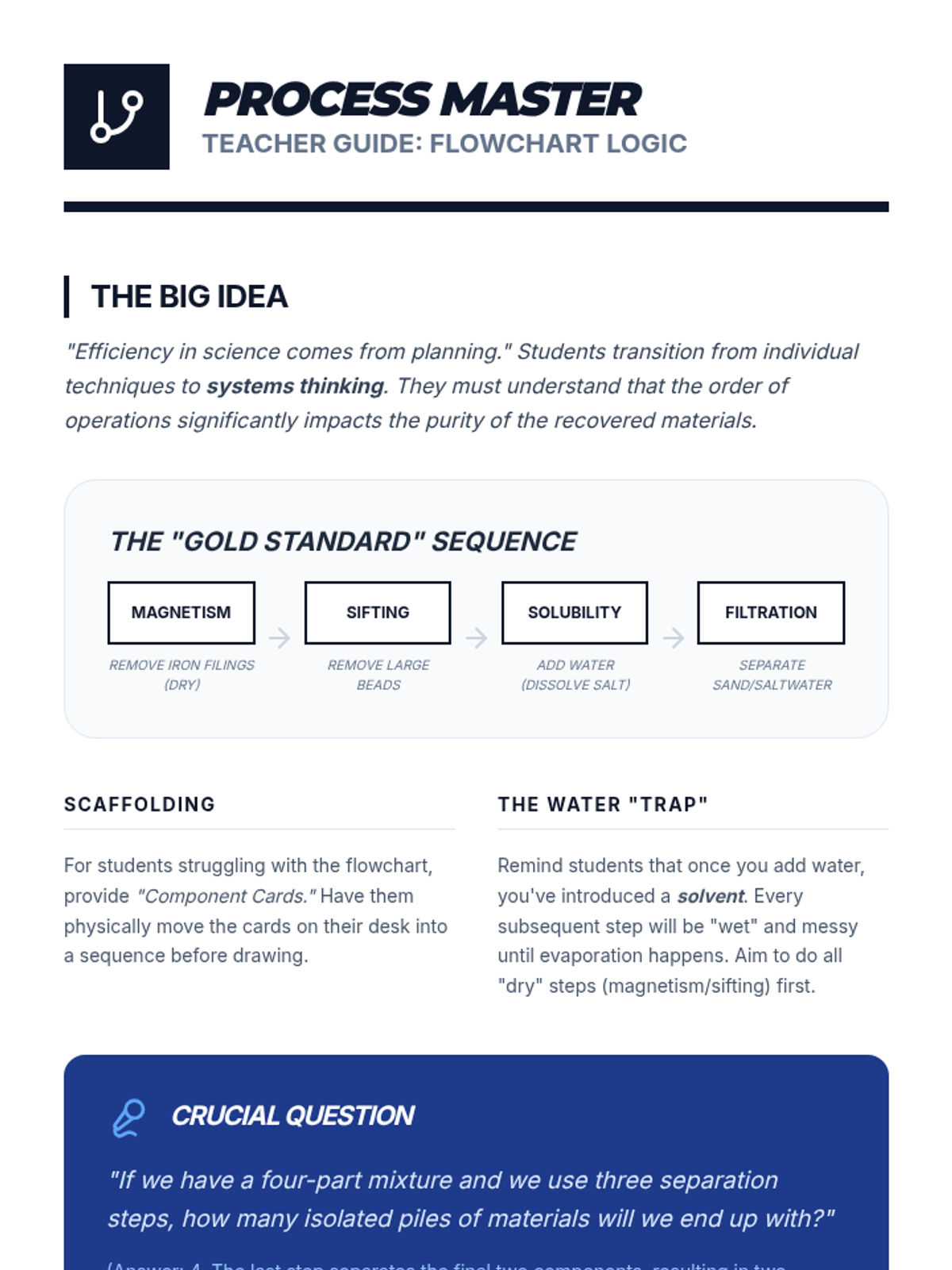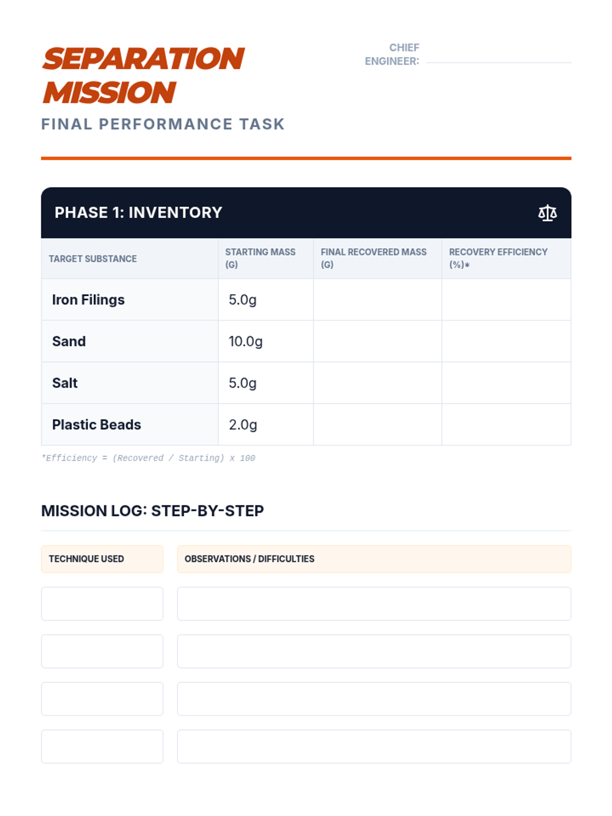 A comprehensive workshop-style sequence for 6th-grade students to master the physical separation of heterogeneous mixtures. Students progress through sifting, magnetism, filtration, and decantation, culminating in a complex multi-step separation challenge.