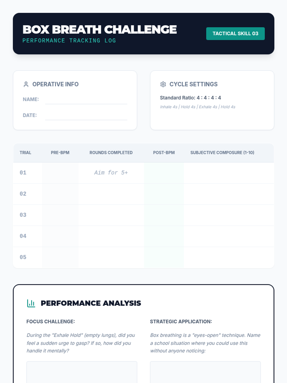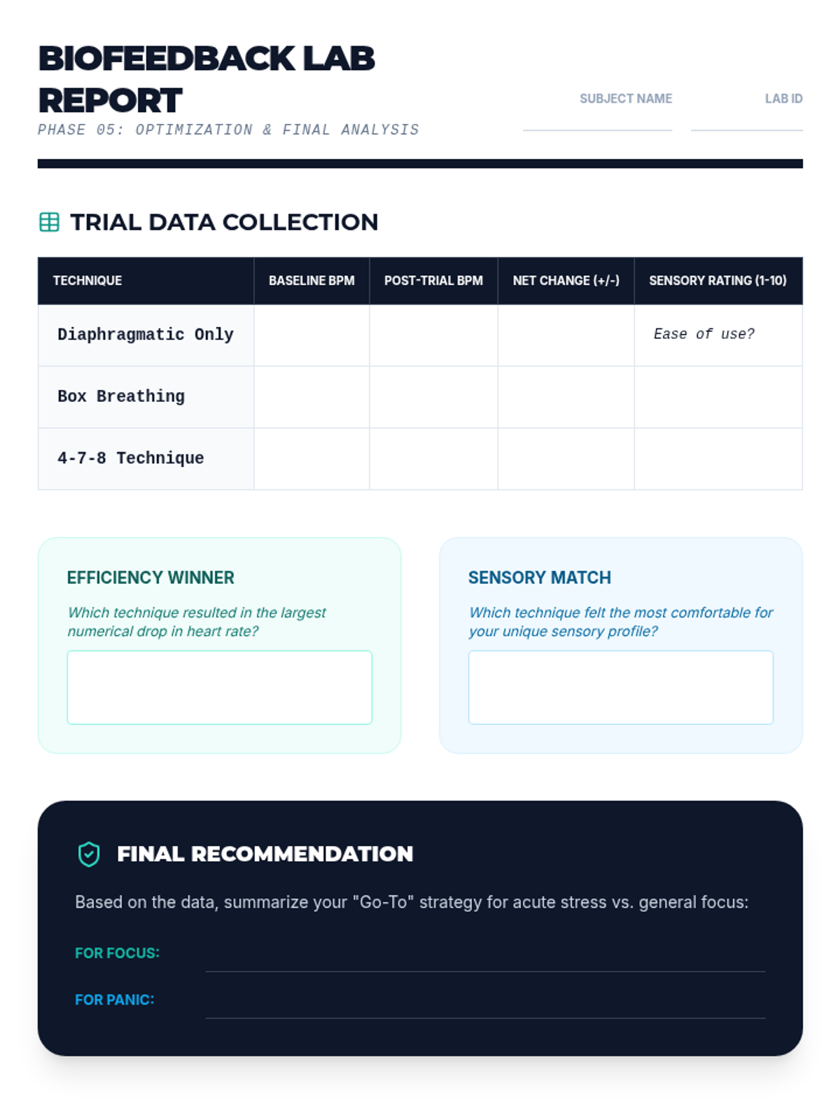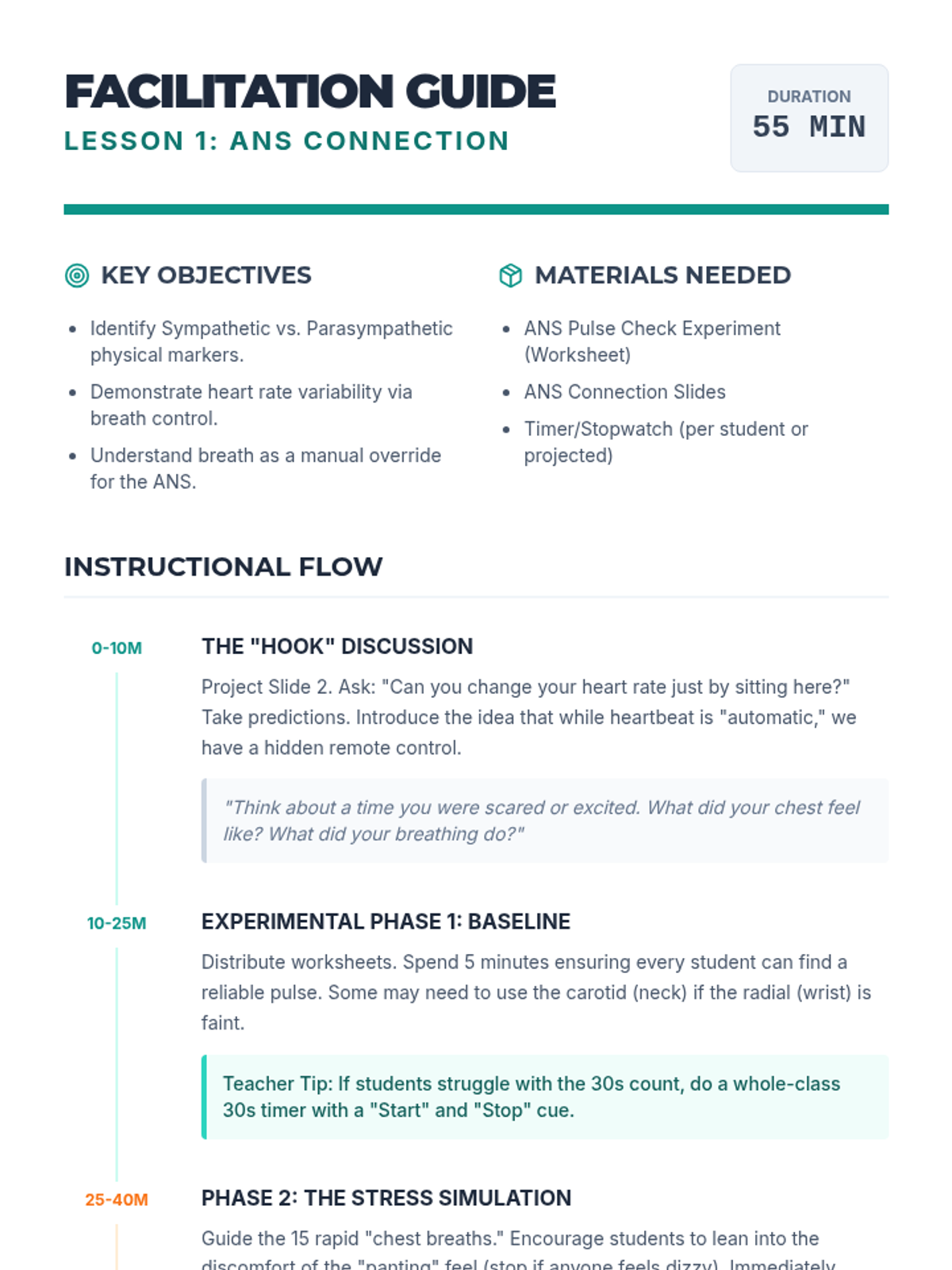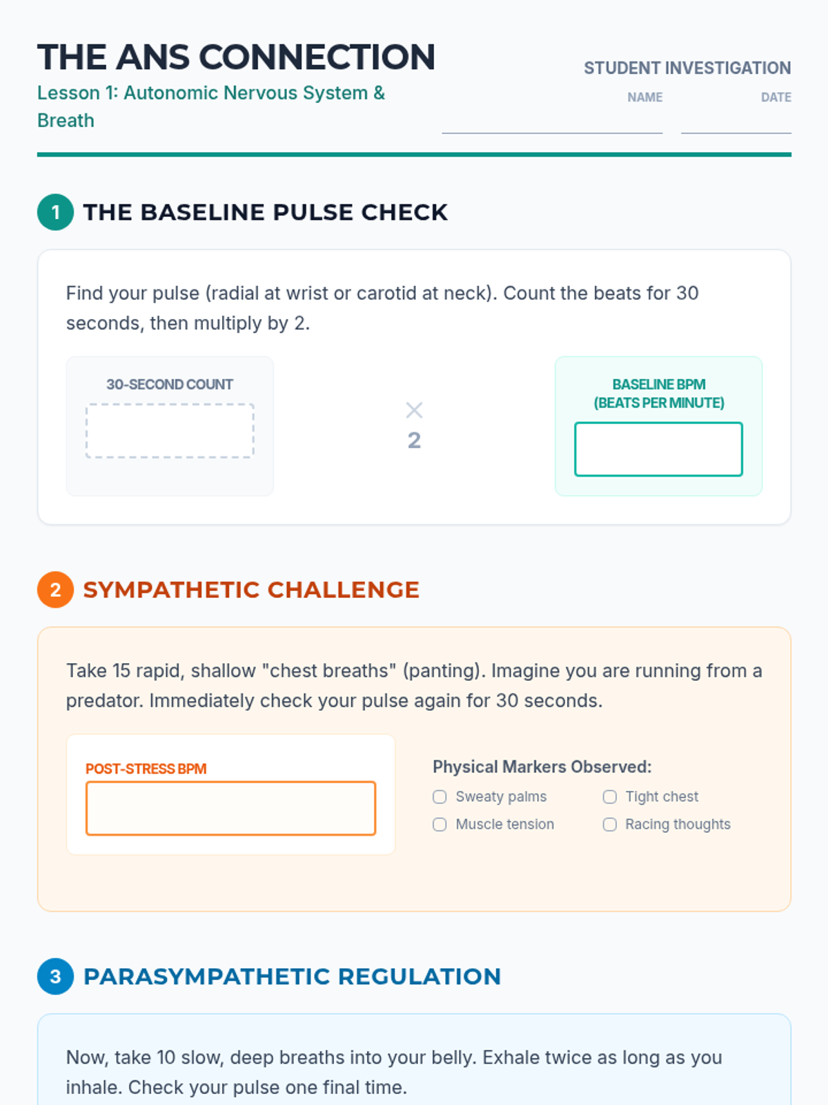 This sequence guides 12th-grade students through the physiological mechanisms of stress and relaxation. Students learn to manipulate their autonomic nervous system using specific breathing techniques like diaphragmatic, box, and 4-7-8 breathing, using biofeedback to personalize their regulation strategies.