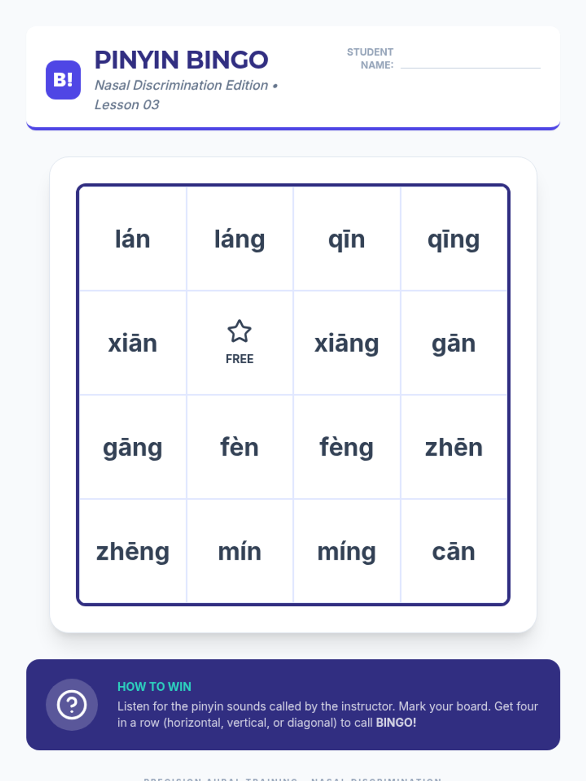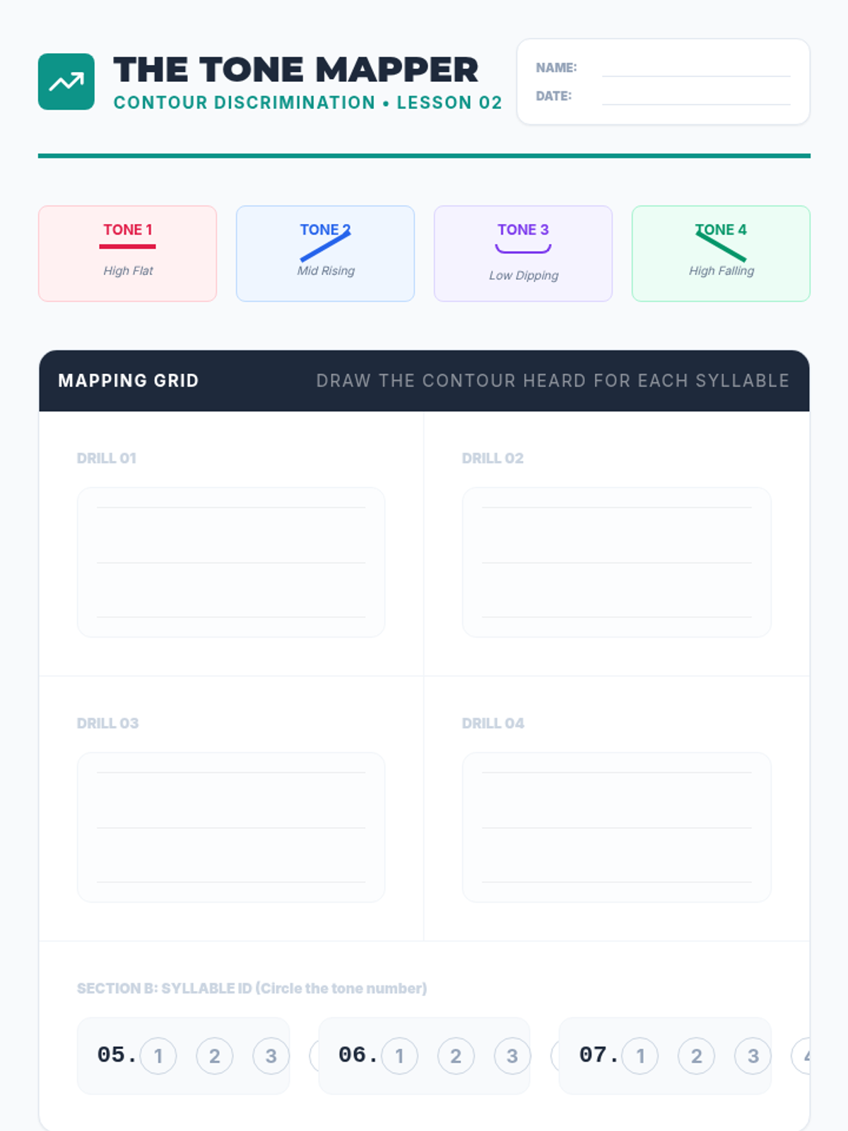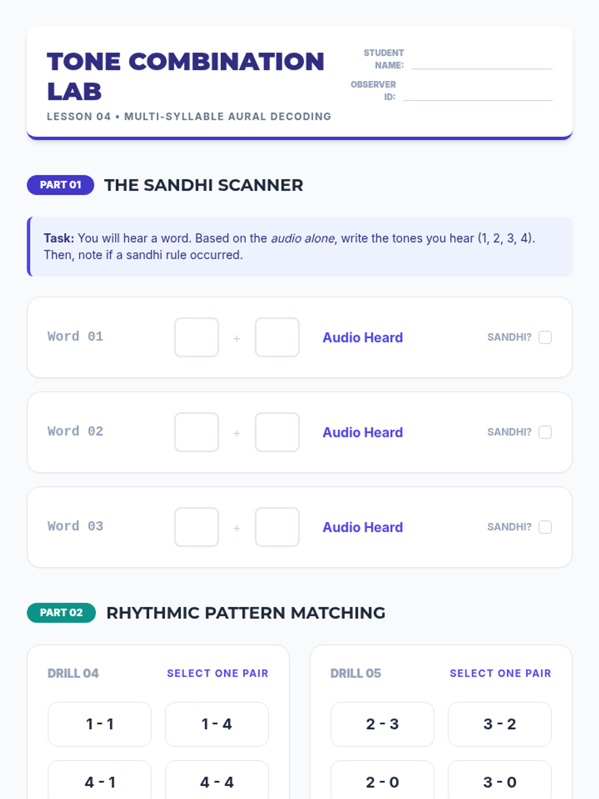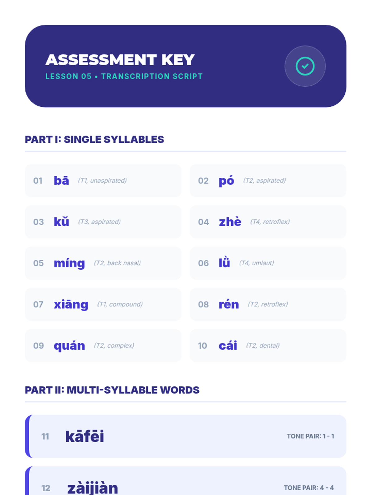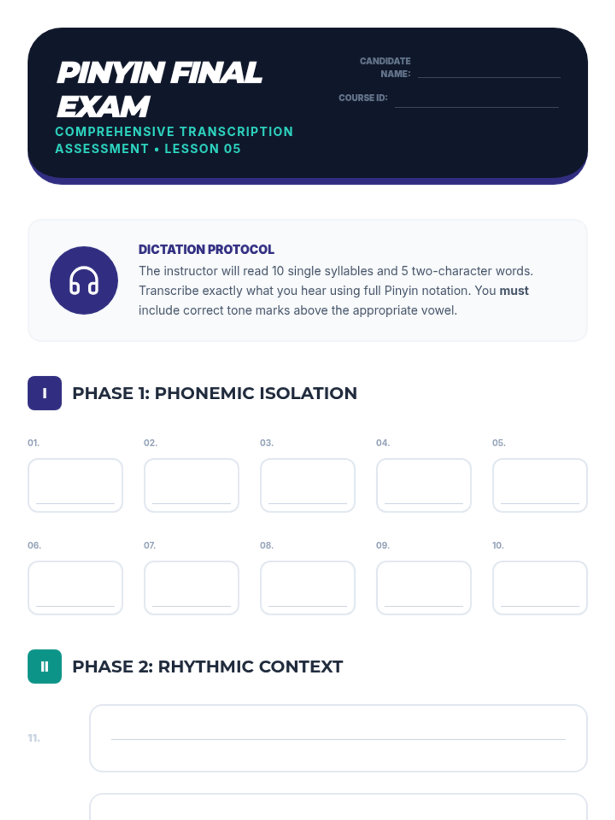 A foundational listening sequence for beginner Mandarin students, focusing on phonemic awareness, tone discrimination, and Pinyin transcription. Students progress from basic initials and finals to complex tone sandhi rules and full-word dictation.
