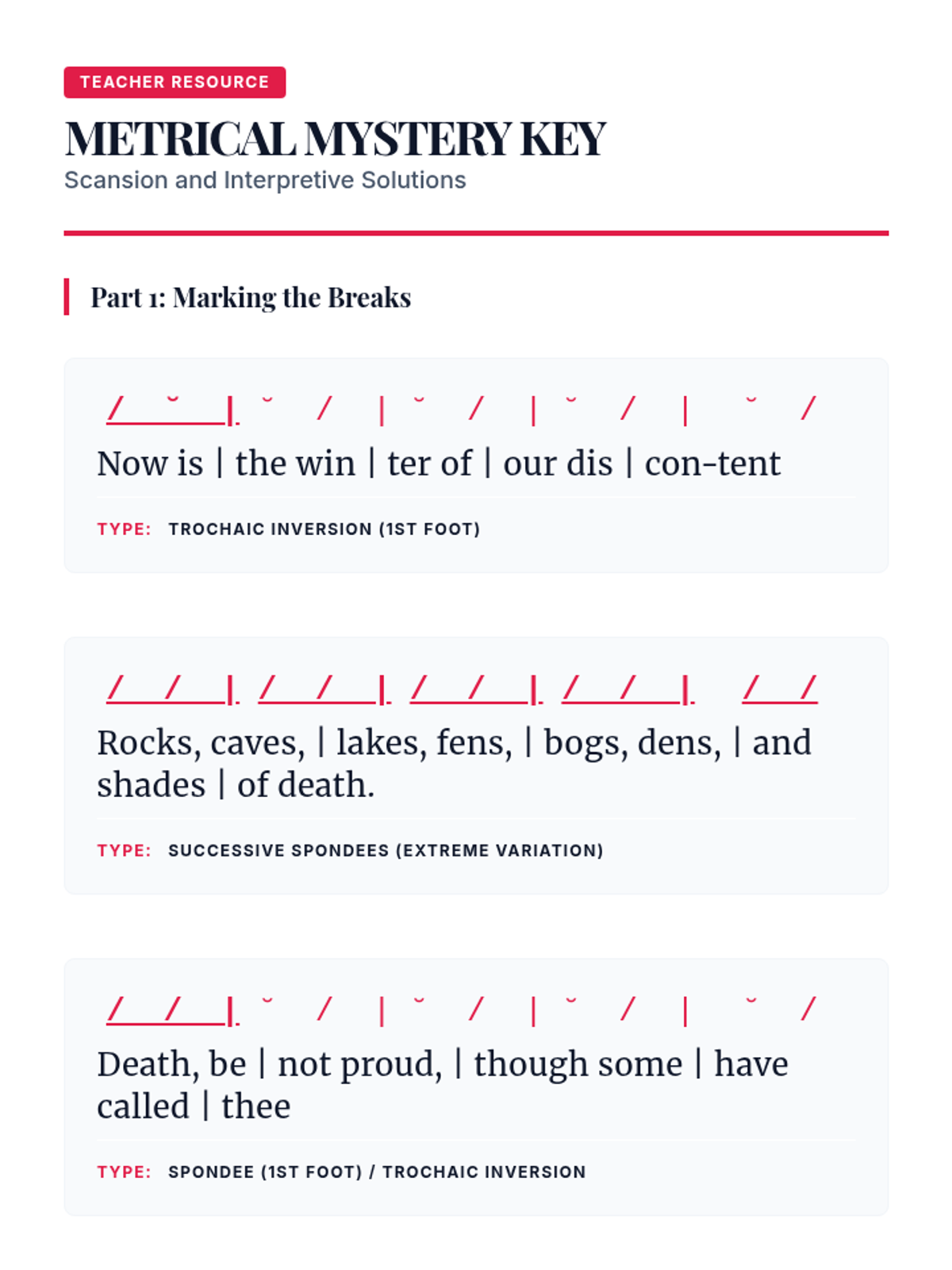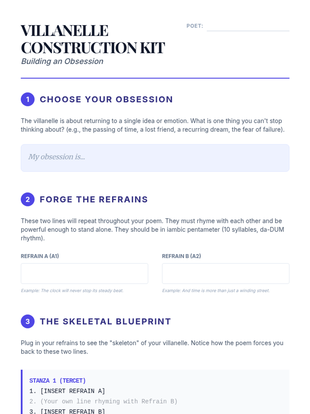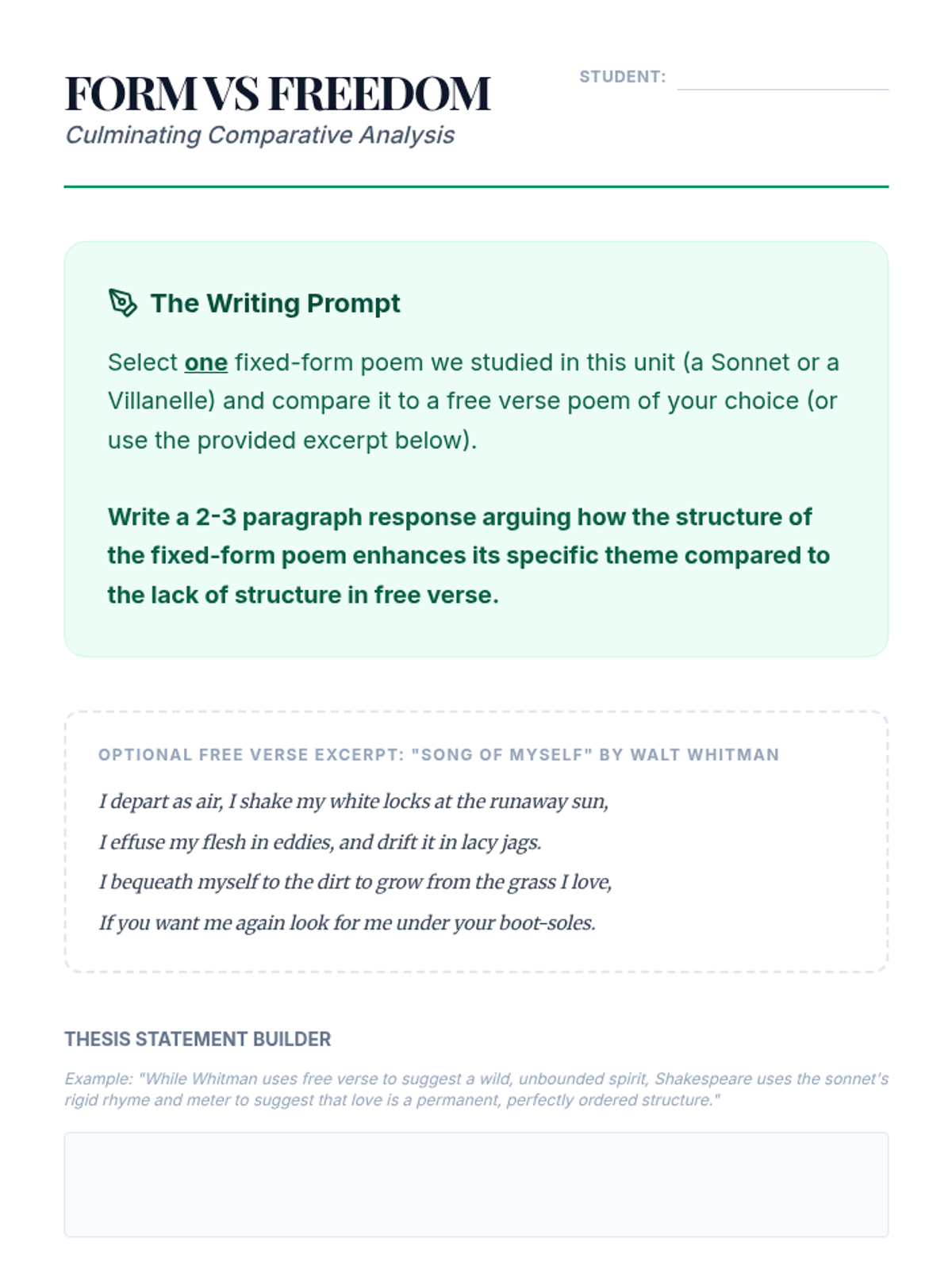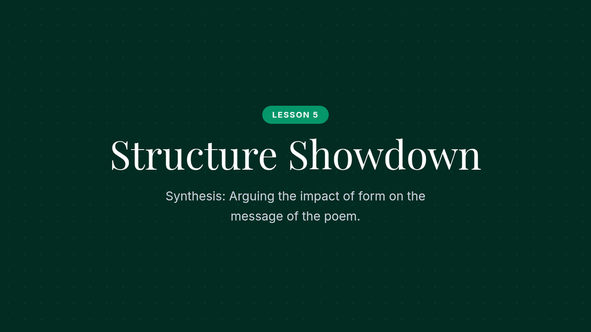 A comprehensive unit on the structural foundations of poetry, focusing on scansion, iambic pentameter, sonnets, and villanelles. Students analyze how rigid poetic forms like the sonnet and villanelle use constraint to build meaning and how metrical variations signal thematic shifts.