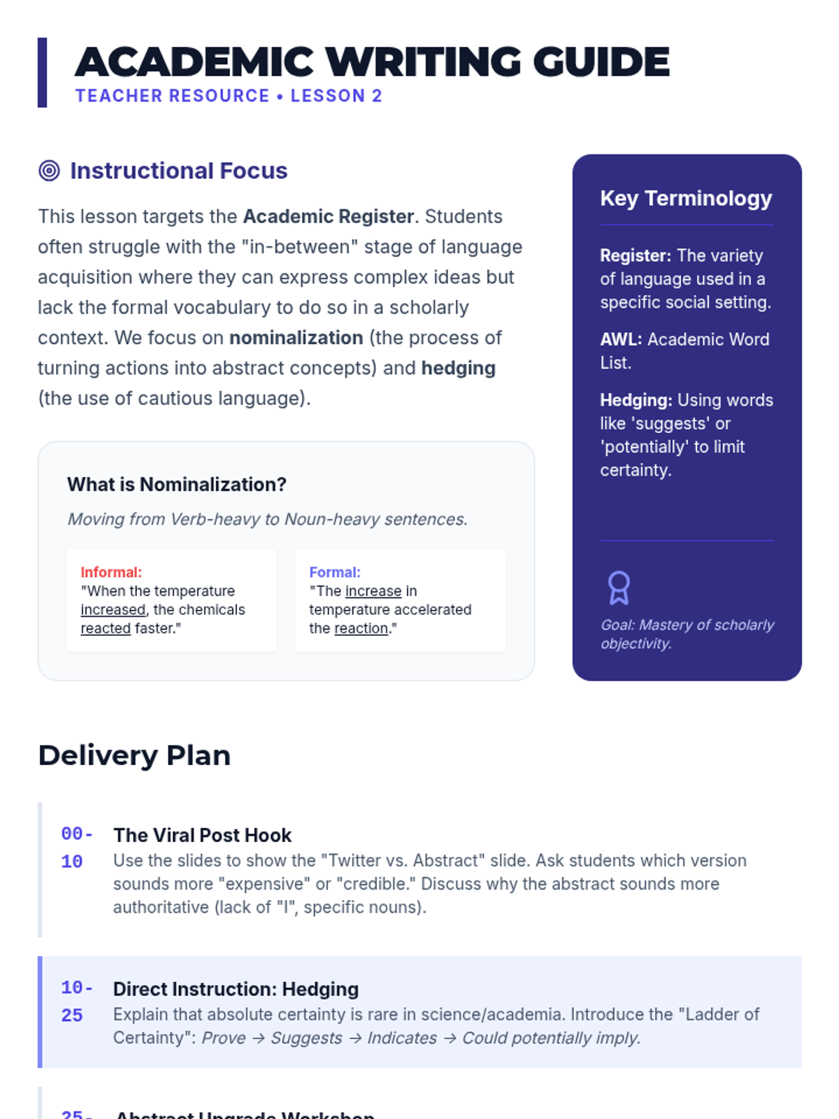 This sequence equips intermediate ESL students with the linguistic and cognitive tools needed to navigate university lectures. It covers discourse markers, hierarchy of information, identifying tangents, note-taking systems, and synthesizing long-form academic speech.