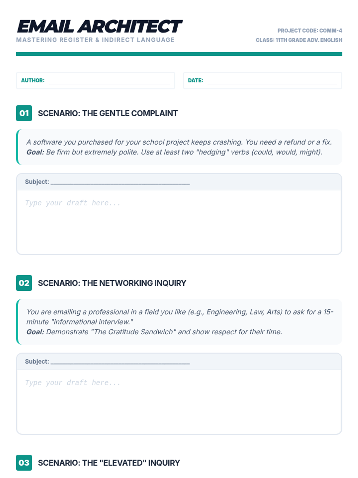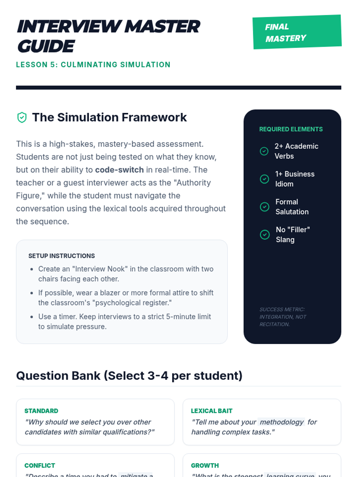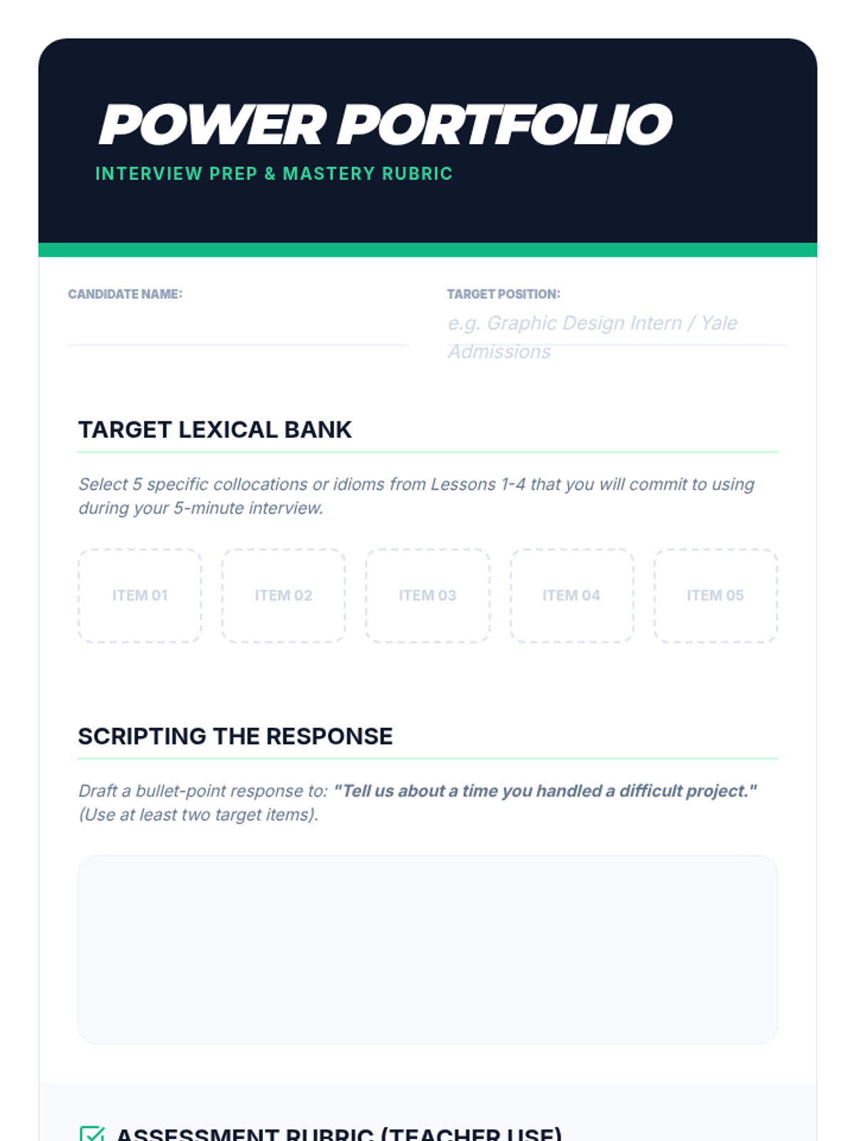 This sequence immerses 11th-grade students in the nuances of advanced English, focusing on professional collocations, academic register, and workplace idioms to build authority and credibility in communication.