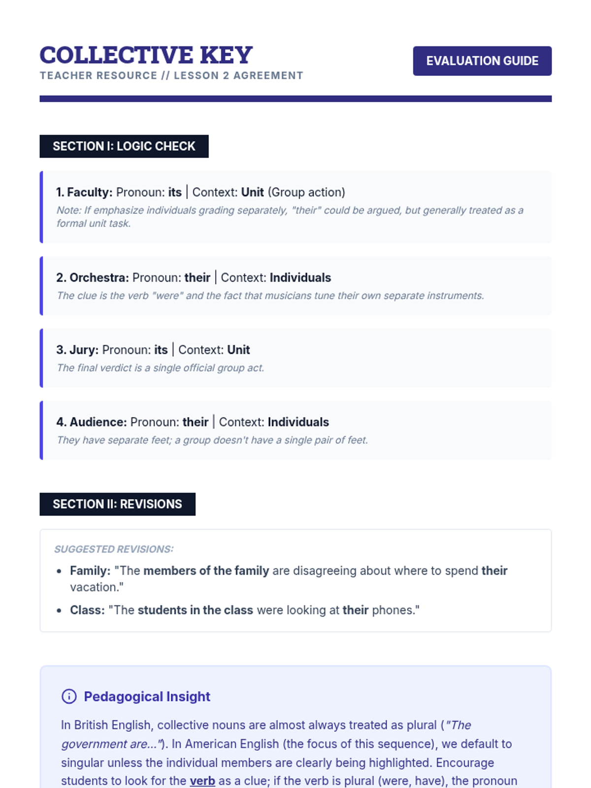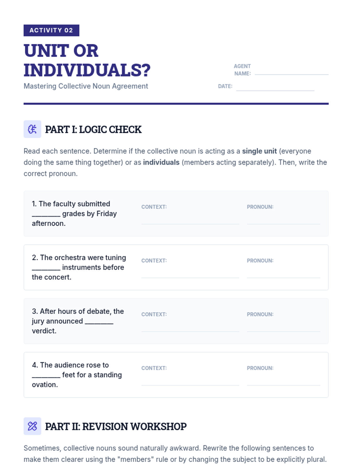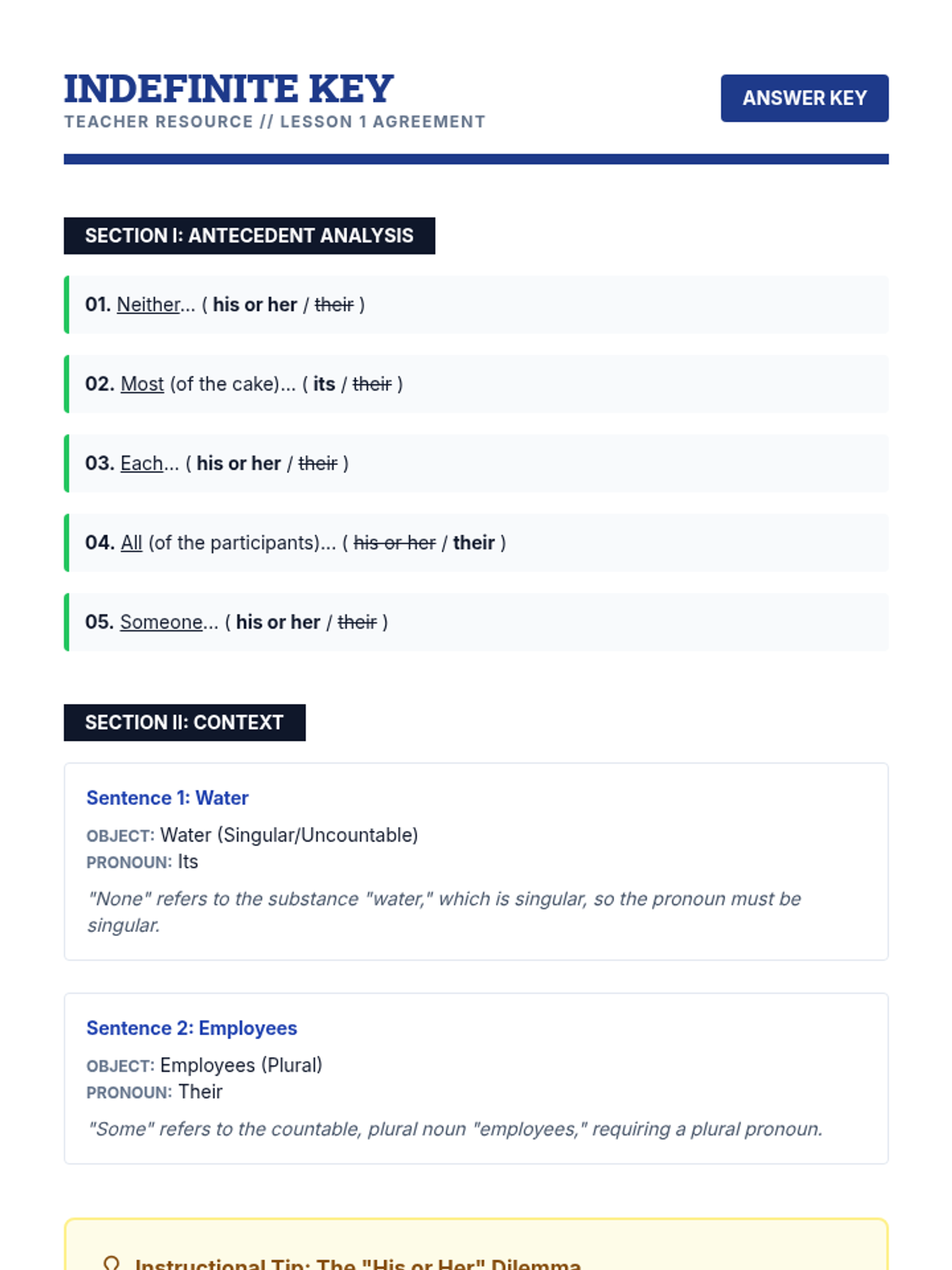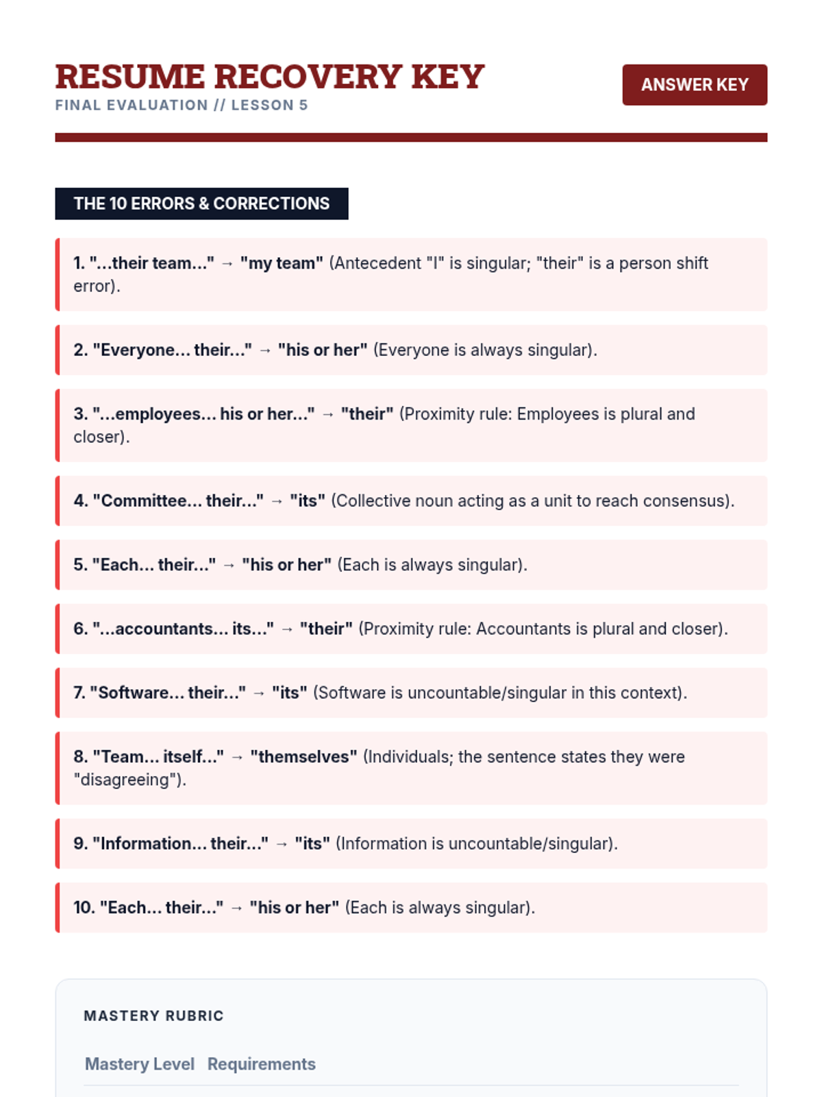 A comprehensive 10th-grade grammar unit focusing on pronoun-antecedent agreement in complex sentence structures, covering indefinite pronouns, collective nouns, correlative conjunctions, and modern usage of the singular 'they'.