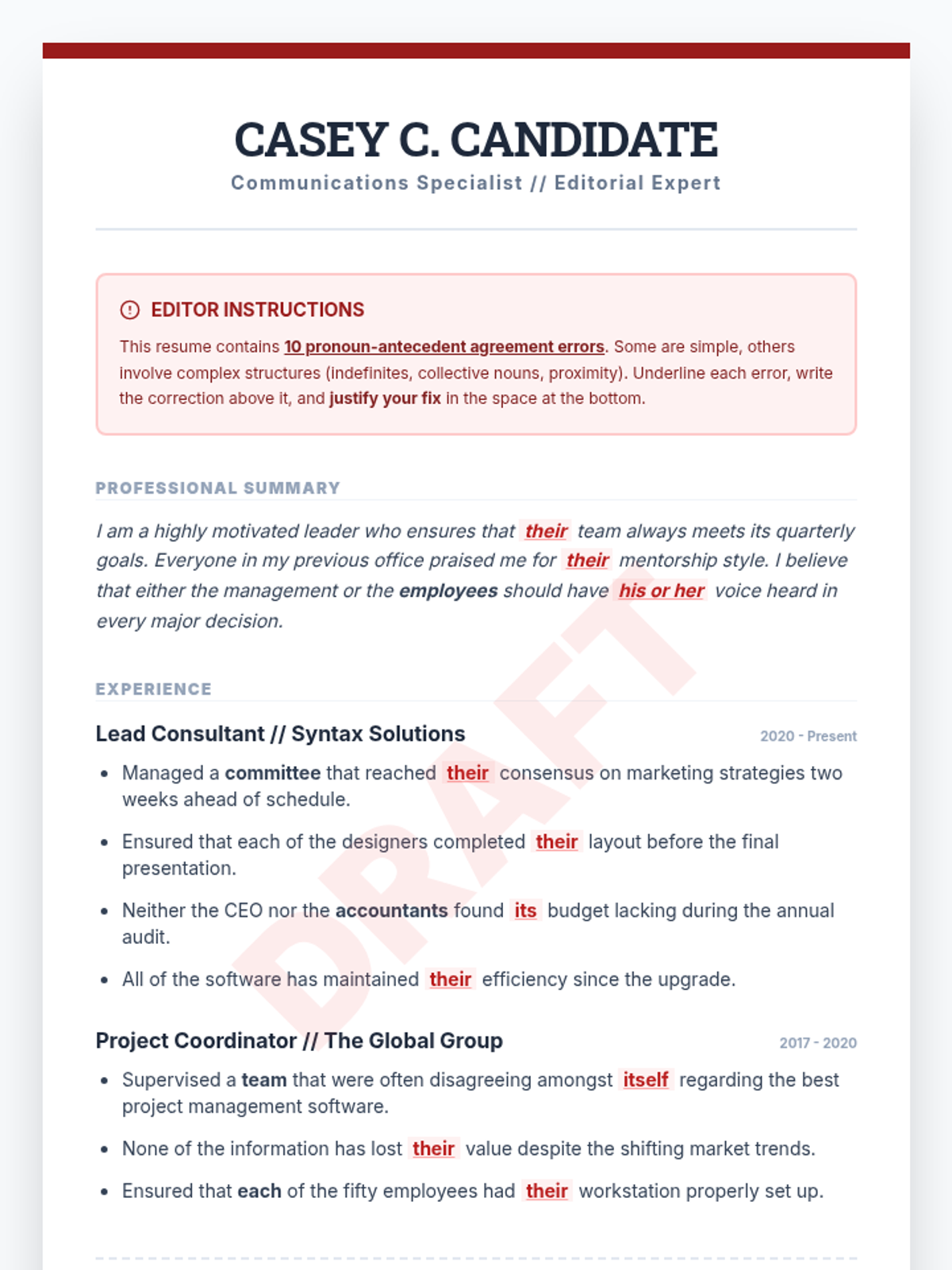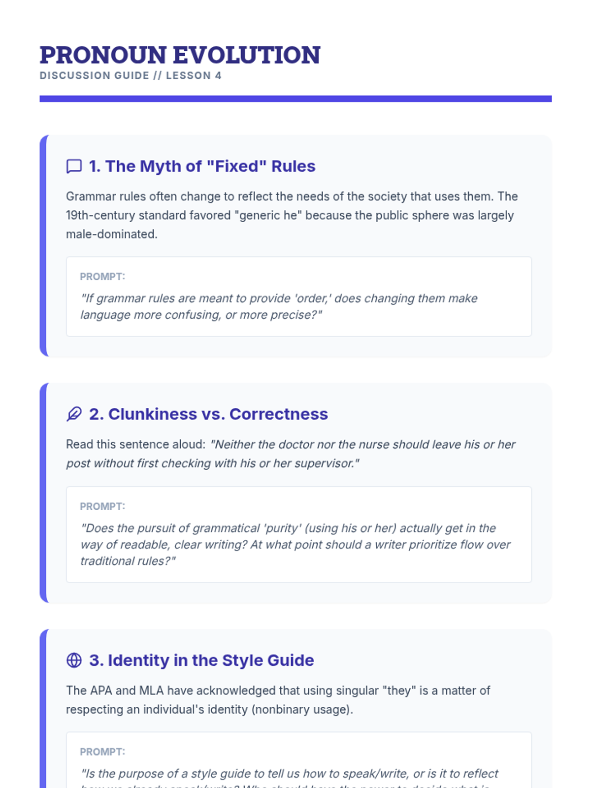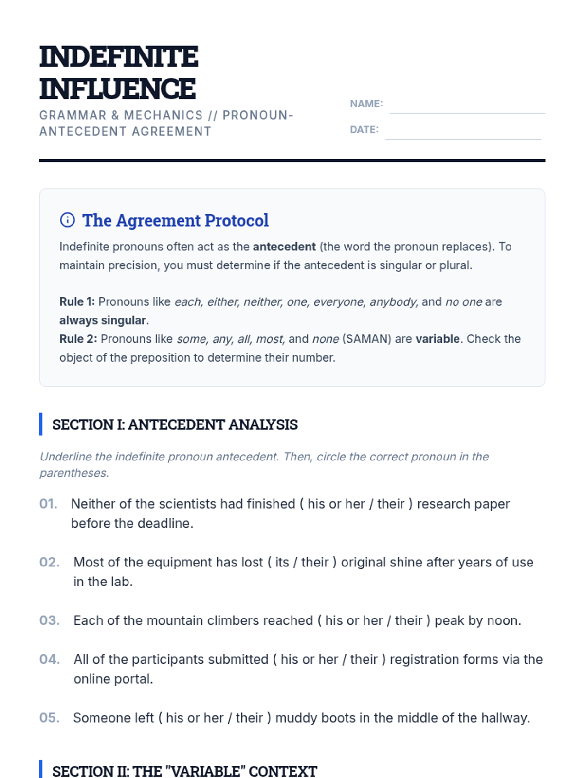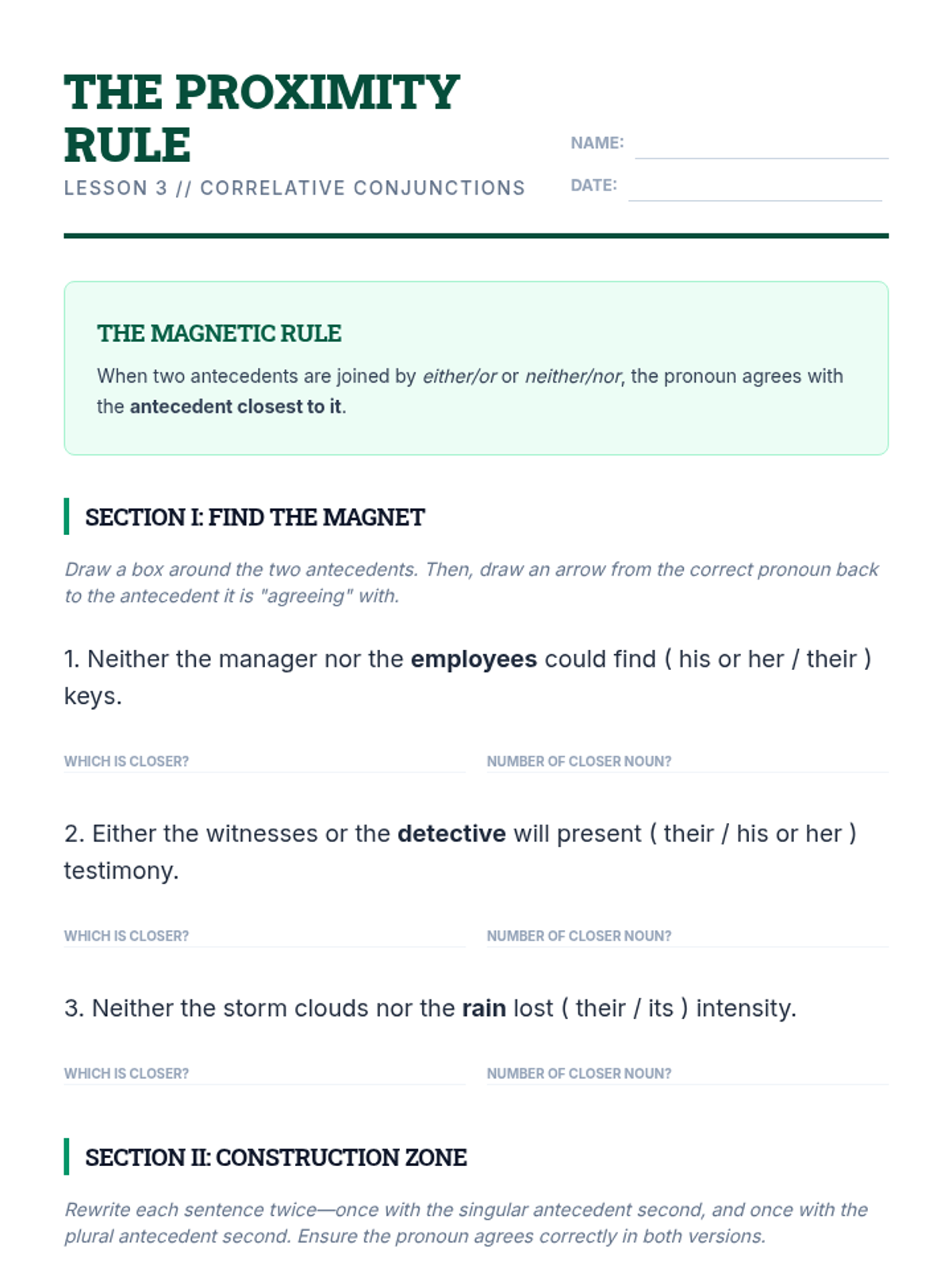 A comprehensive 10th-grade grammar unit focusing on pronoun-antecedent agreement in complex sentence structures, covering indefinite pronouns, collective nouns, correlative conjunctions, and modern usage of the singular 'they'.