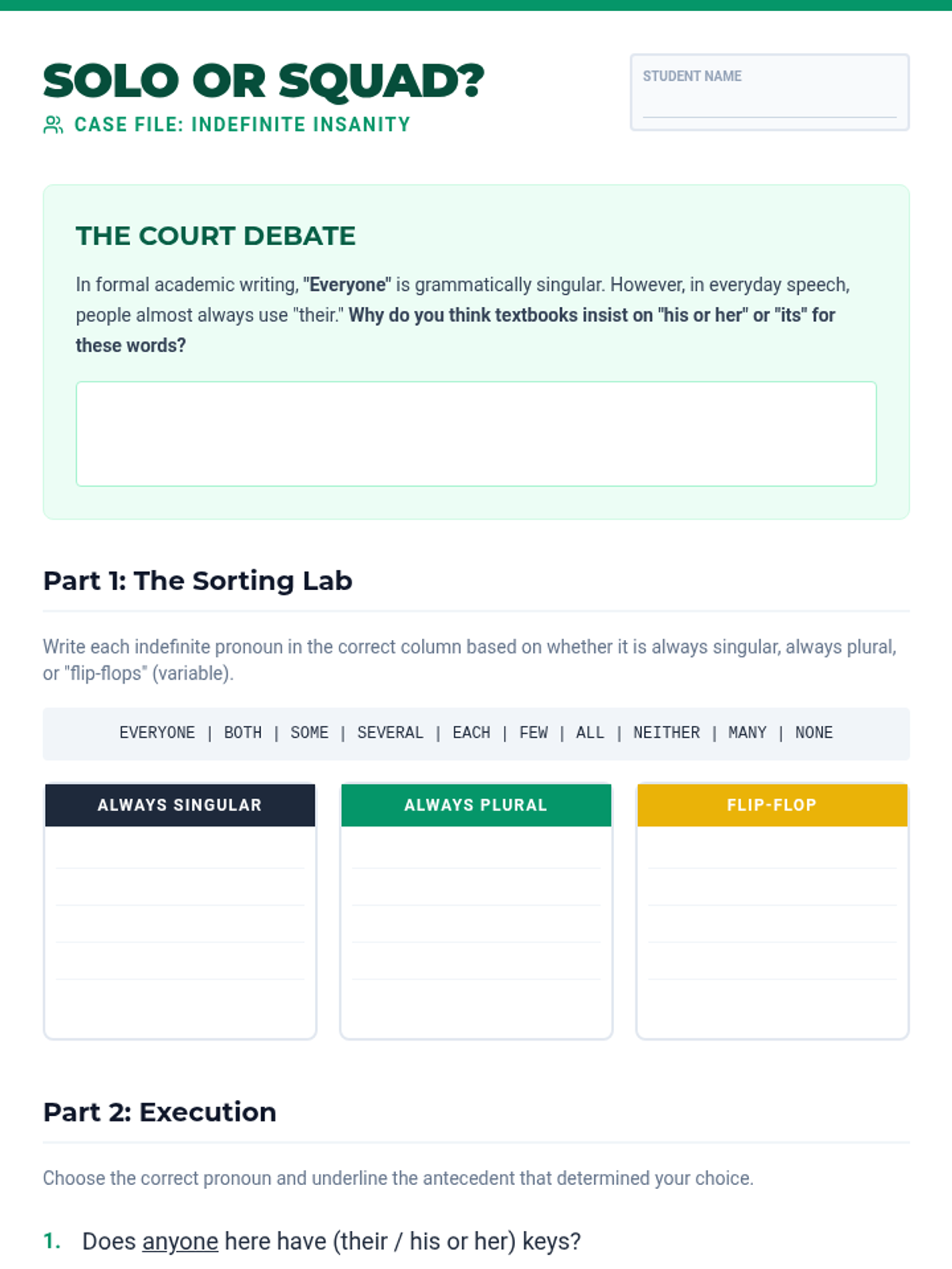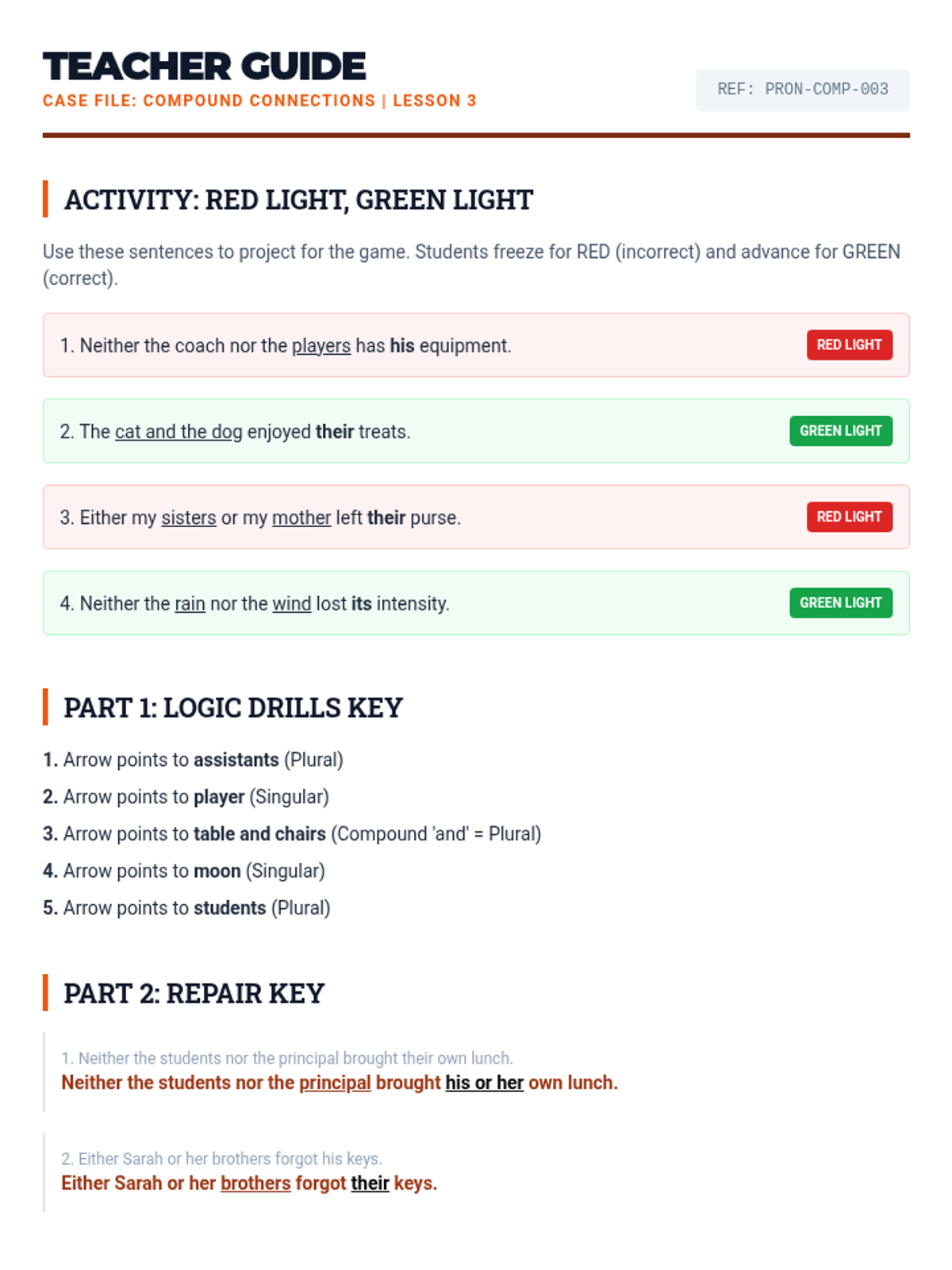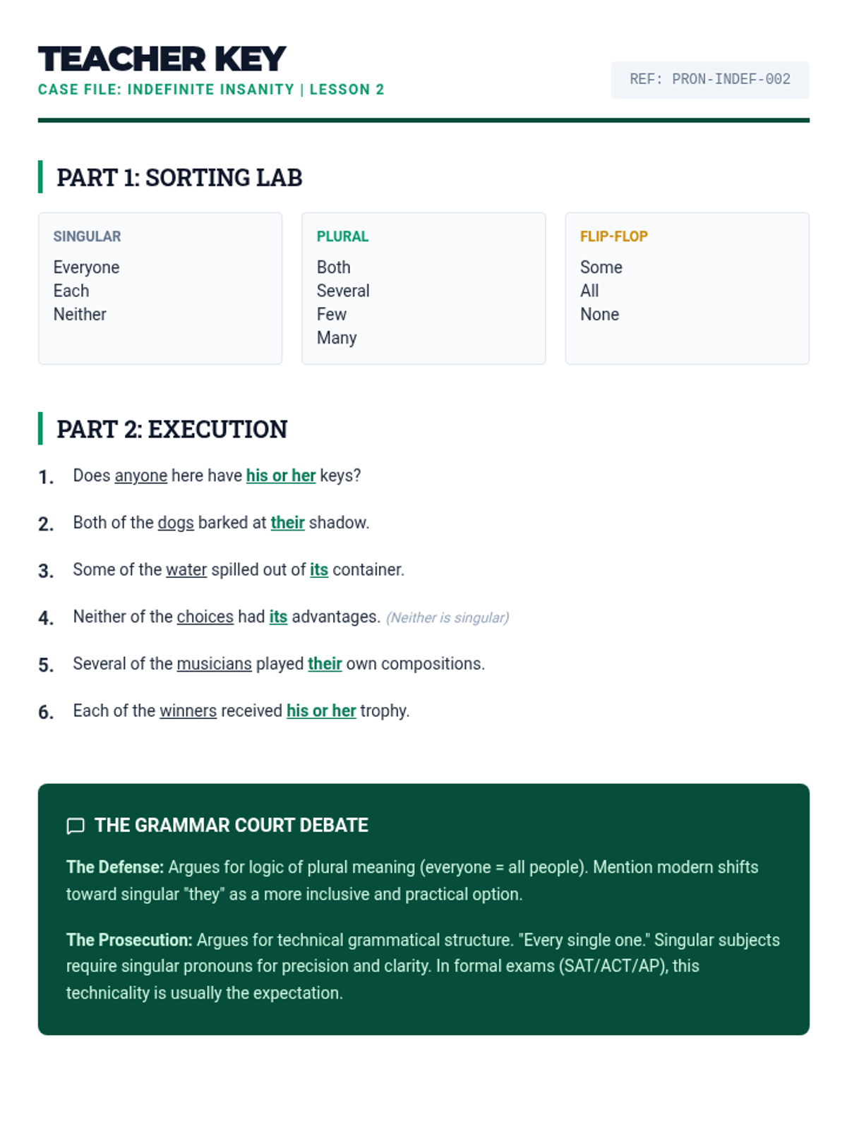 A comprehensive 9th-grade grammar sequence focusing on the complexities of pronoun-antecedent agreement, from basic number and gender to challenging cases with indefinite pronouns, compound subjects, and collective nouns.