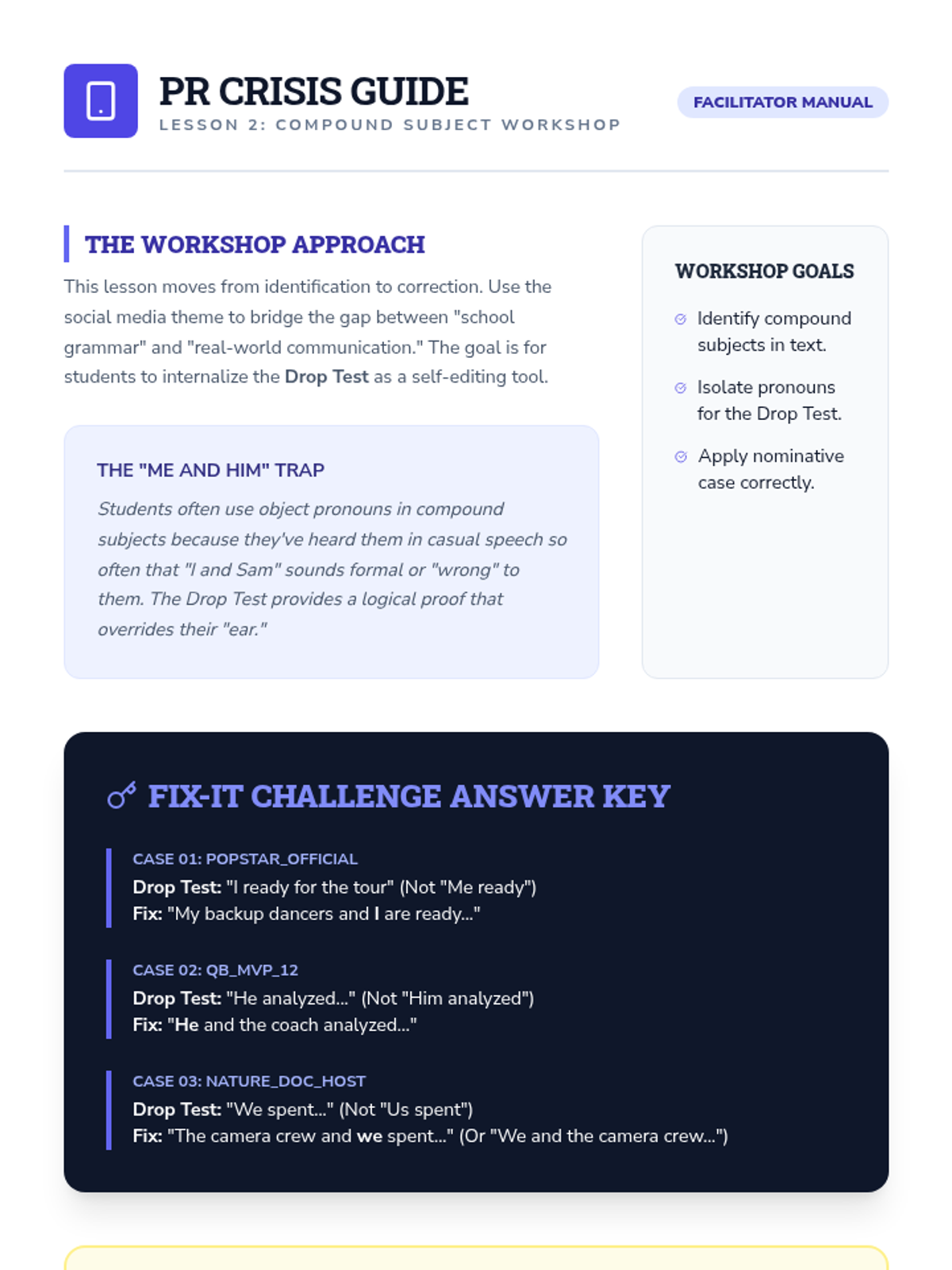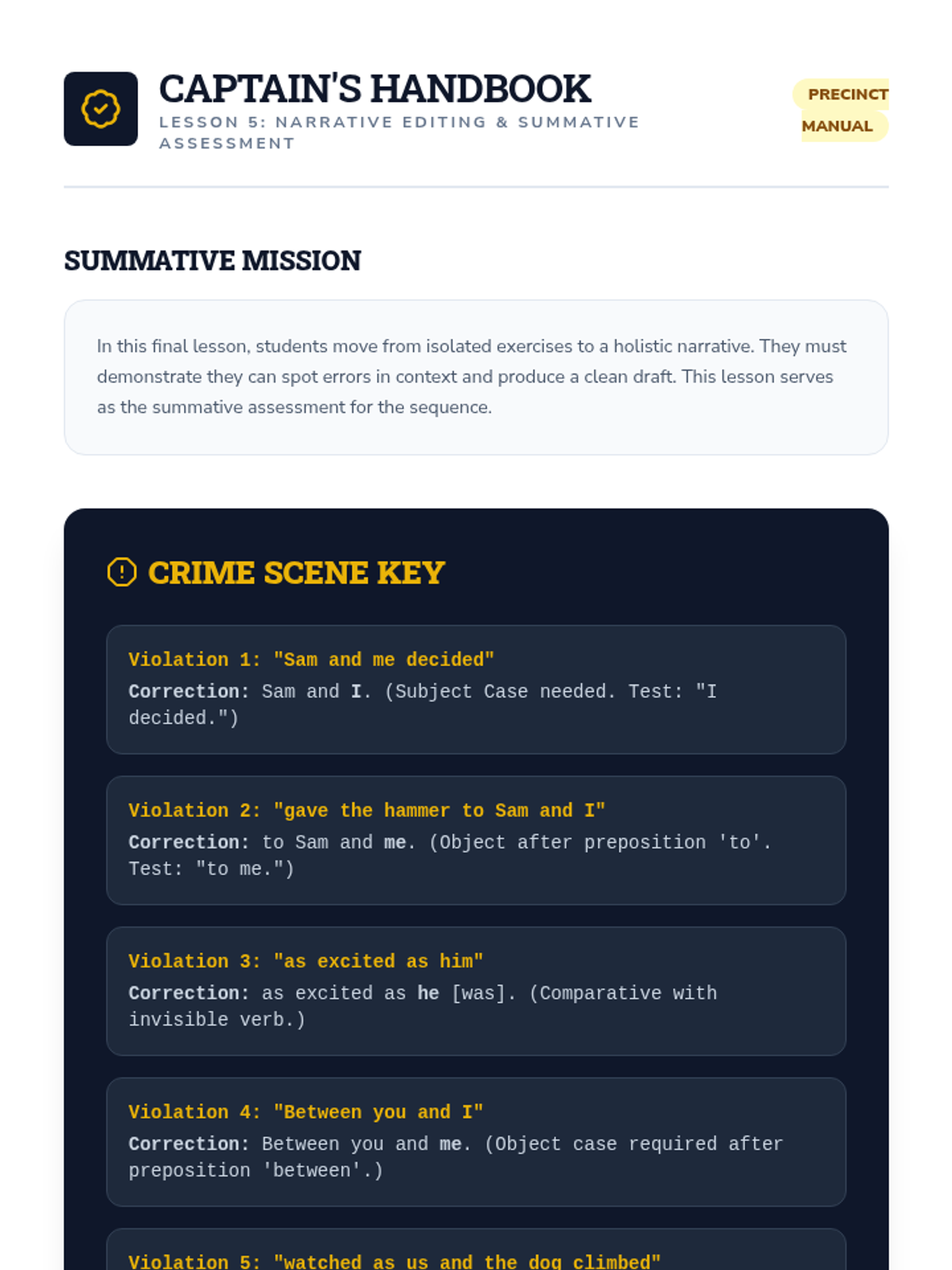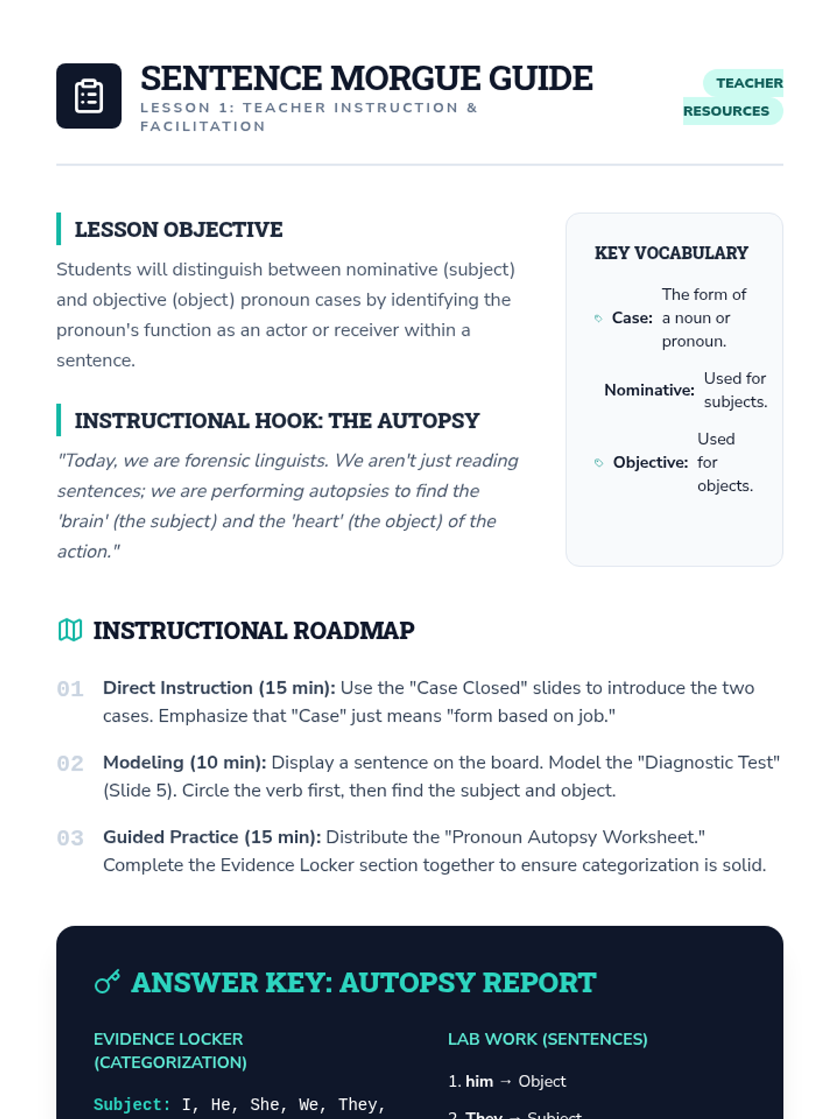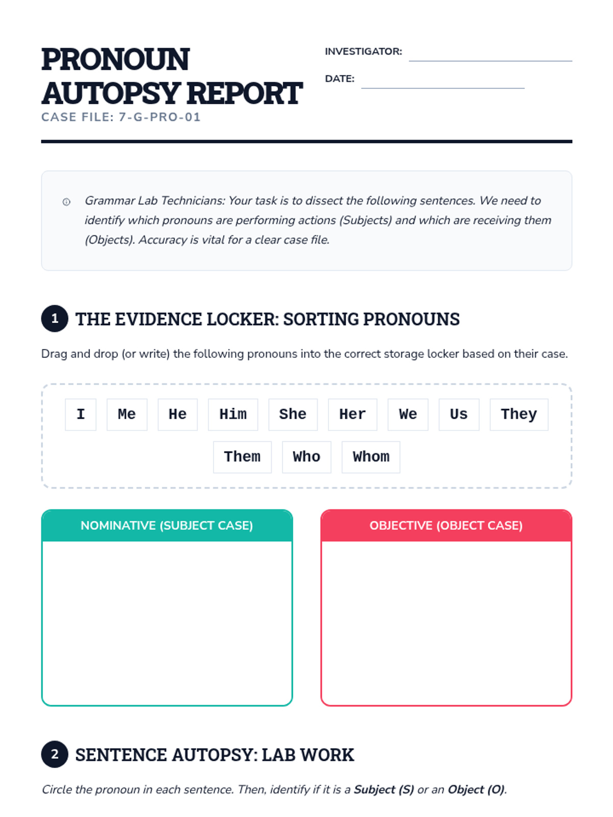 A comprehensive 5-lesson sequence for 7th-grade students focused on mastering subject and object pronoun cases, moving from basic categorization to complex compound structures and elliptical comparisons.