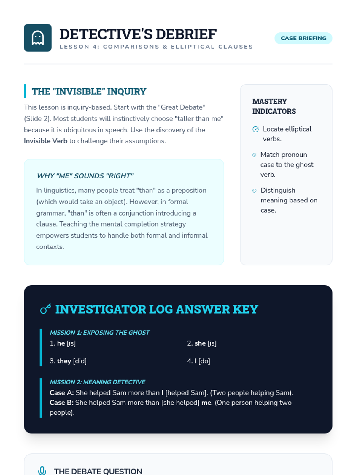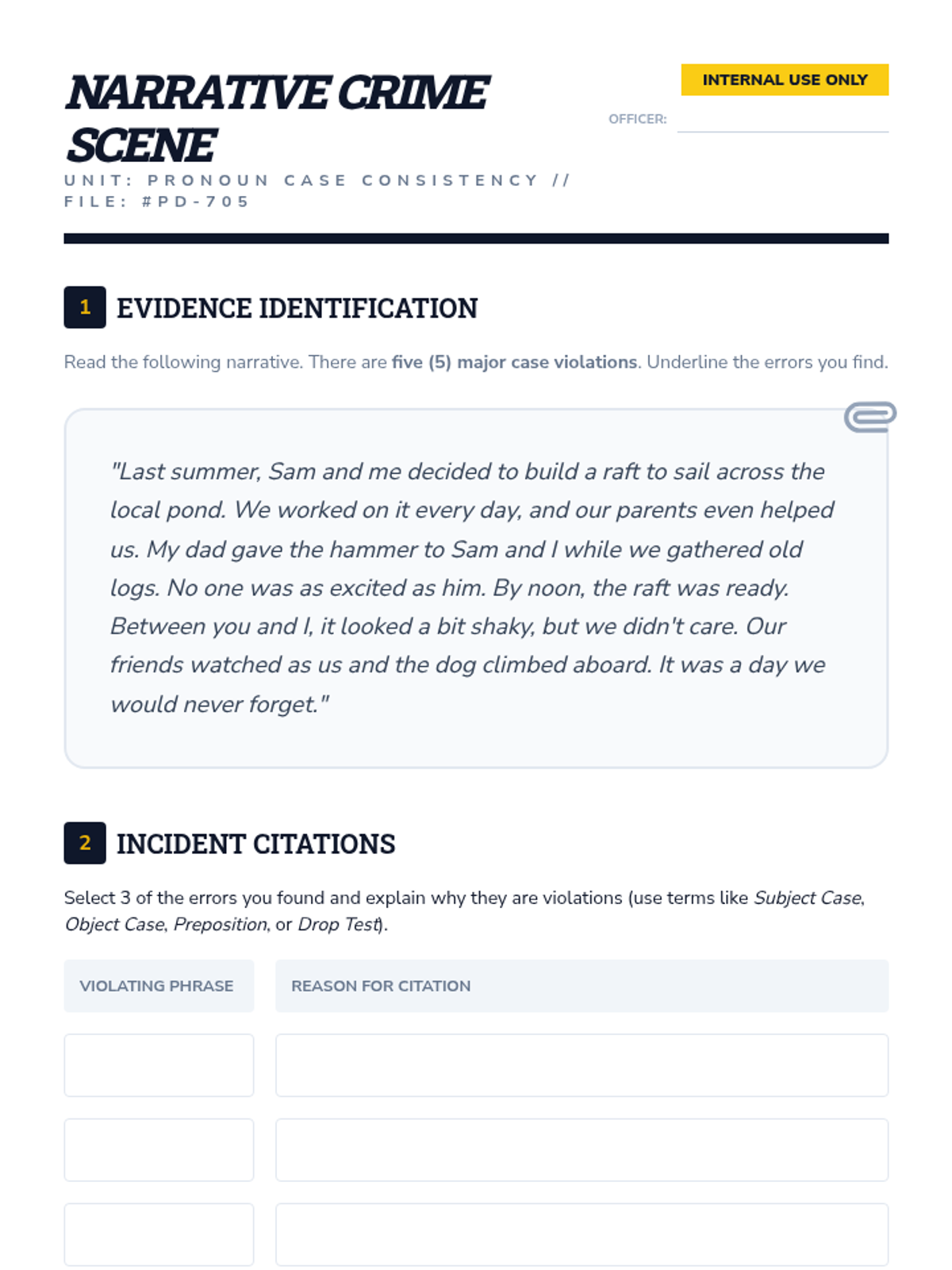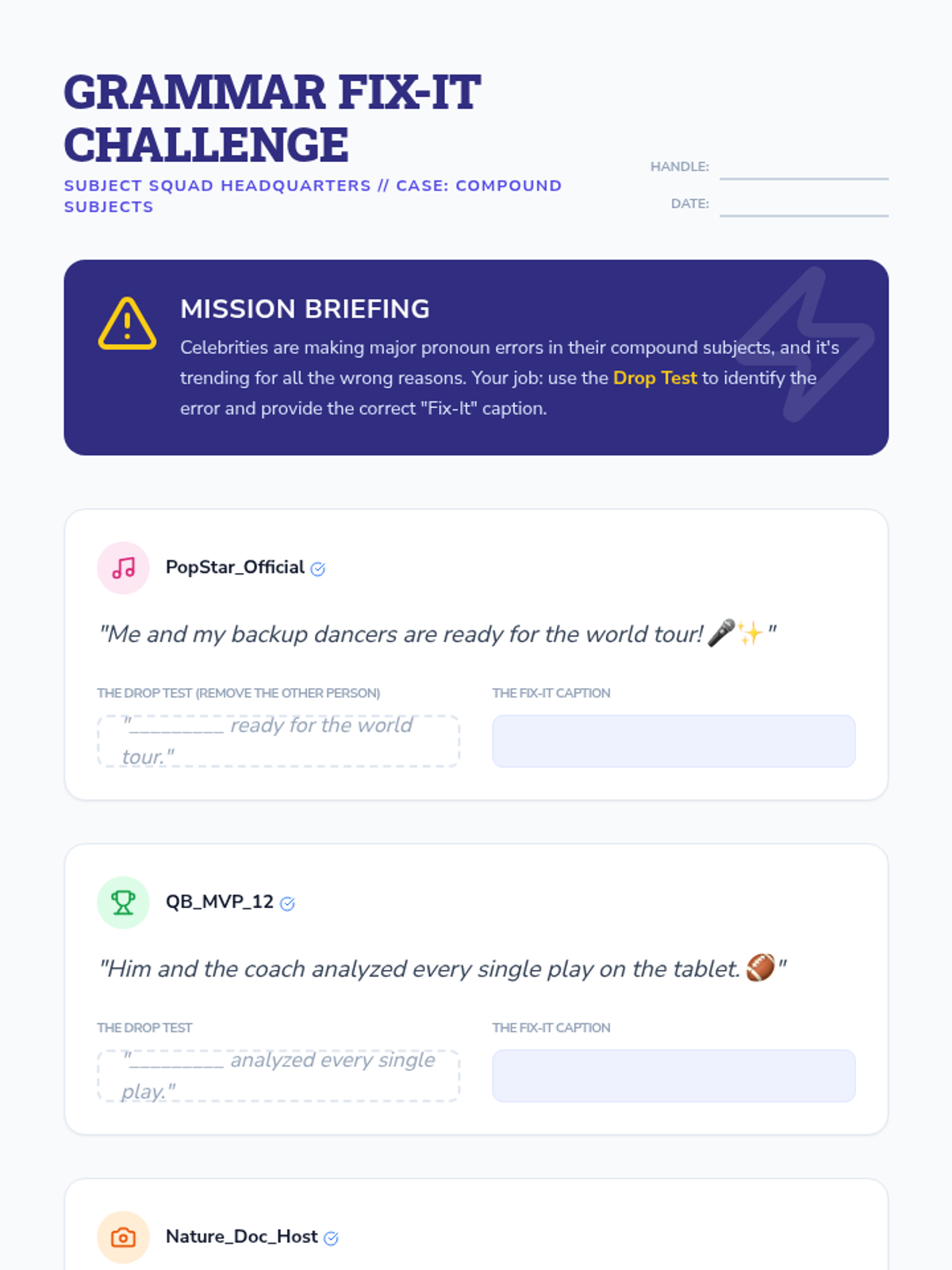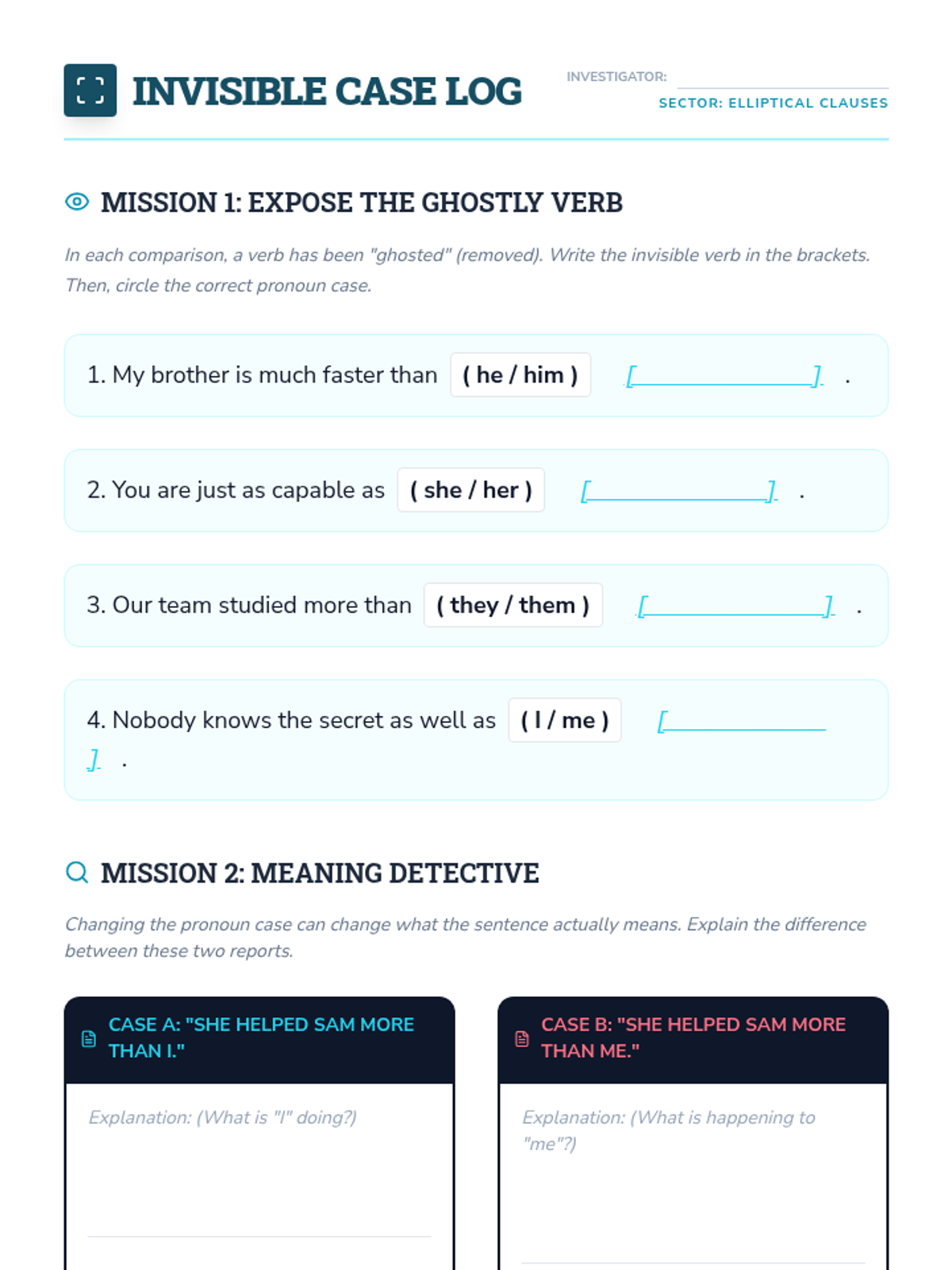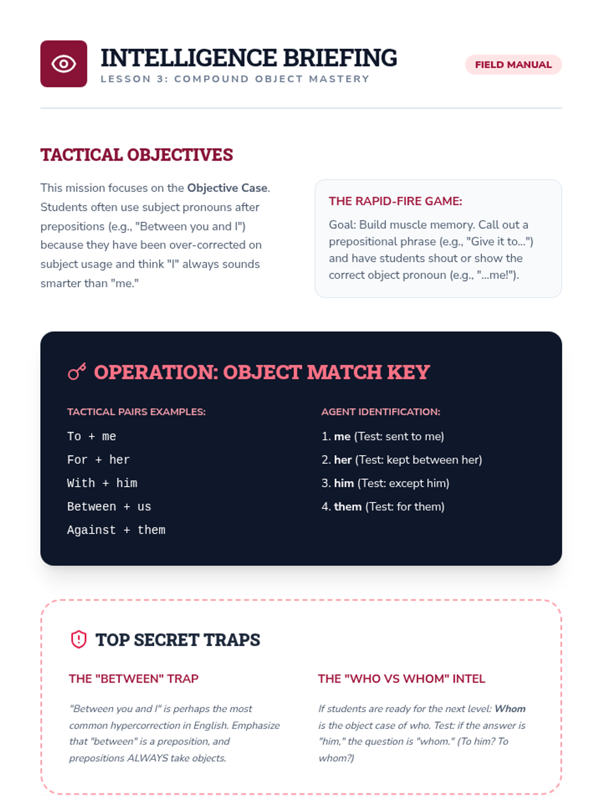 A comprehensive 5-lesson sequence for 7th-grade students focused on mastering subject and object pronoun cases, moving from basic categorization to complex compound structures and elliptical comparisons.