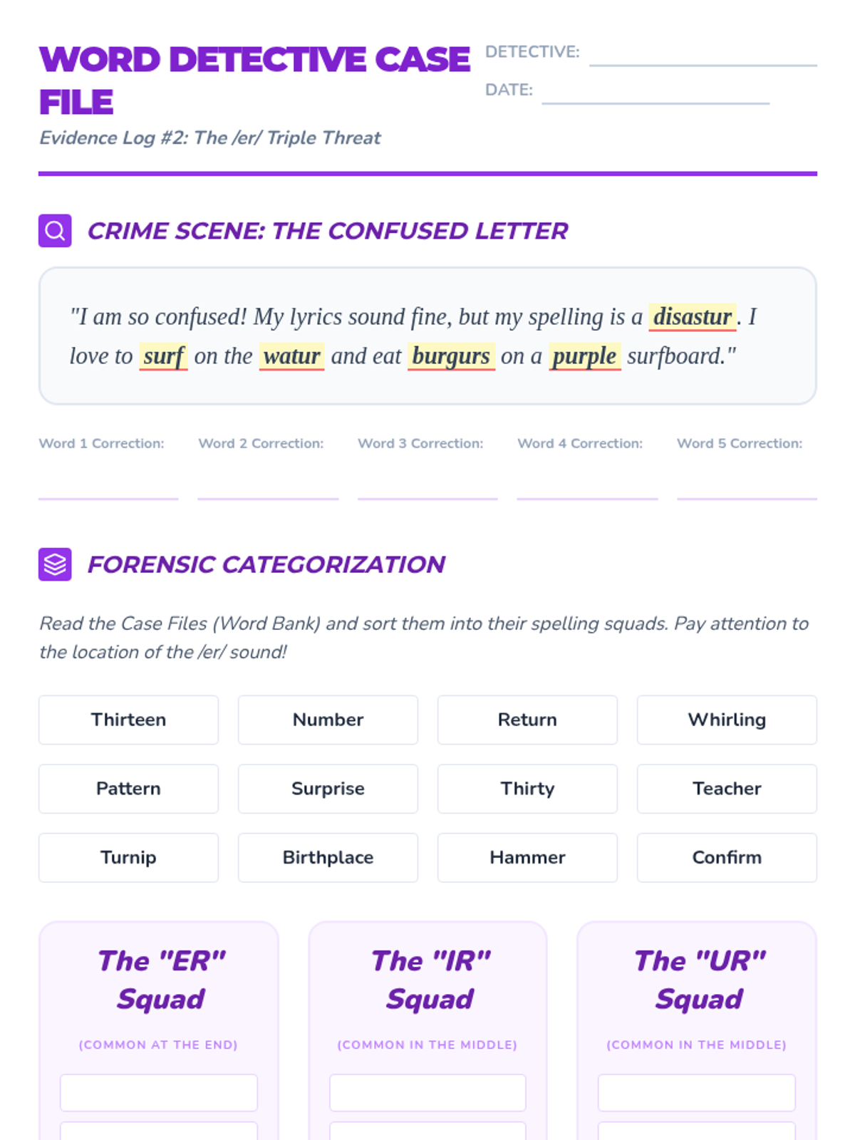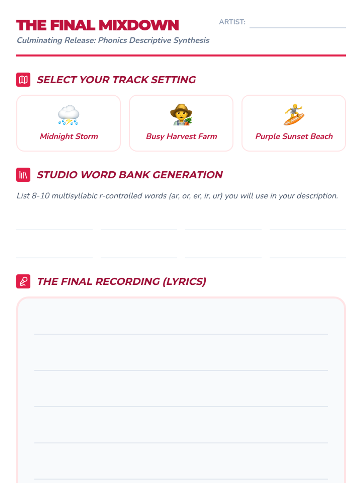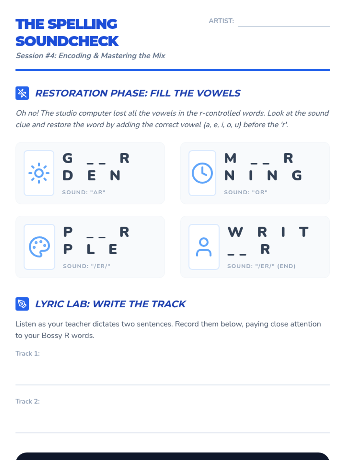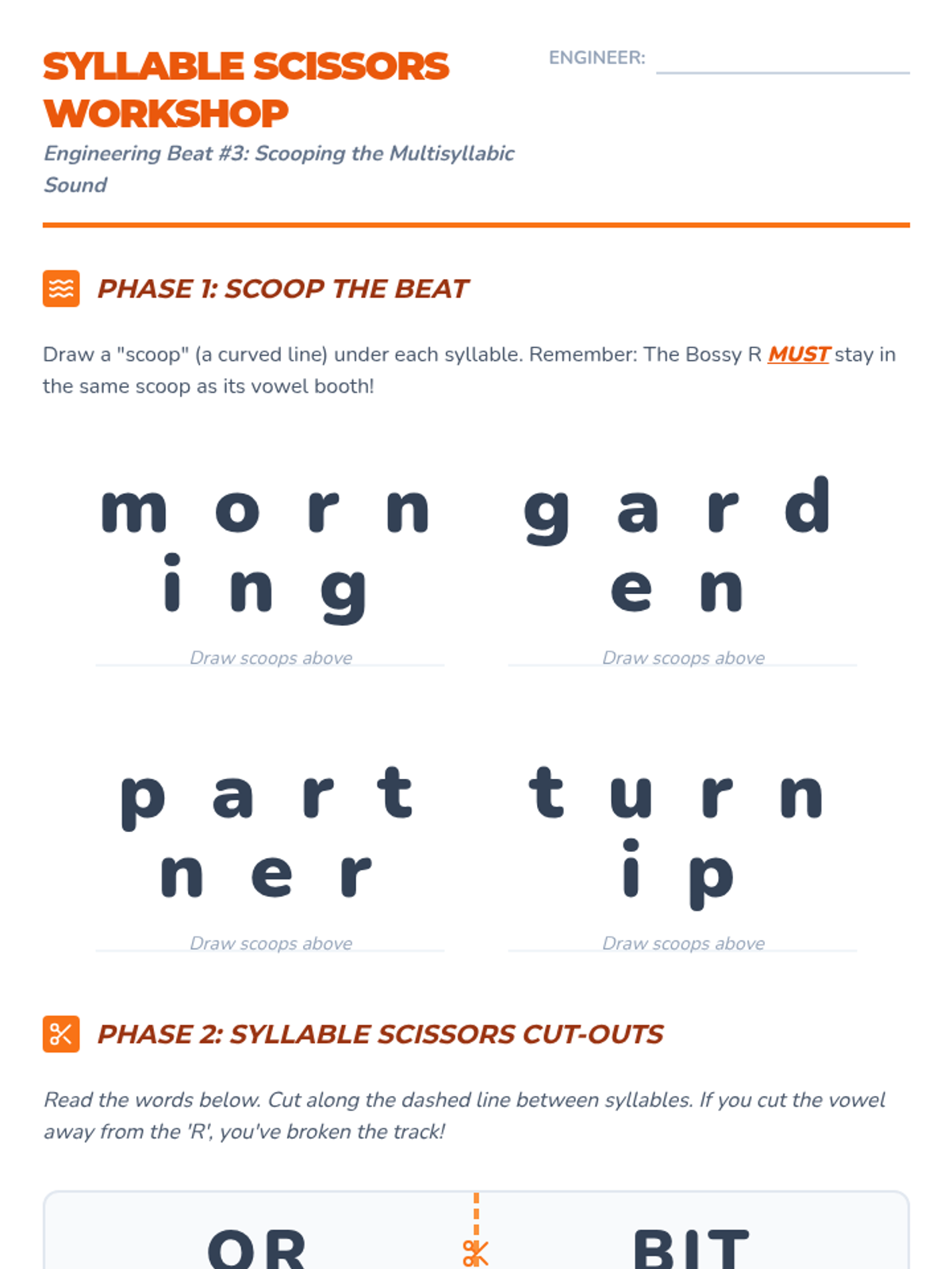A comprehensive 3rd-grade sequence focused on decoding and encoding multisyllabic r-controlled vowel words through an inquiry-based 'Bossy R Studio' theme. Students progress from auditory discrimination to complex syllabication and descriptive writing.