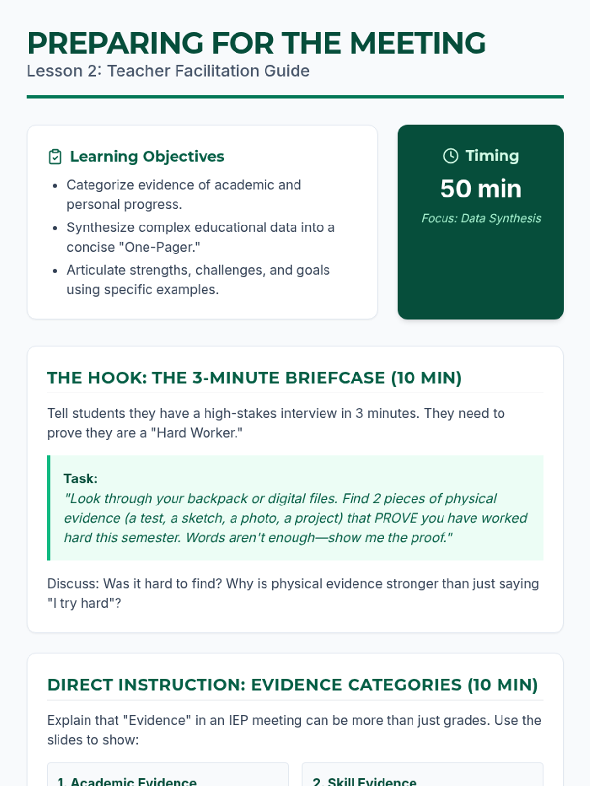 A comprehensive unit designed to empower 10th-grade students to lead their own IEP meetings. Students transition from passive attendees to active facilitators by learning team roles, preparing evidence-based summaries, practicing professional communication, and simulating the meeting process.