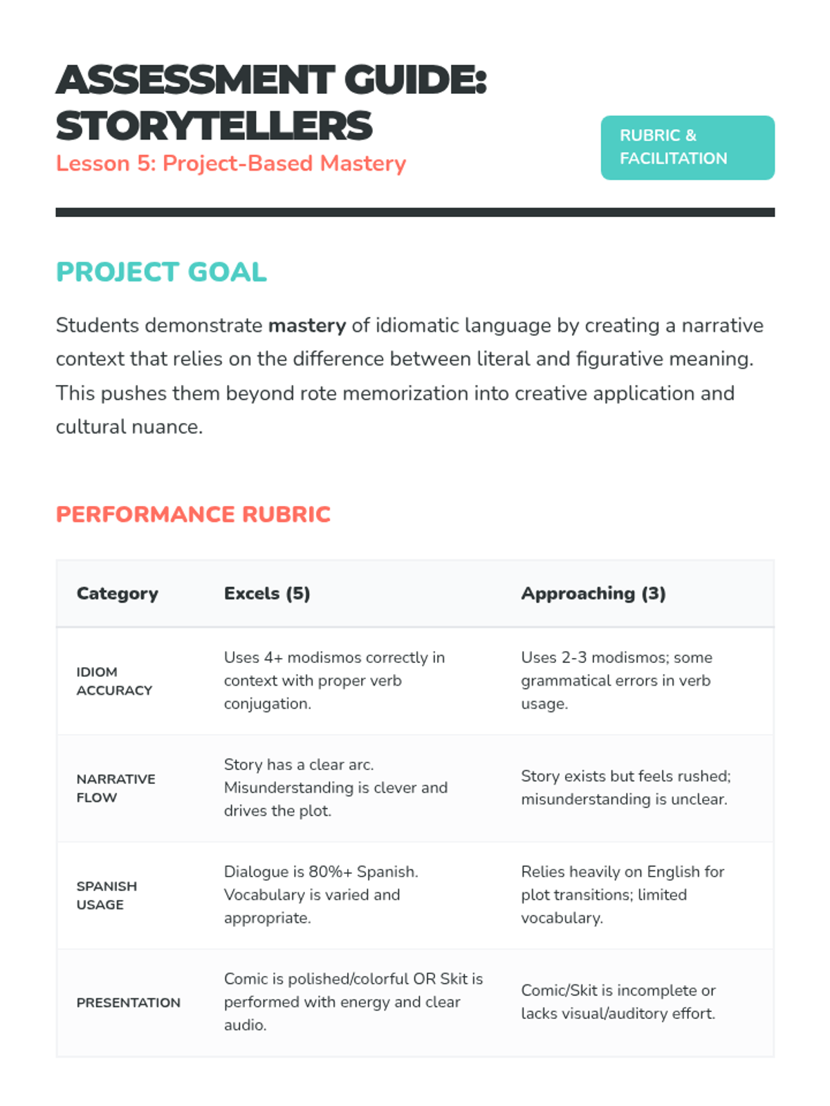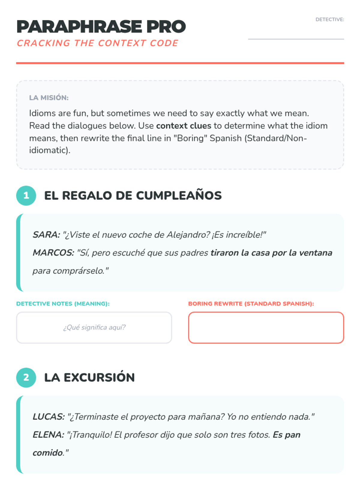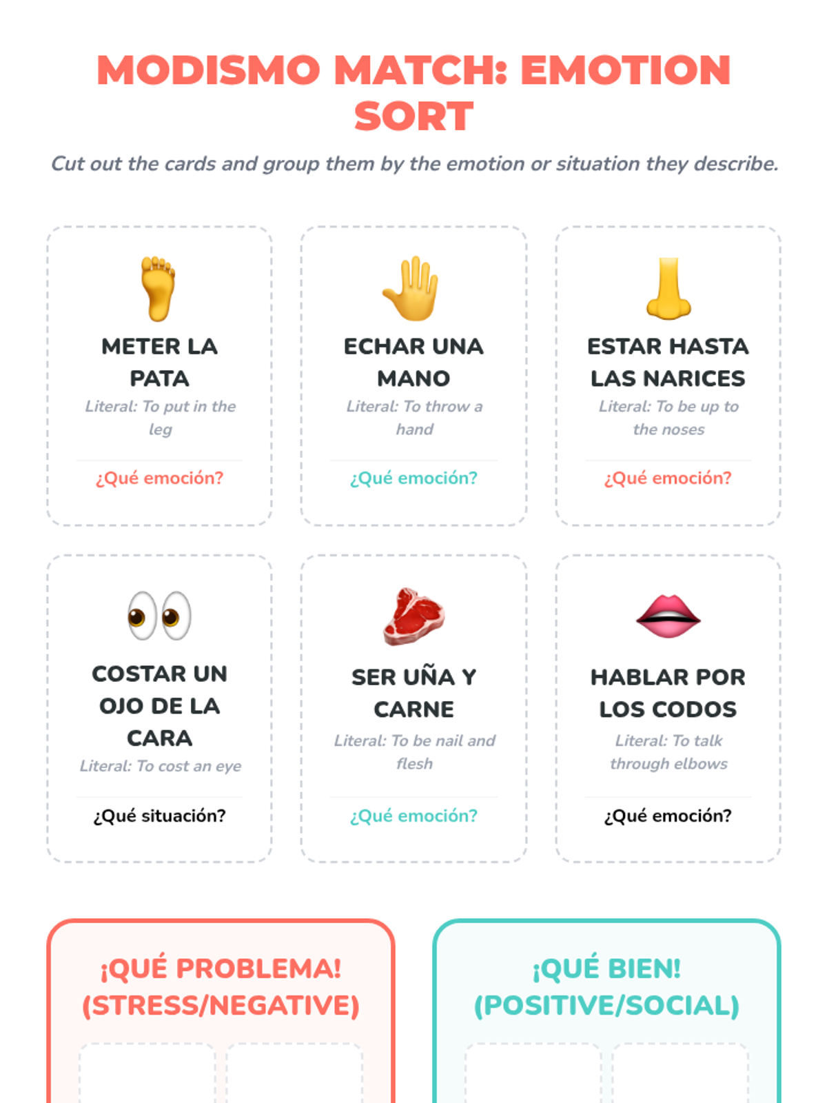 An intermediate Spanish sequence for 8th graders focused on decoding and using idiomatic expressions (modismos) to achieve cultural fluency. Students progress from distinguishing literal vs. figurative meanings to creating original narratives using culturally authentic language.