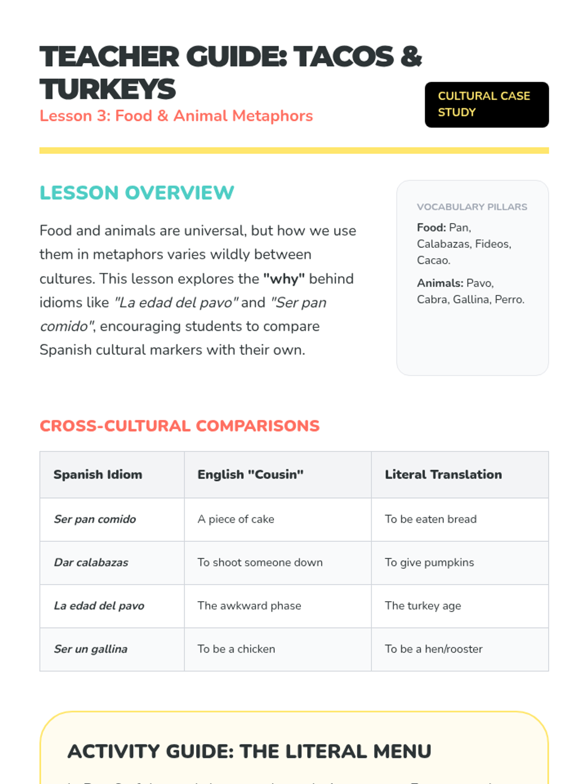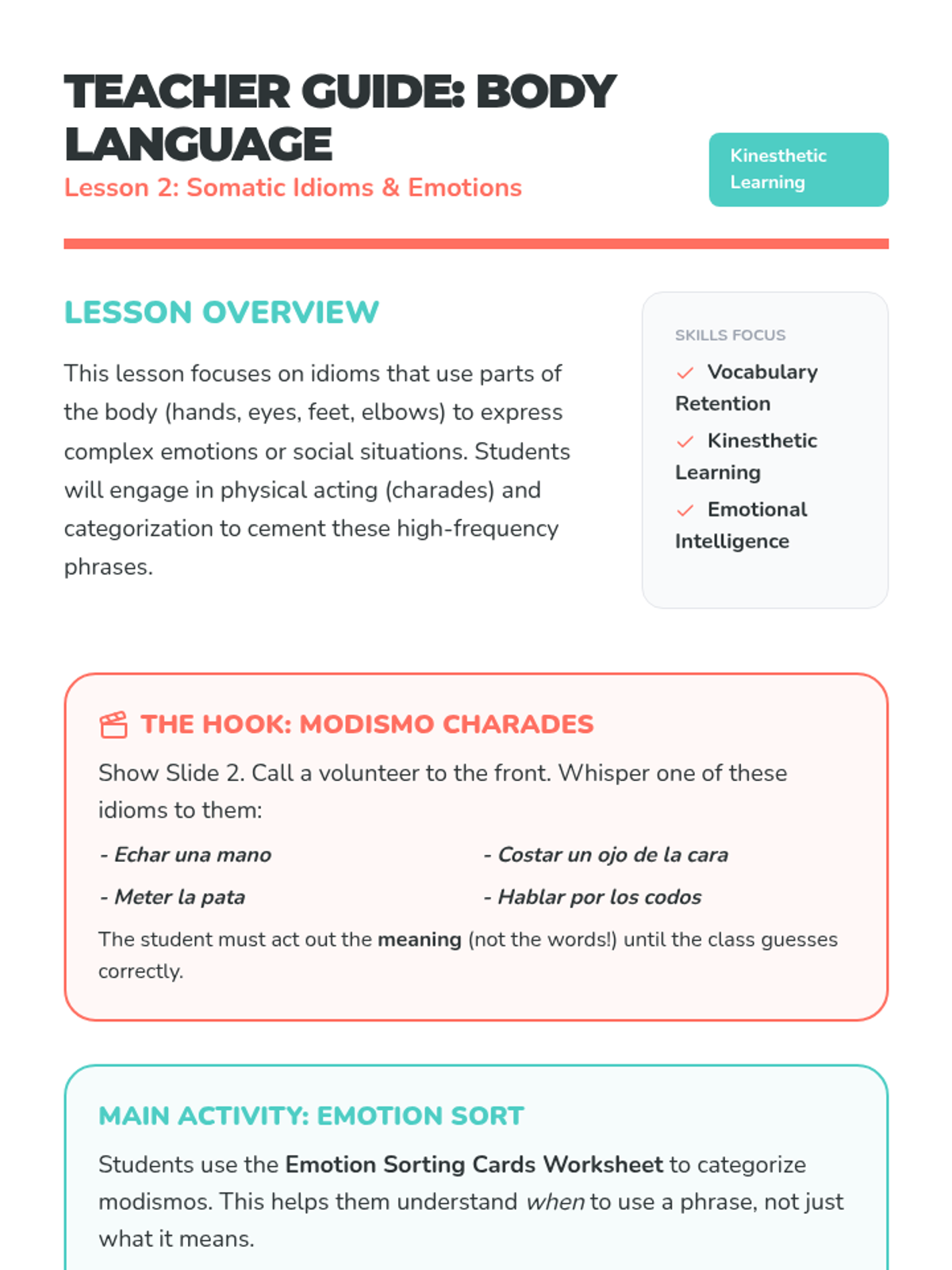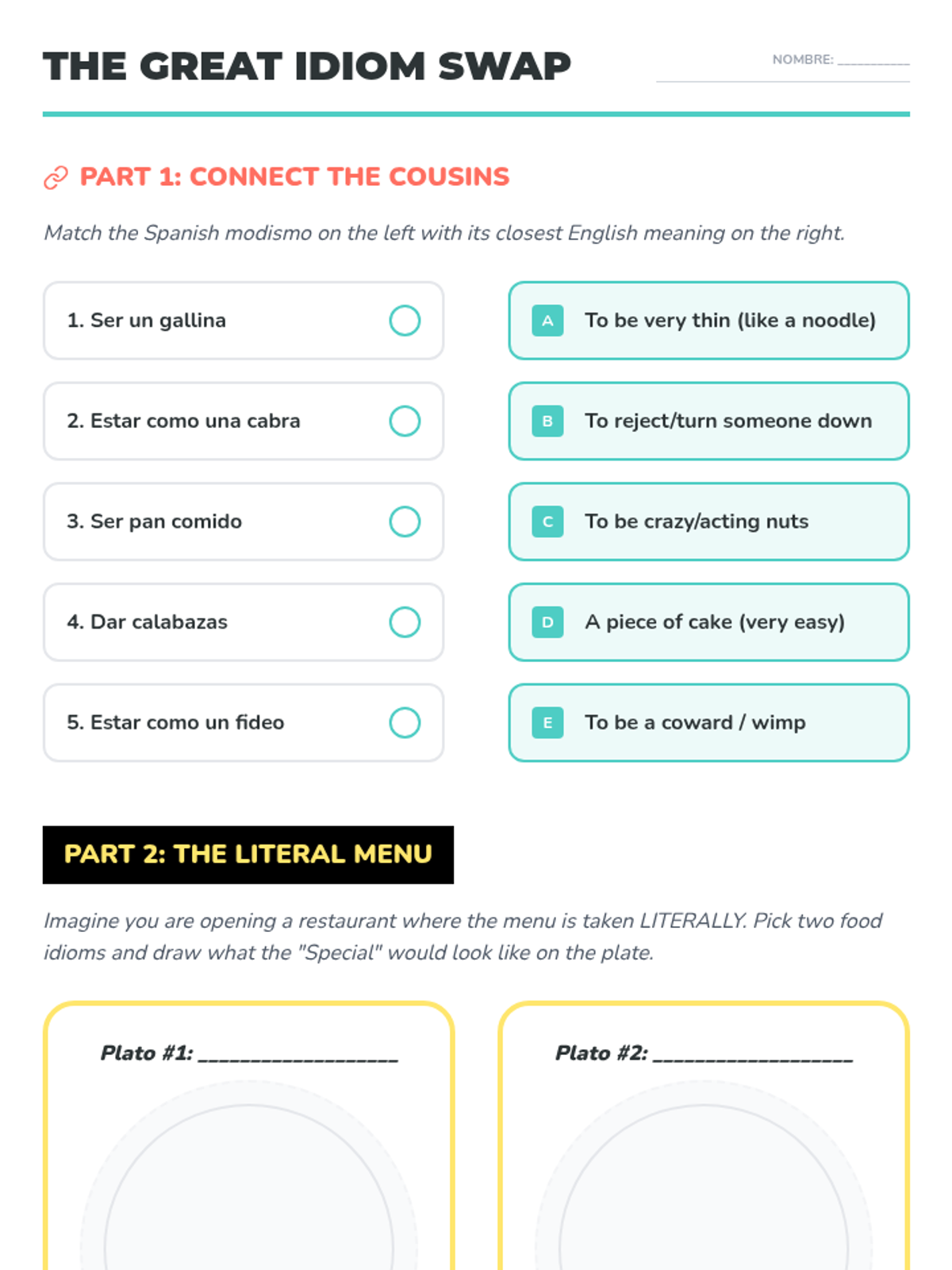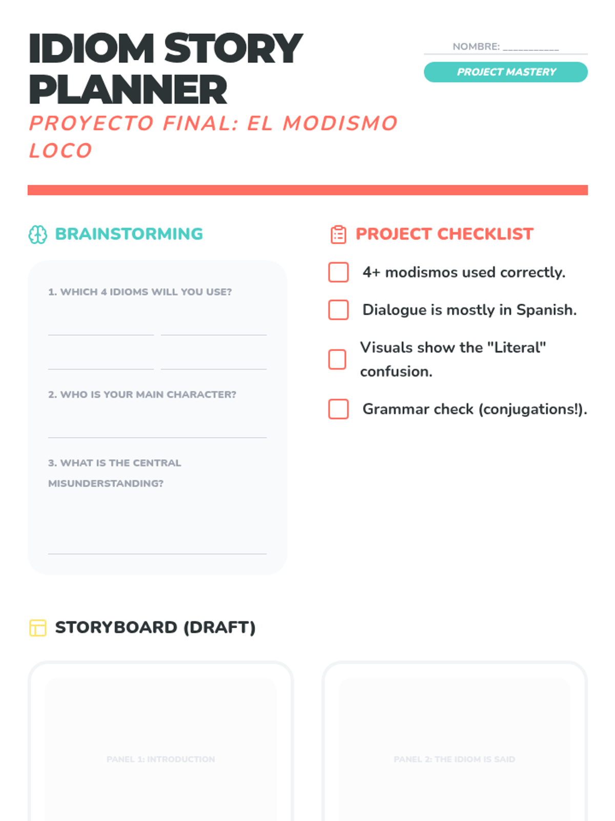 An intermediate Spanish sequence for 8th graders focused on decoding and using idiomatic expressions (modismos) to achieve cultural fluency. Students progress from distinguishing literal vs. figurative meanings to creating original narratives using culturally authentic language.