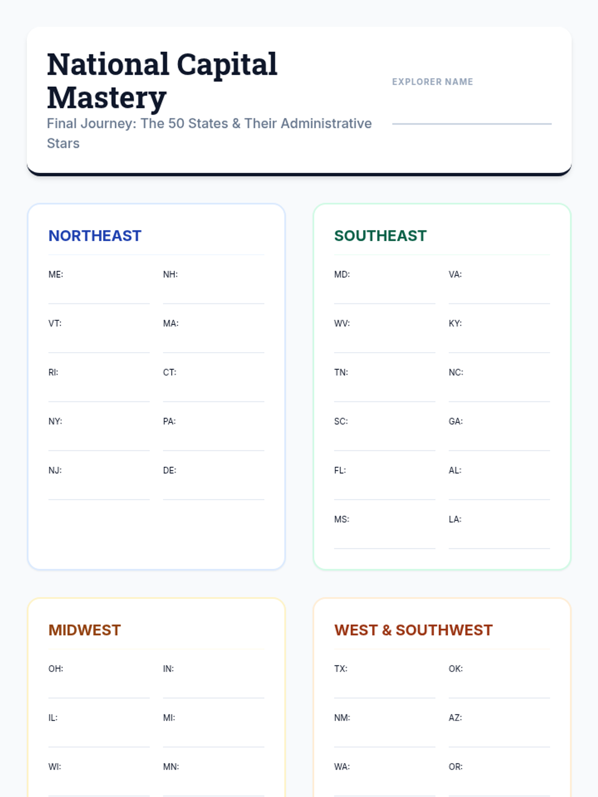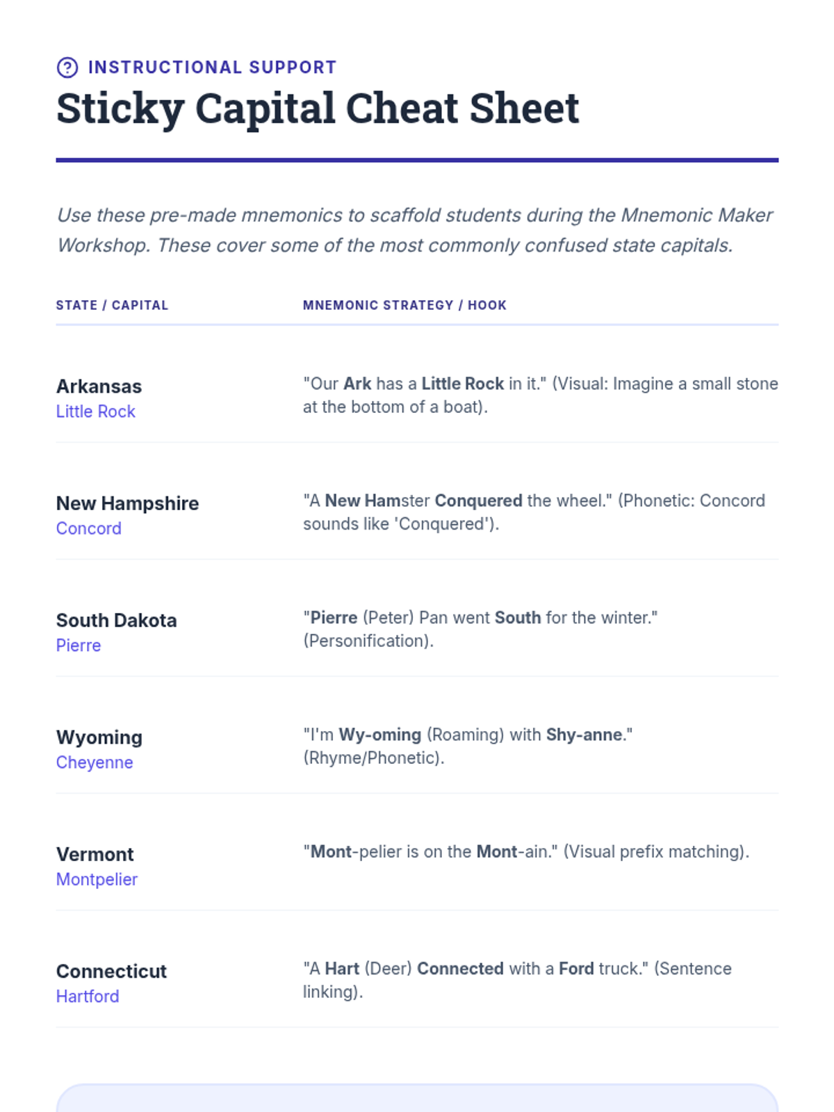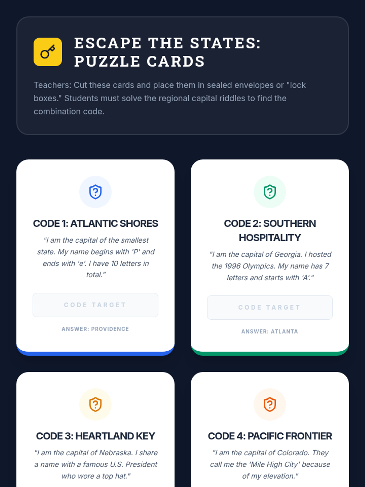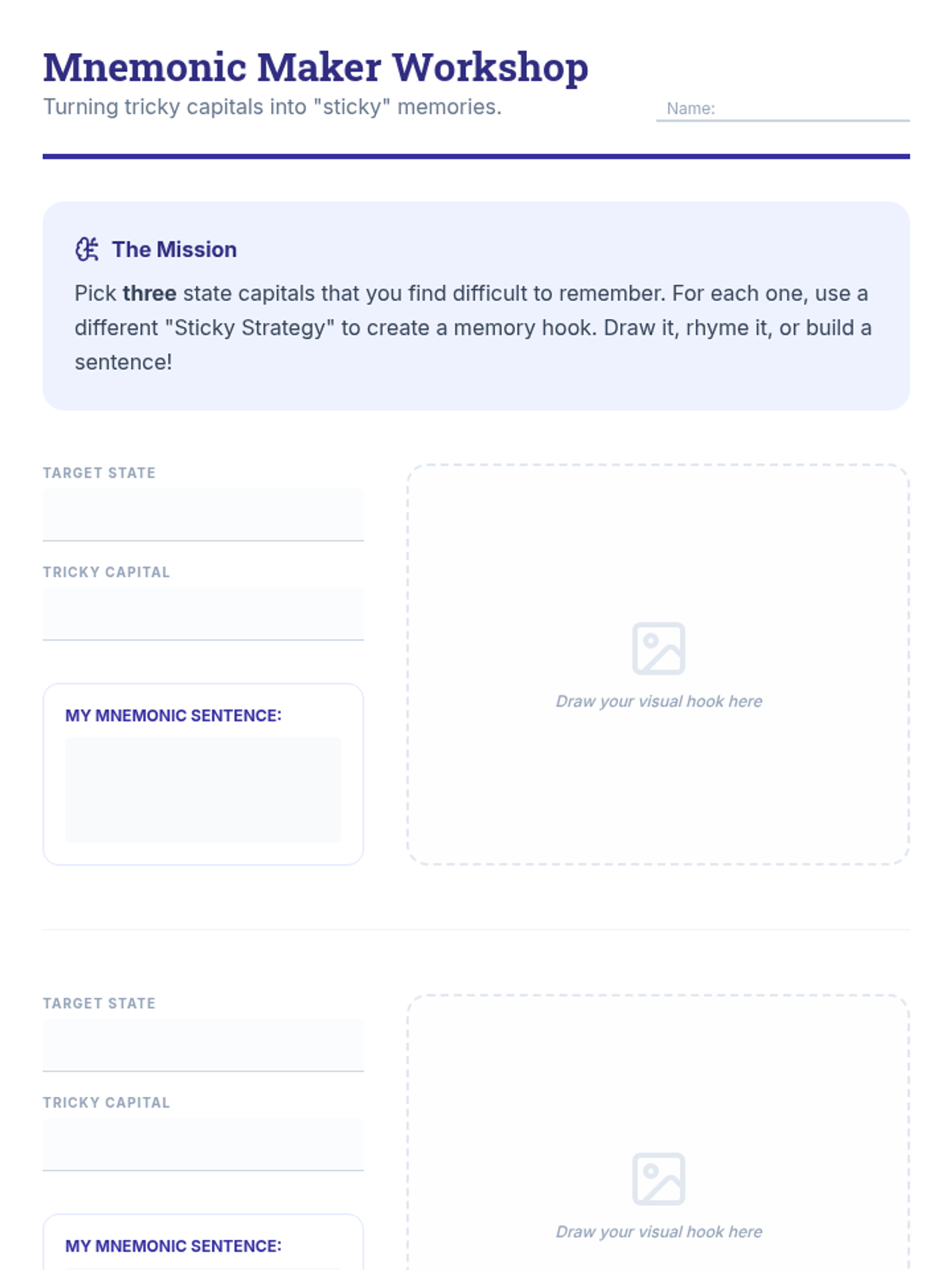 A comprehensive 5-lesson sequence designed to help 5th-grade students master U.S. state capitals through regional analysis, map skills, and creative mnemonic strategies. Students travel across the regions of the United States, building spatial awareness and retention through gamified challenges and structured workshops.