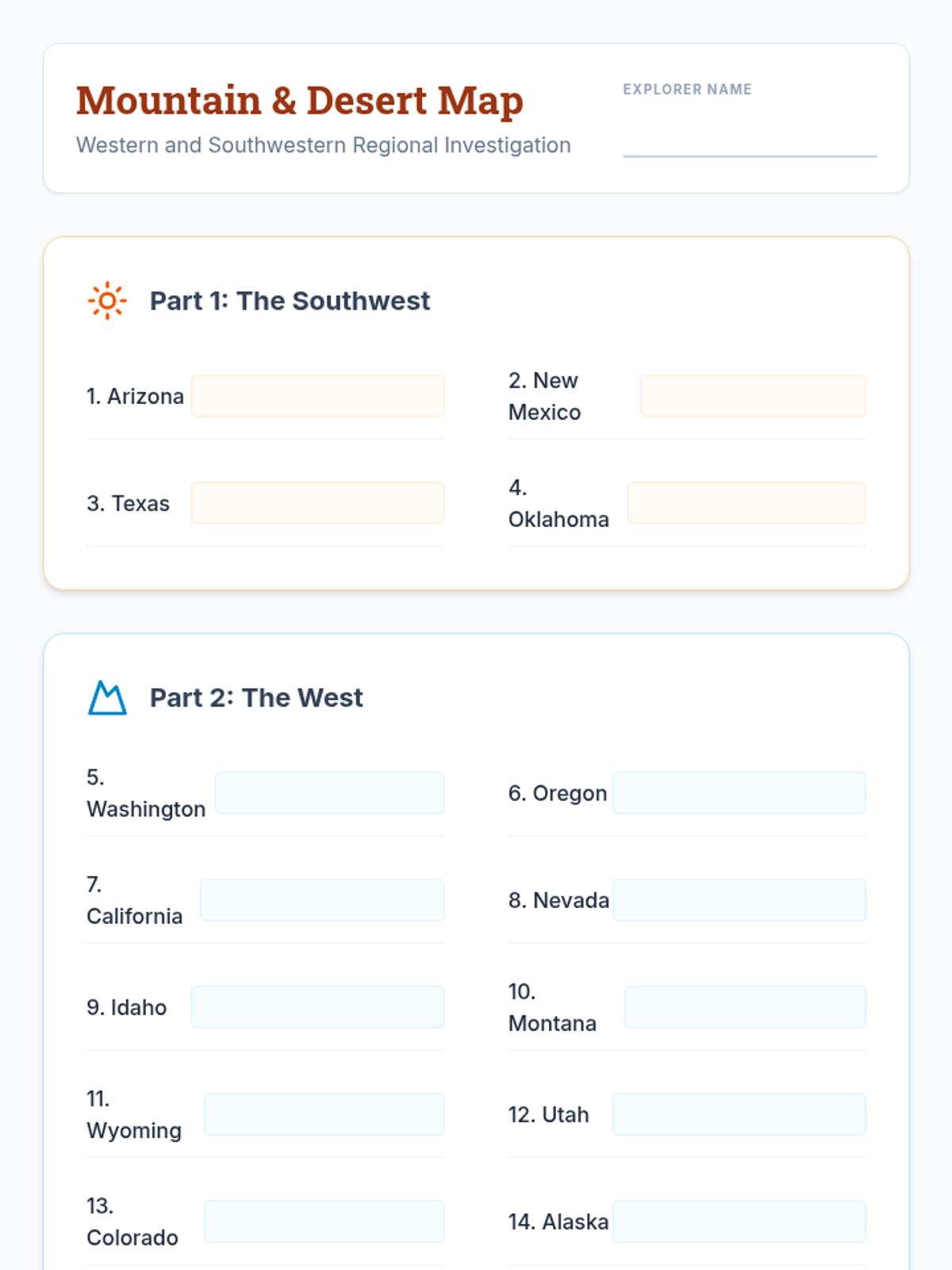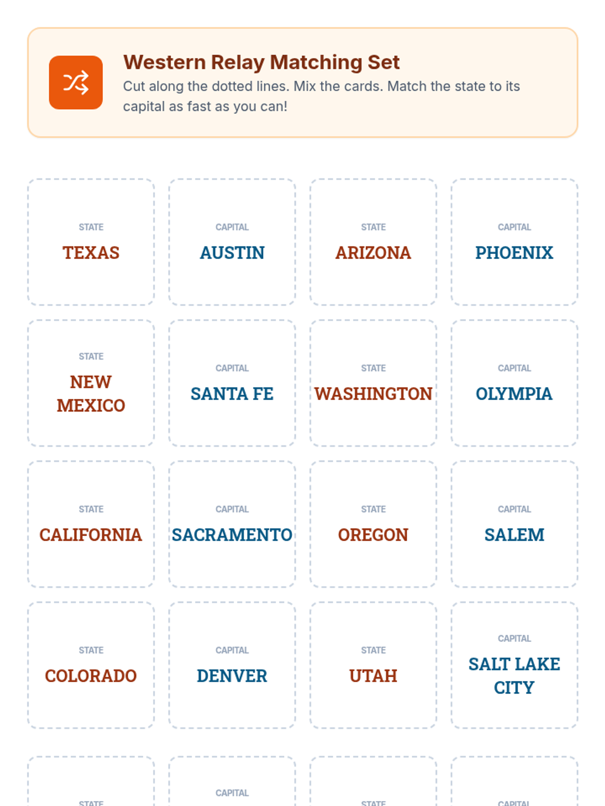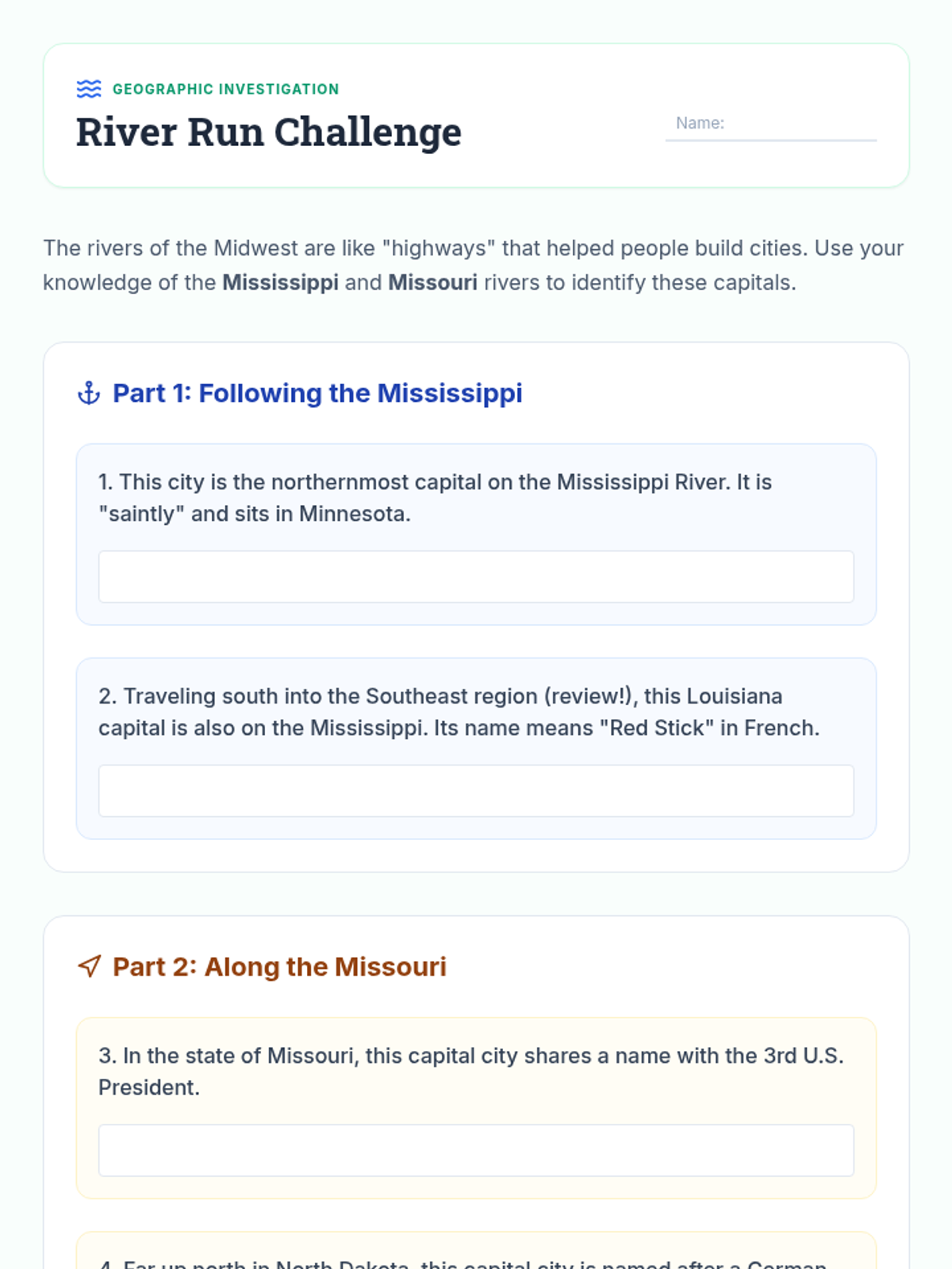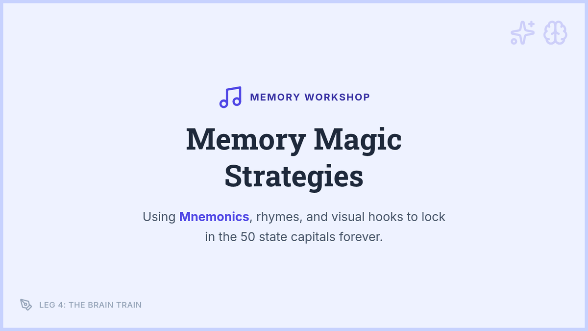 A comprehensive 5-lesson sequence designed to help 5th-grade students master U.S. state capitals through regional analysis, map skills, and creative mnemonic strategies. Students travel across the regions of the United States, building spatial awareness and retention through gamified challenges and structured workshops.