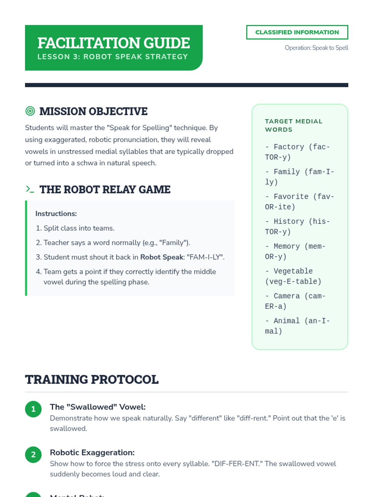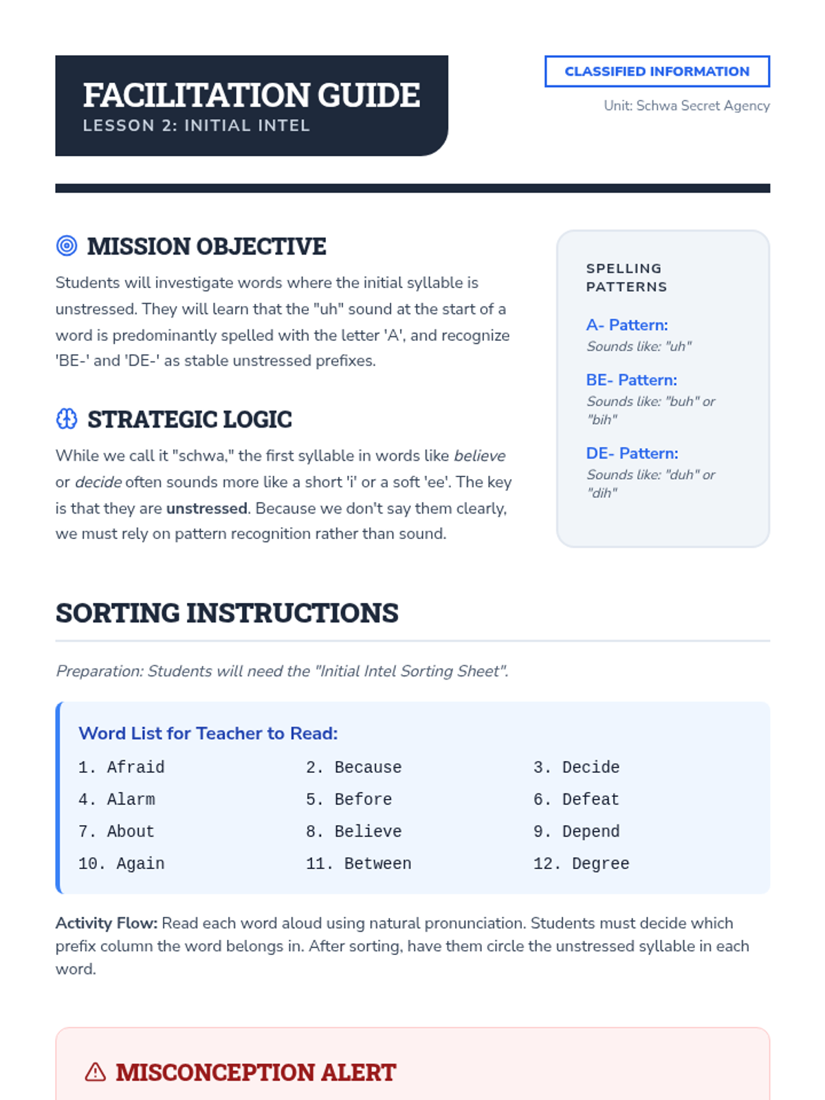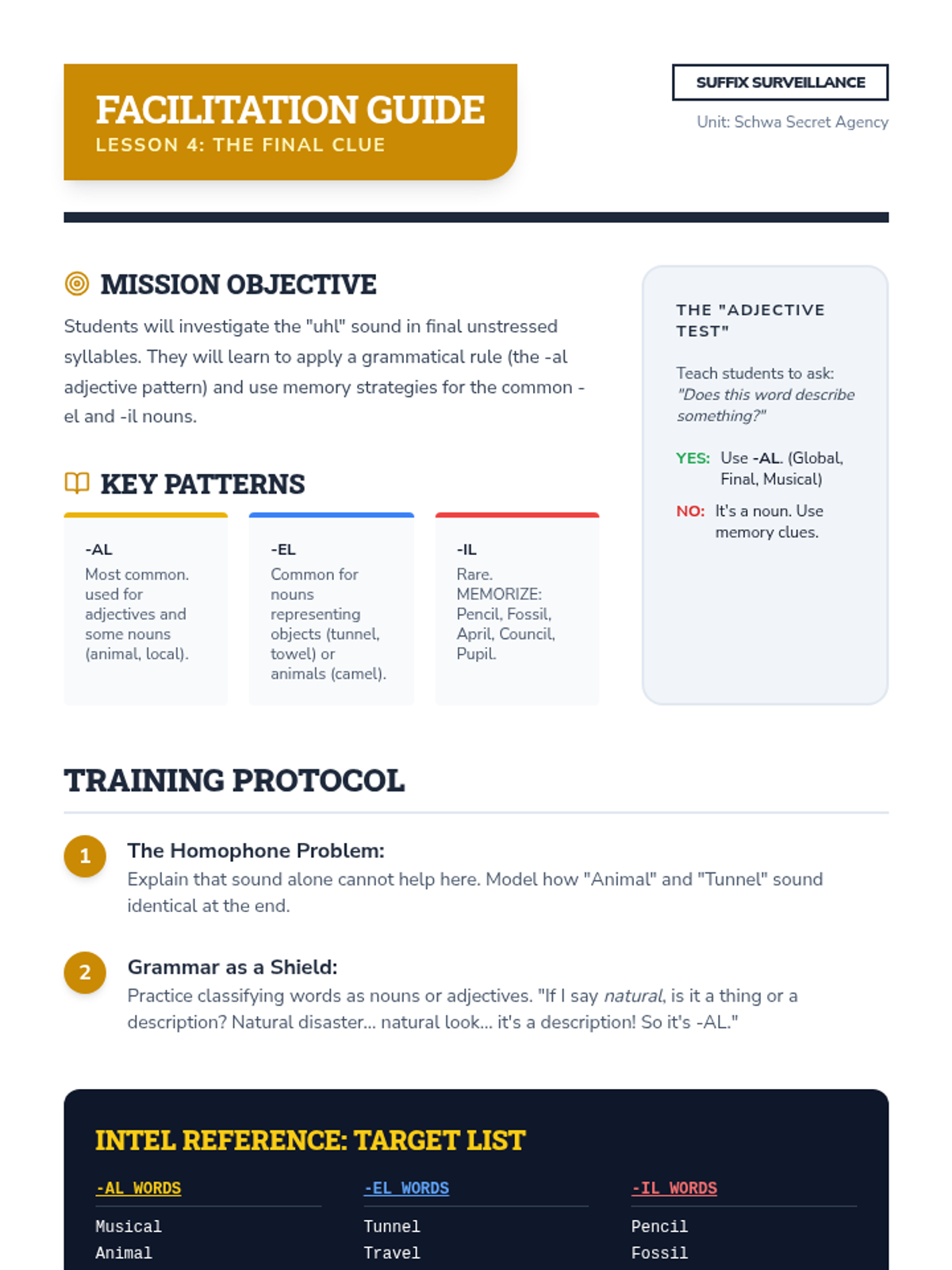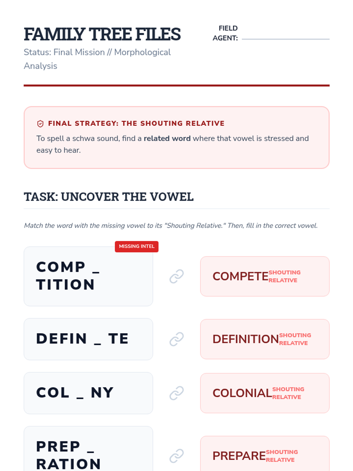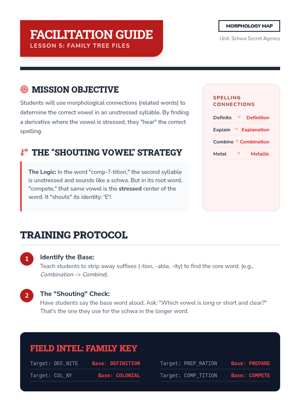 A 5th-grade spelling sequence focused on mastering the schwa sound and unstressed syllables through detective-themed strategies and morphological connections.