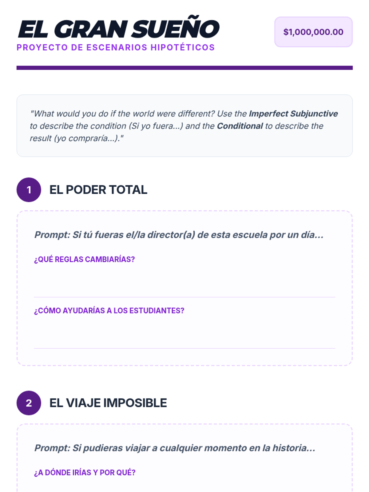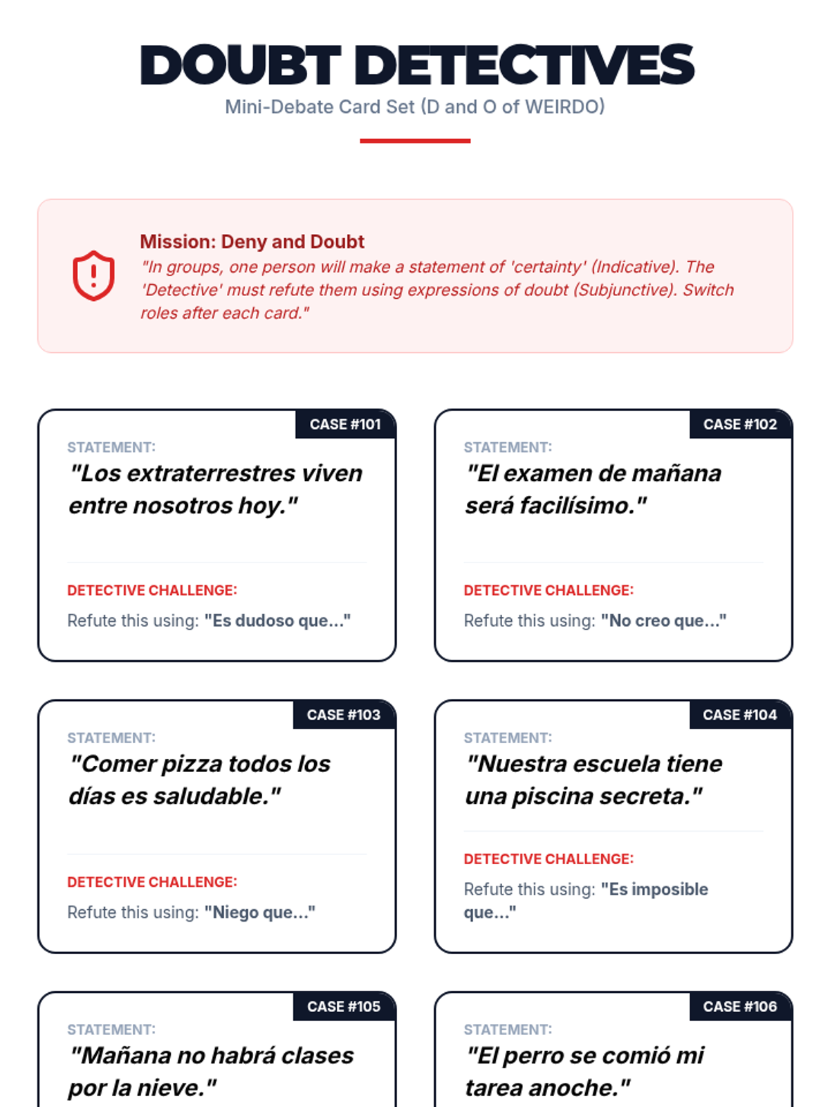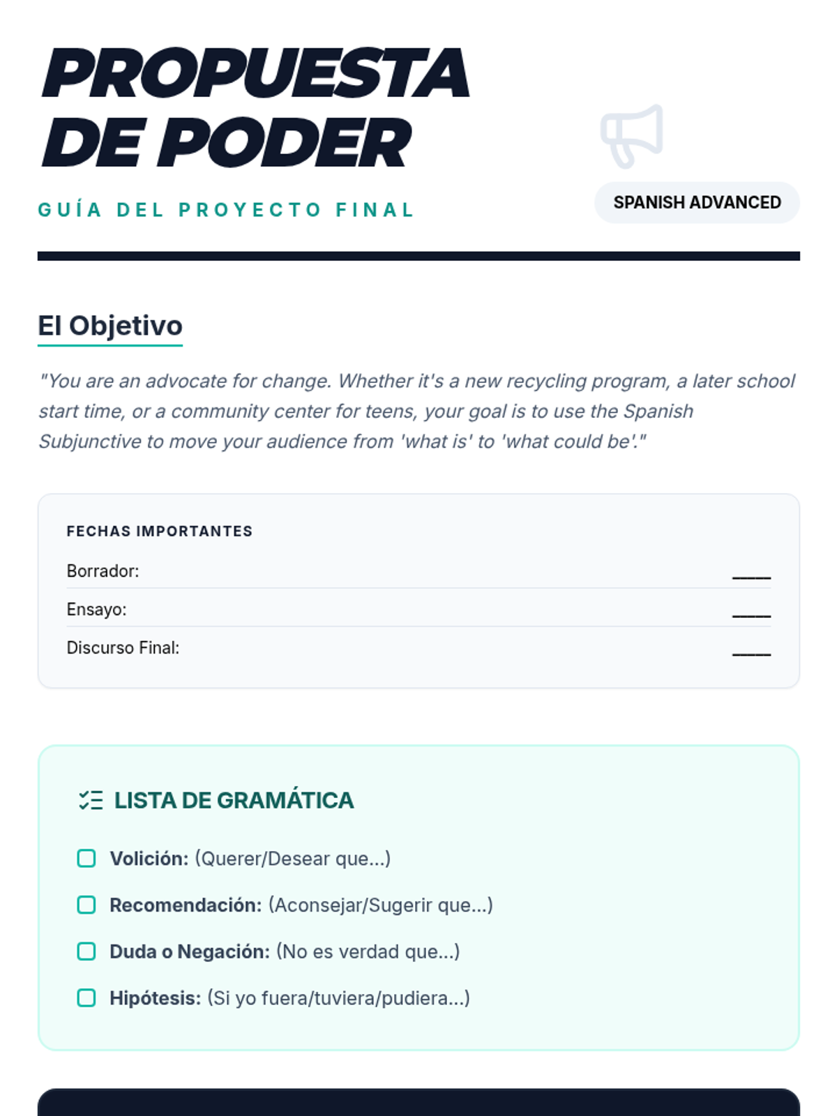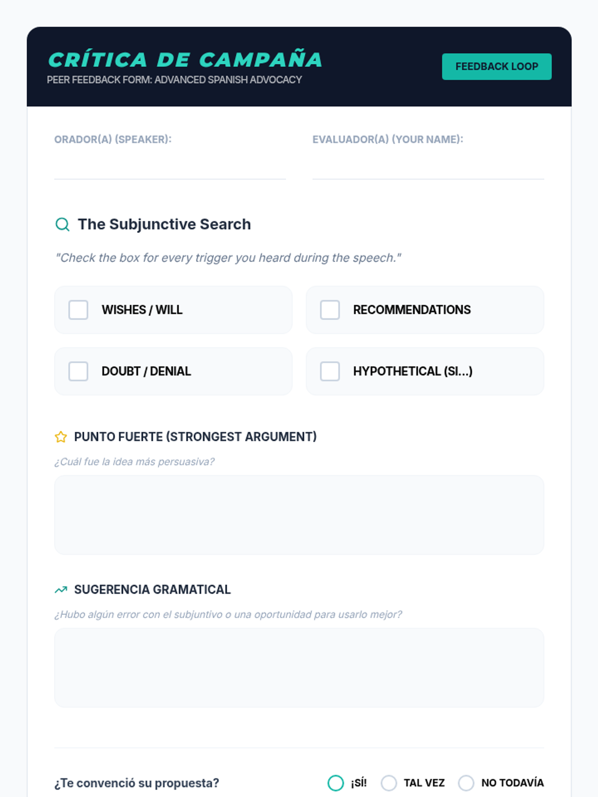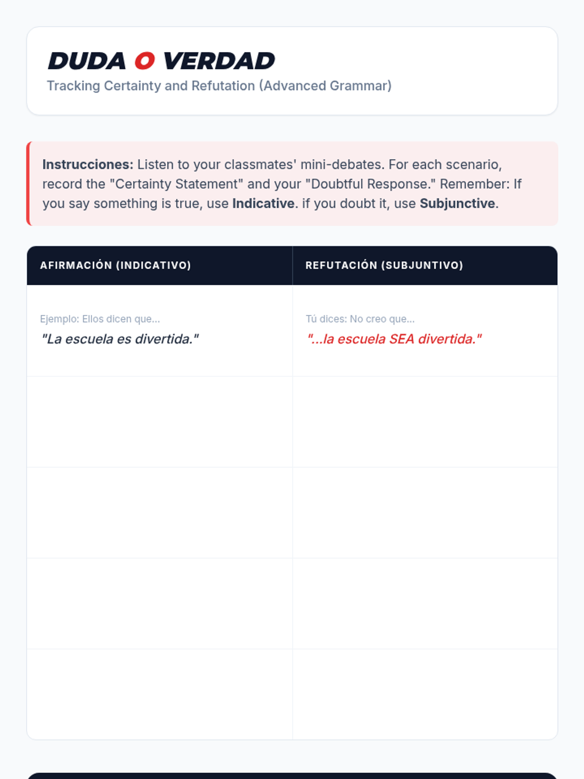 A comprehensive immersion into the Spanish subjunctive mood, focusing on how speaker attitude and perspective shift grammatical choices. Students progress from distinguishing certainty from uncertainty to advocating for community change using complex persuasive syntax.