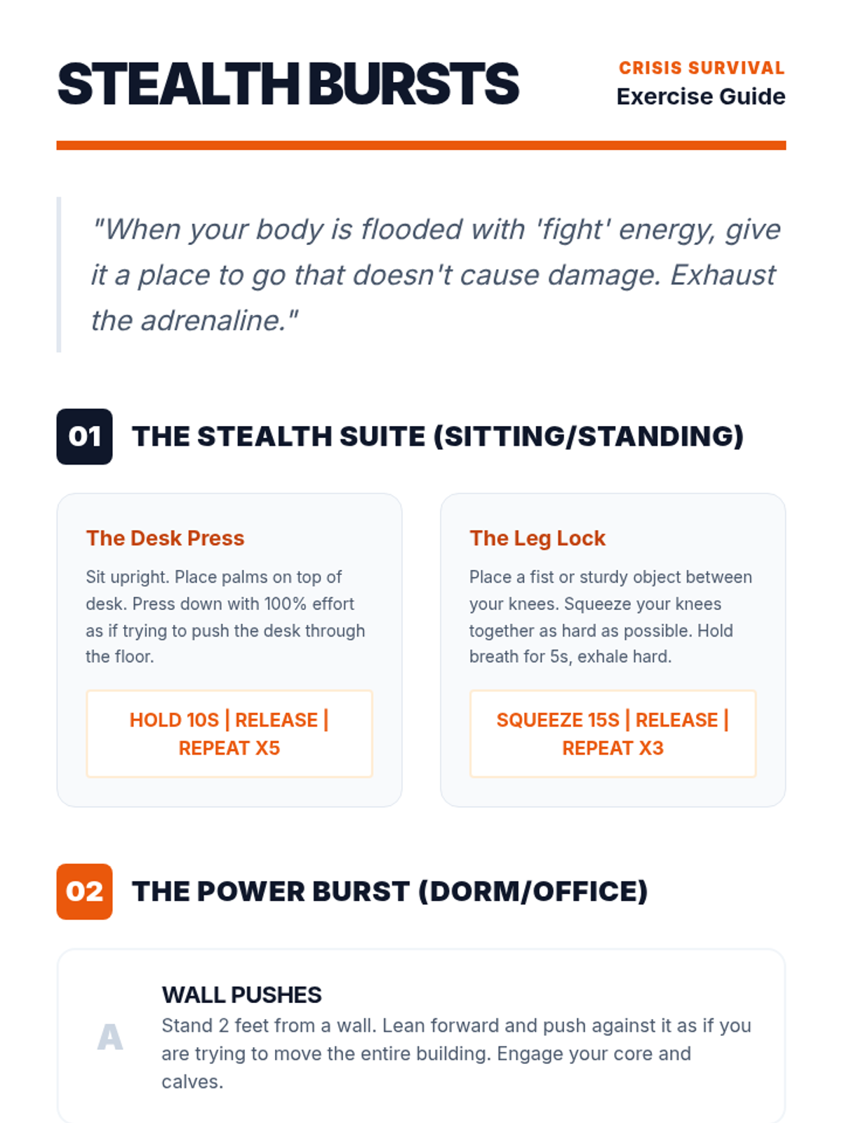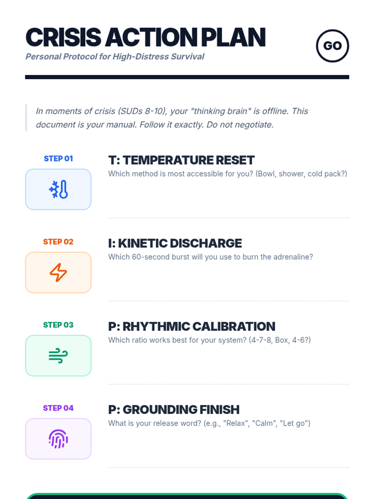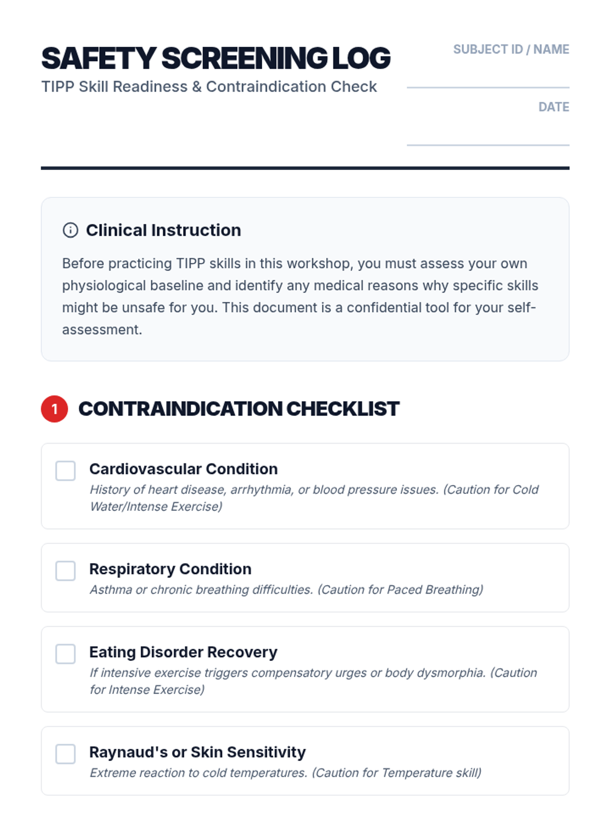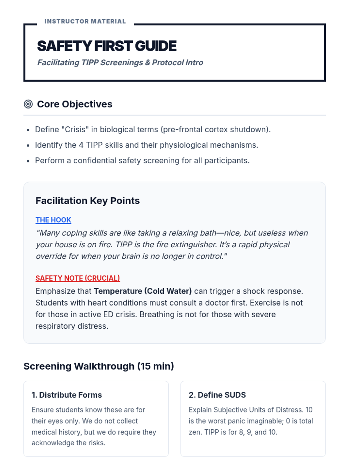 An experiential workshop sequence for undergraduate students to master TIPP skills for crisis survival. This sequence moves from safety assessment to practical execution of temperature, exercise, breathing, and muscle relaxation techniques.