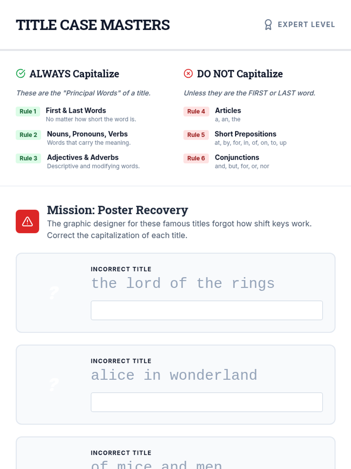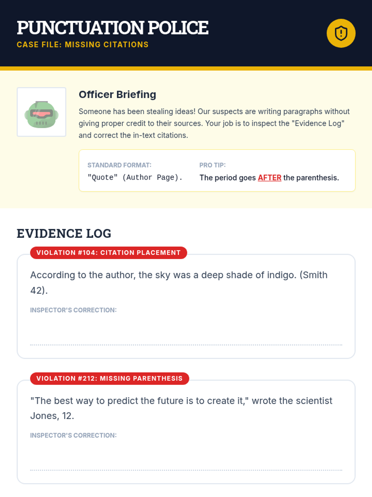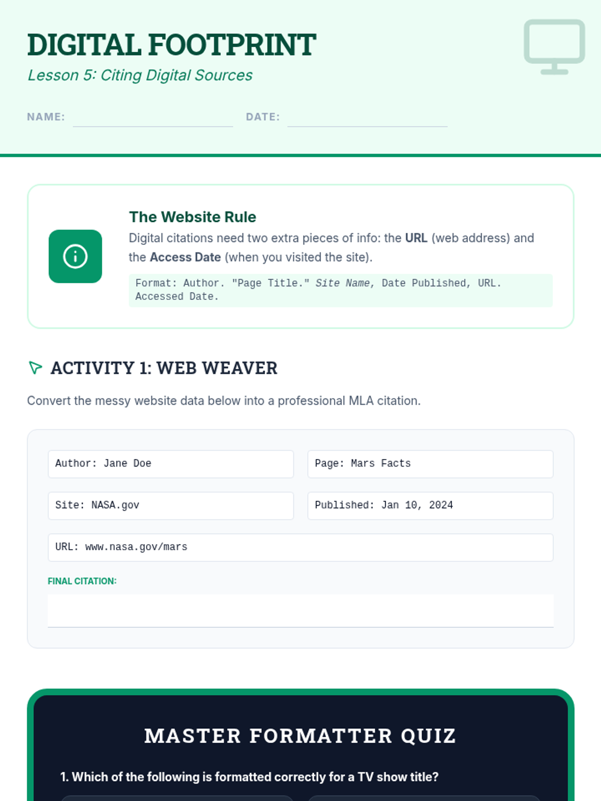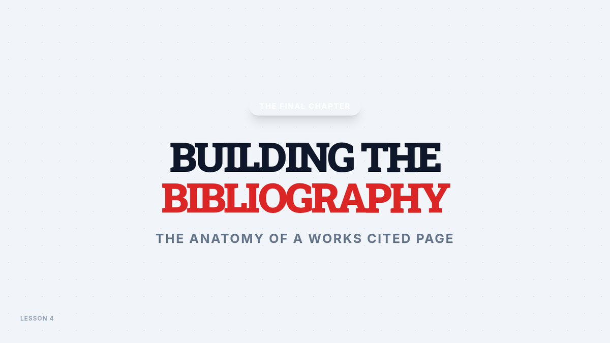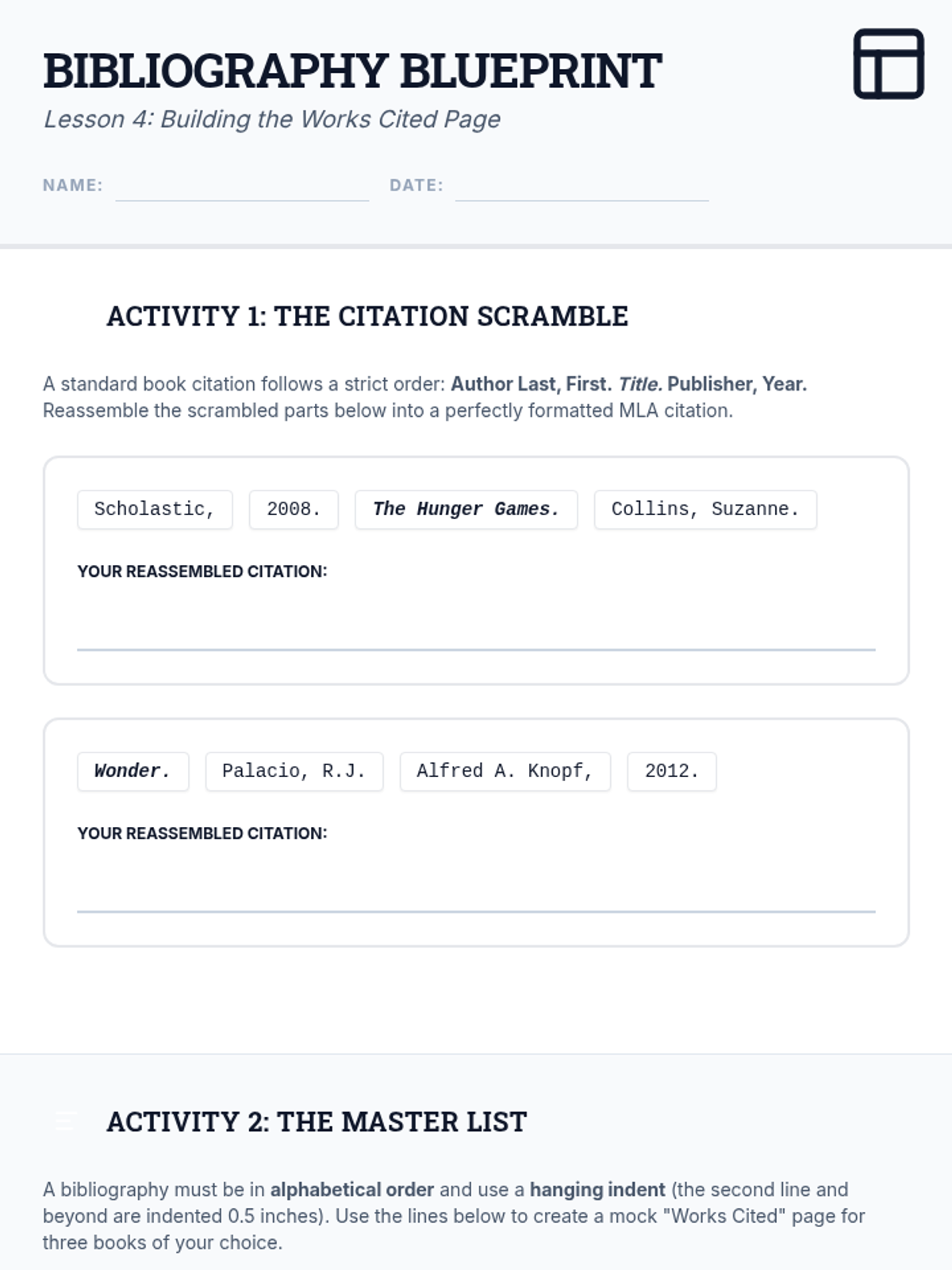 A comprehensive unit for 7th-grade students on the mechanics of formatting titles, in-text citations, and bibliographies. Students move from basic title punctuation to building a full Works Cited page using modern standards.