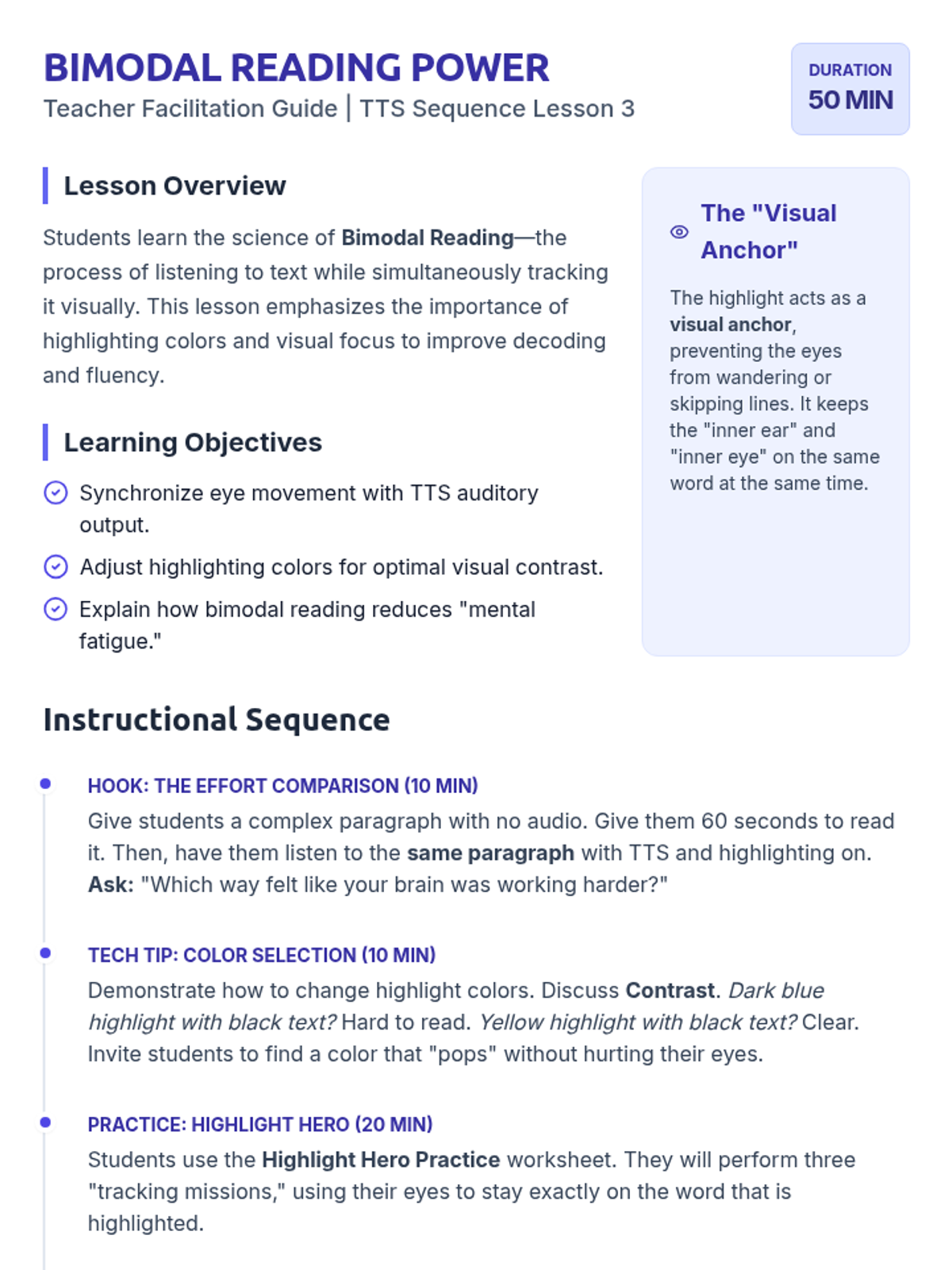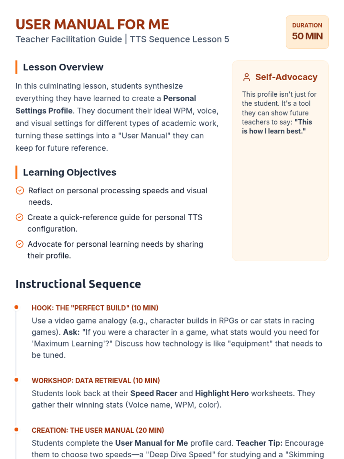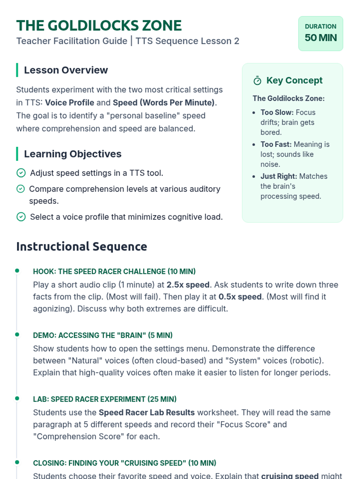 A comprehensive sequence for 7th-grade students to master text-to-speech (TTS) technology. Students progress from basic interface navigation to advanced customization and troubleshooting, ultimately creating a personalized settings profile for optimal learning.